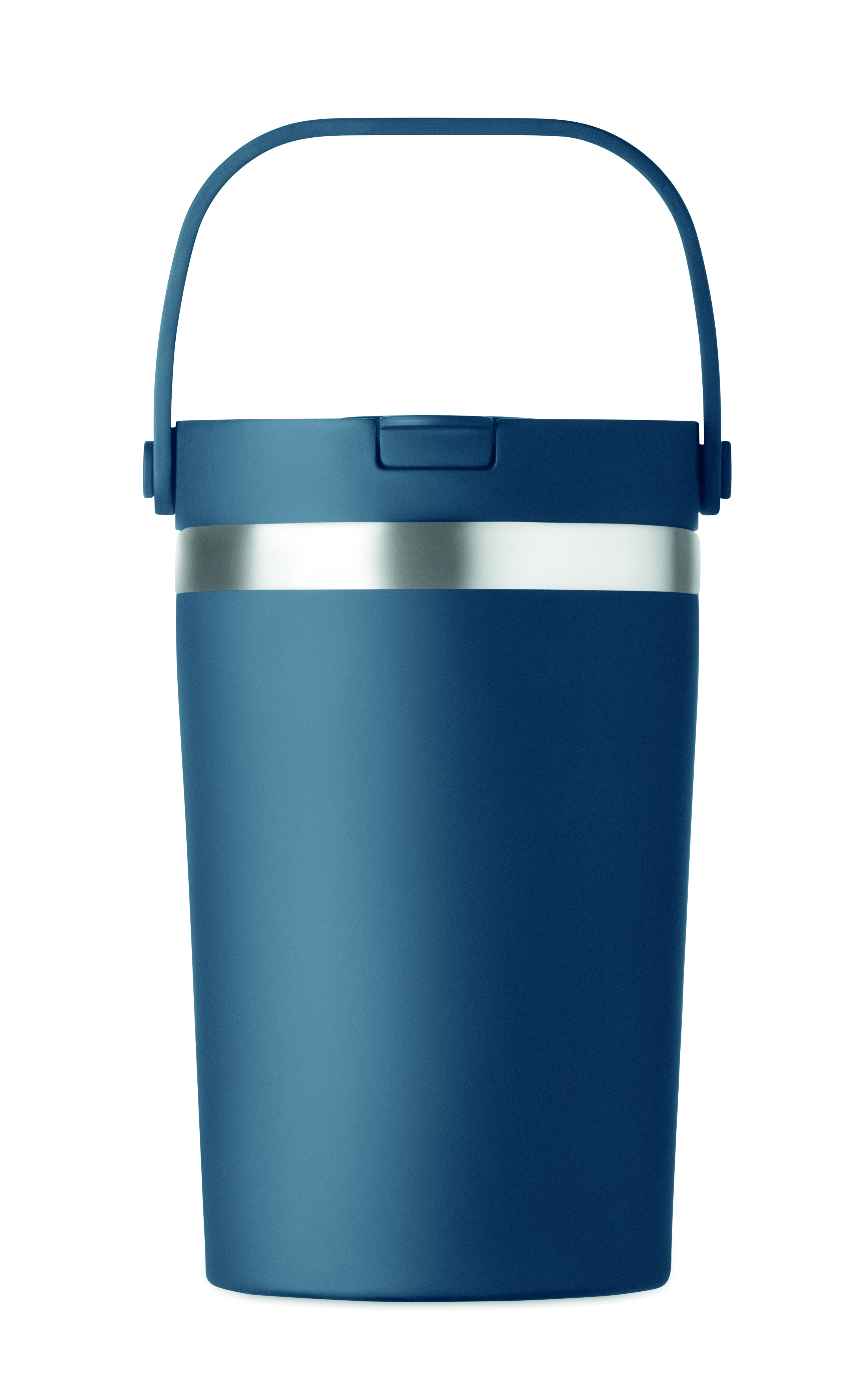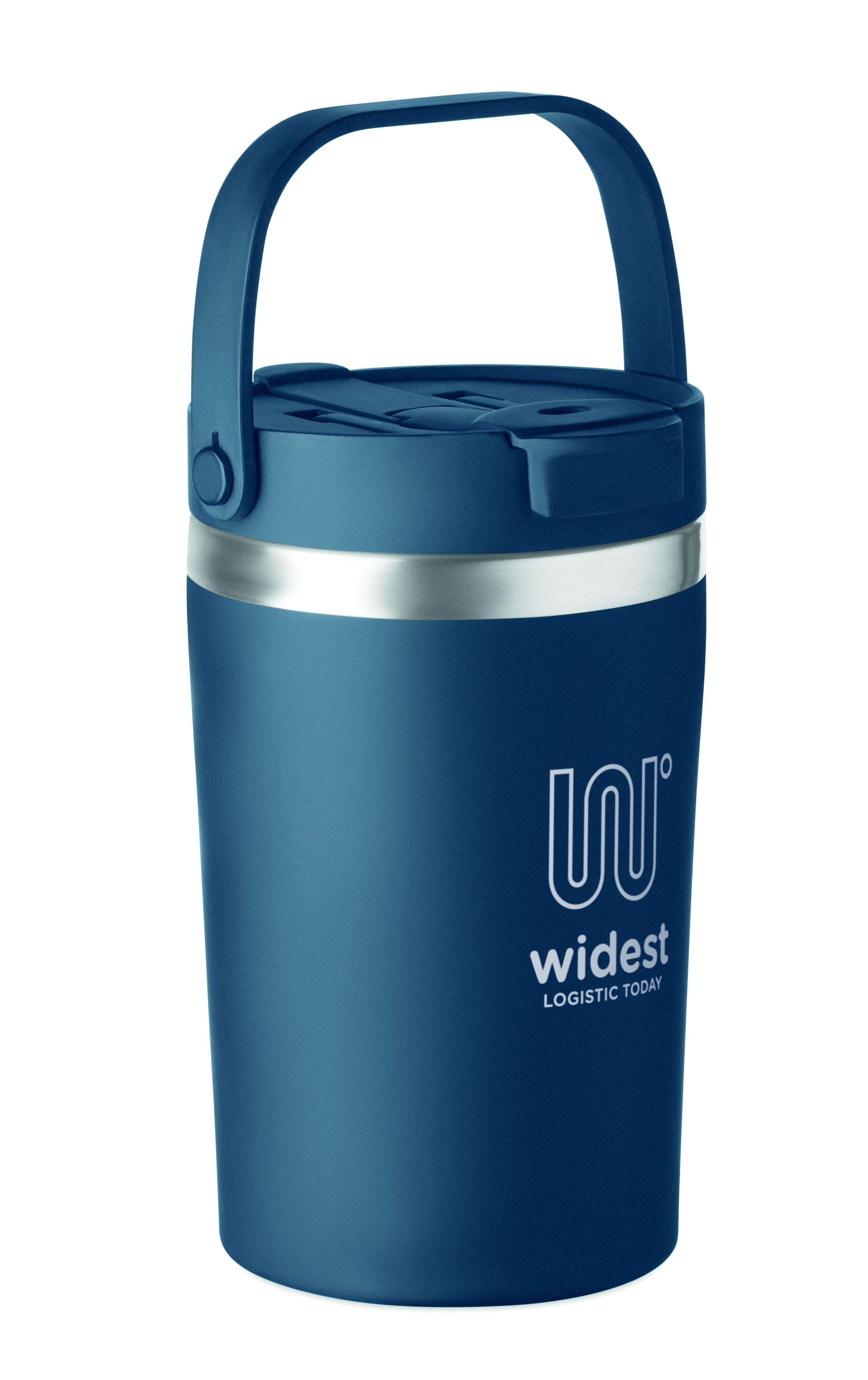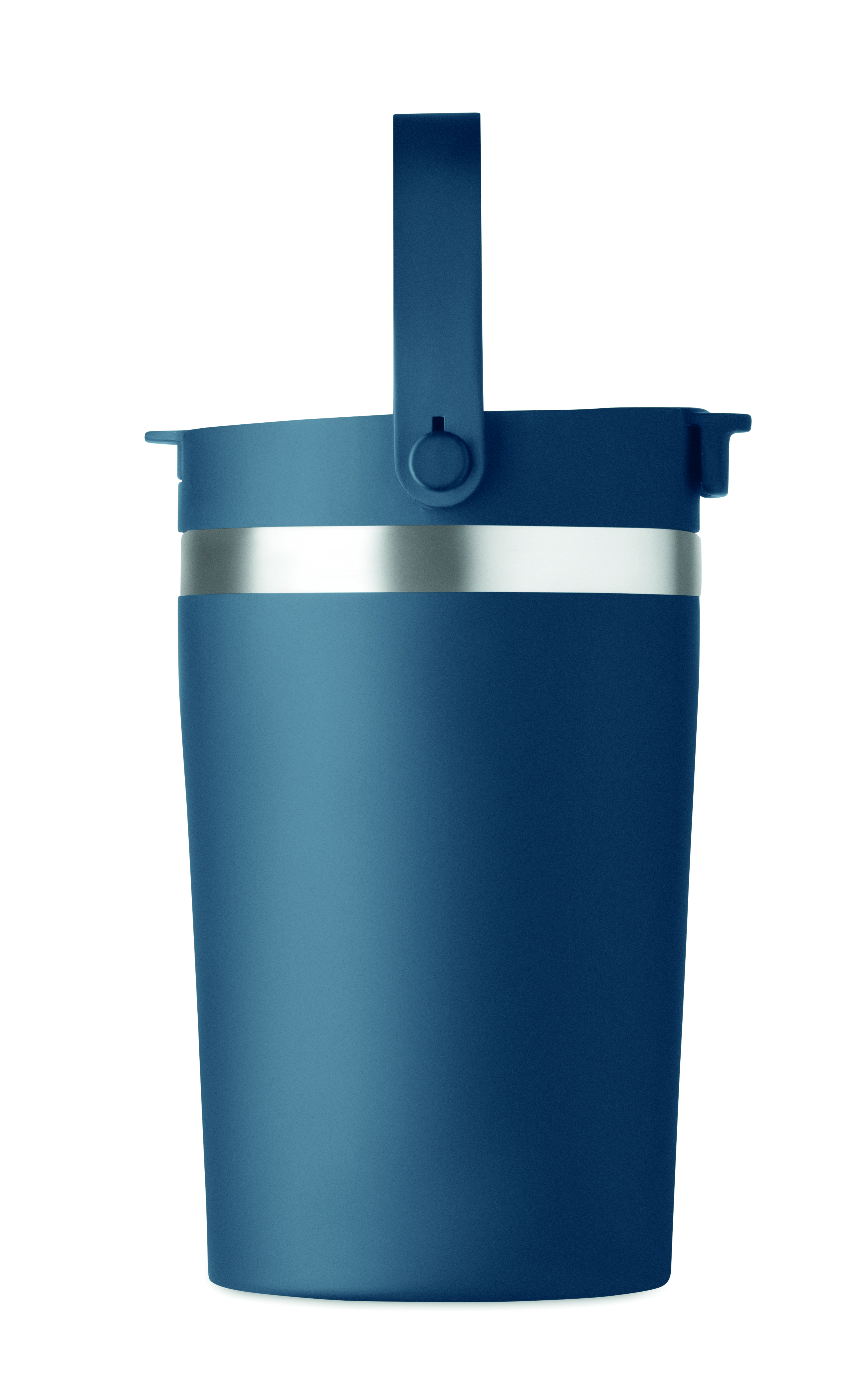 Dwuścienny kubek ze stali nierdzewnej (90% stal nierdzewna z recyklingu i 10% stal nierdzewna) z pokrywką z PP 2 w 1 i słomką oraz paskiem z RPET. Nie przecieka i jest wytrzymały. Pojemność: 350 ml.