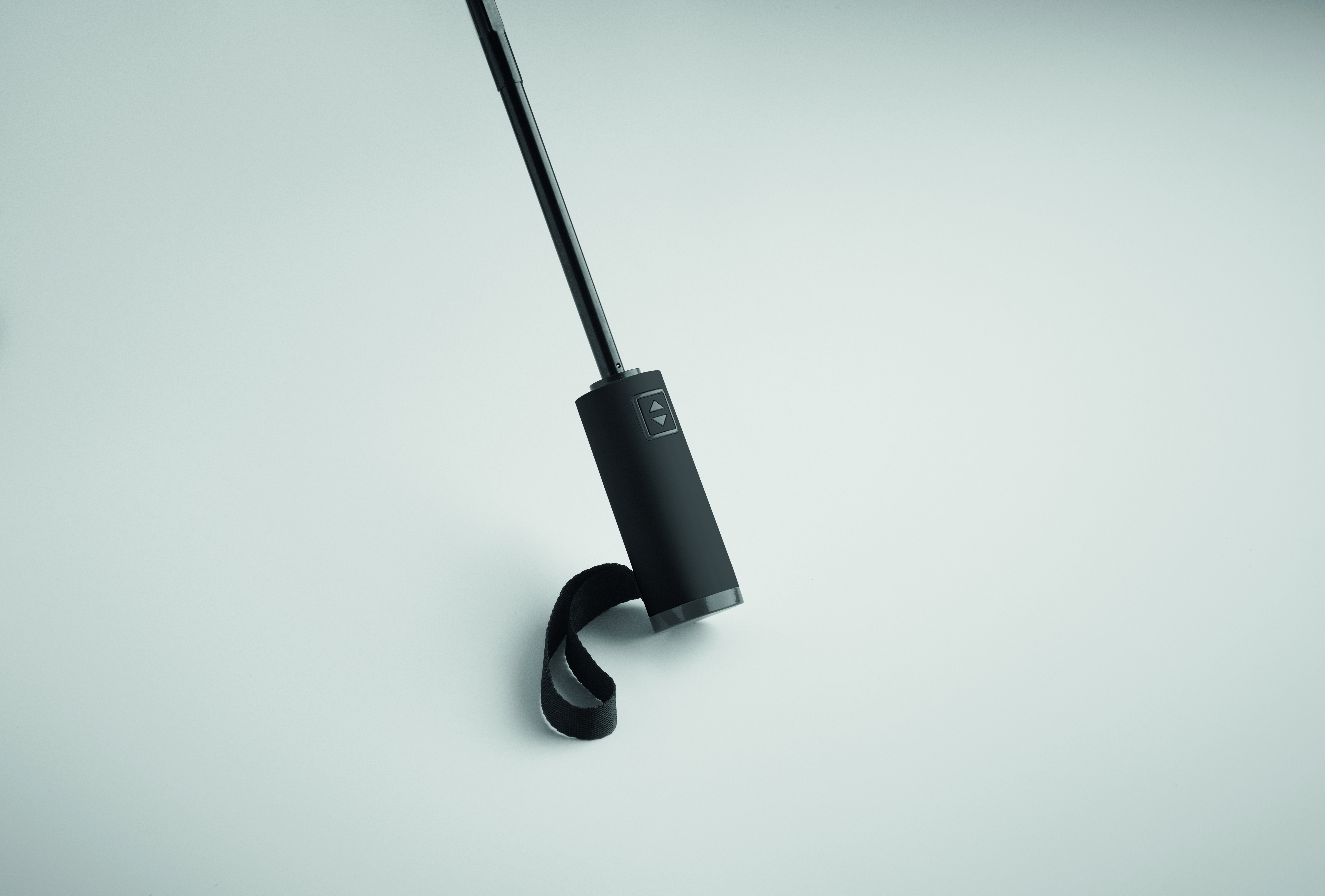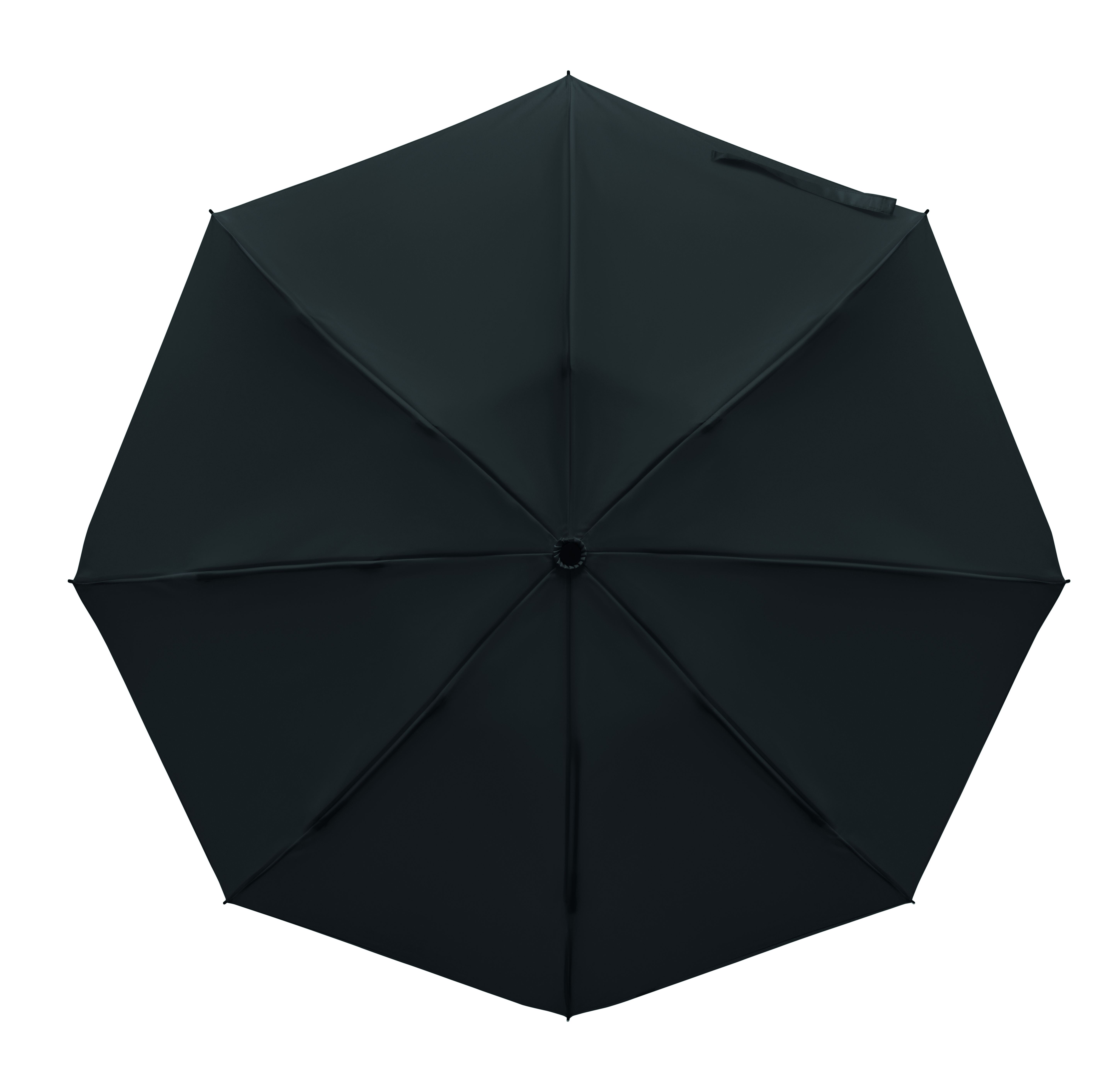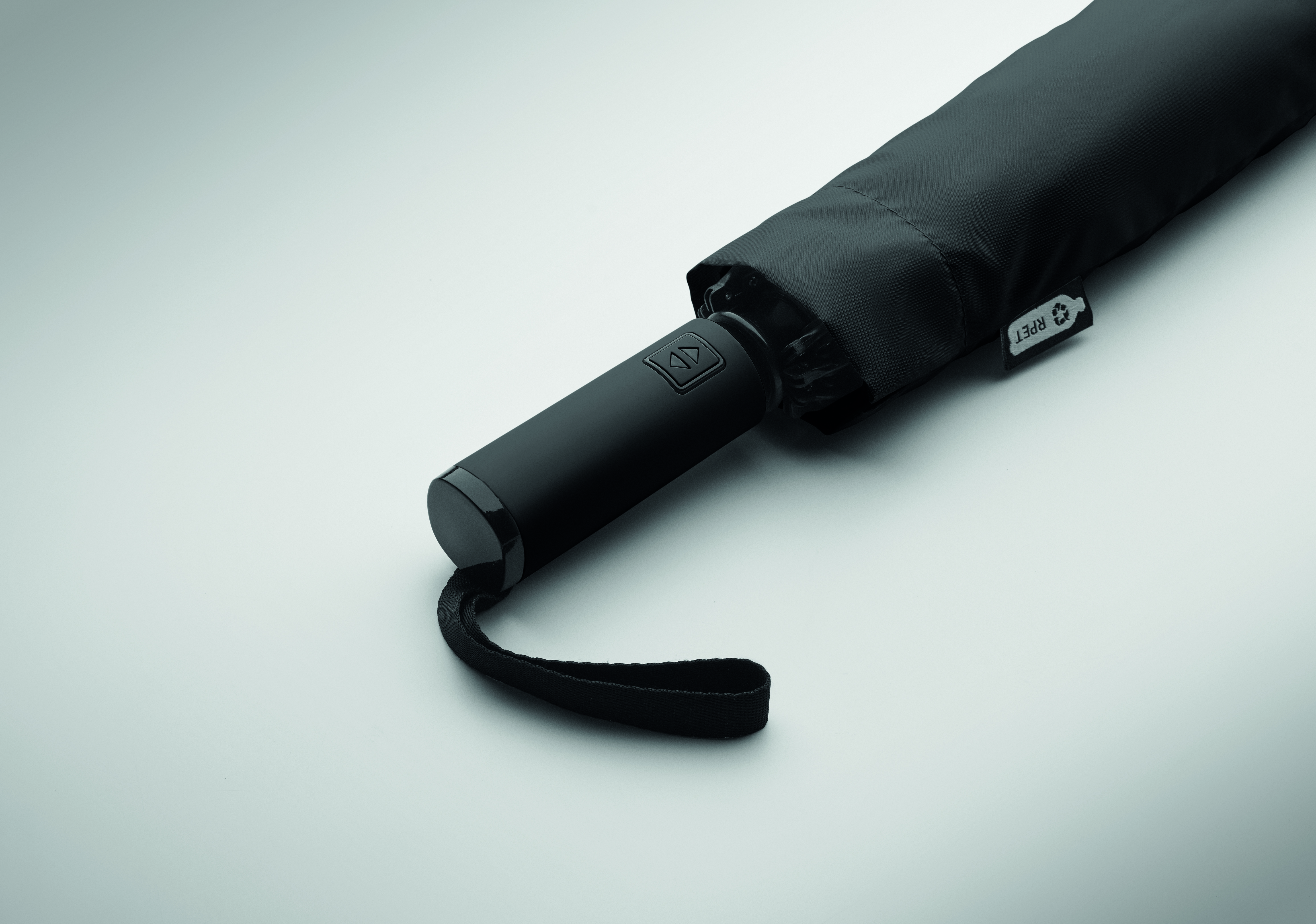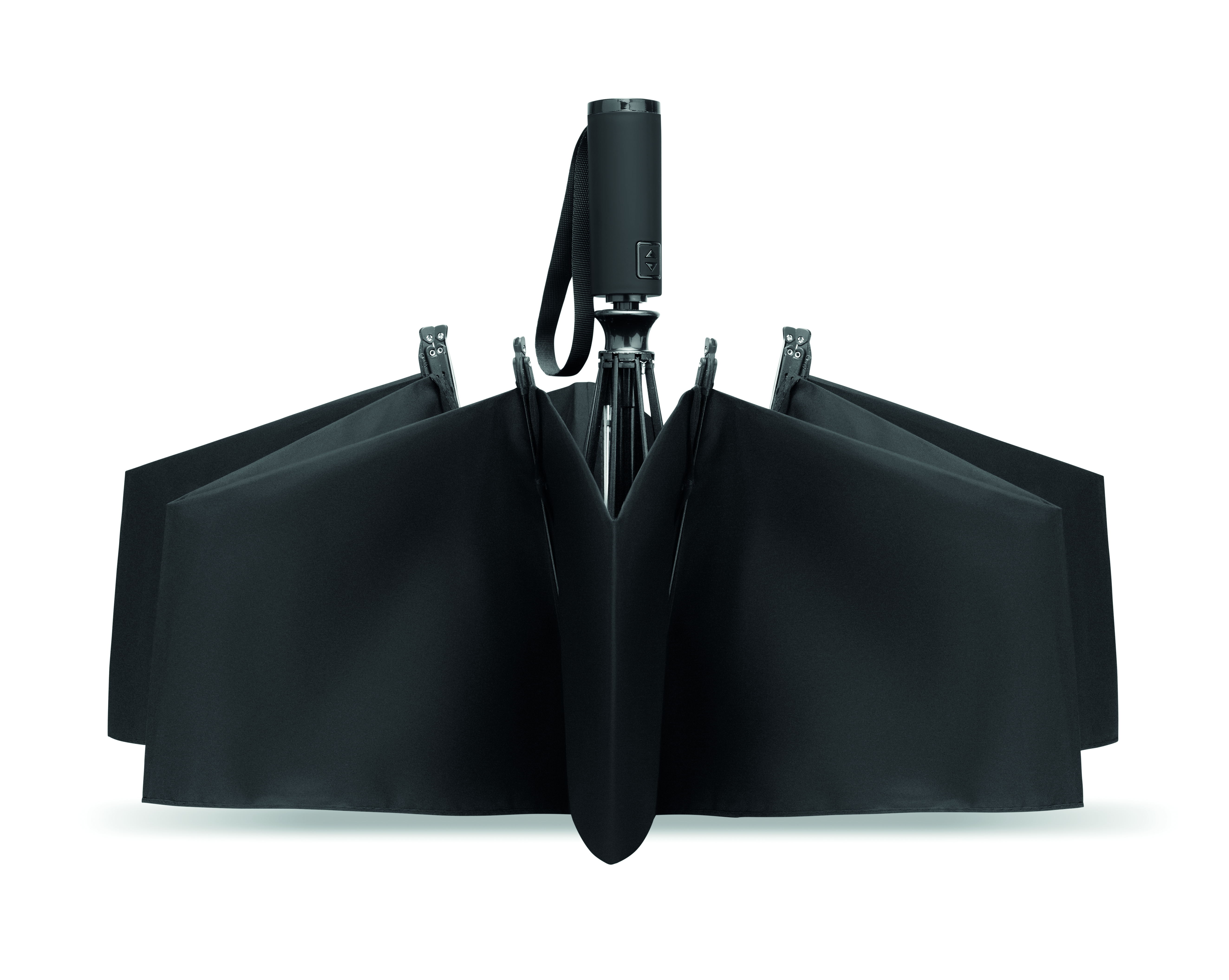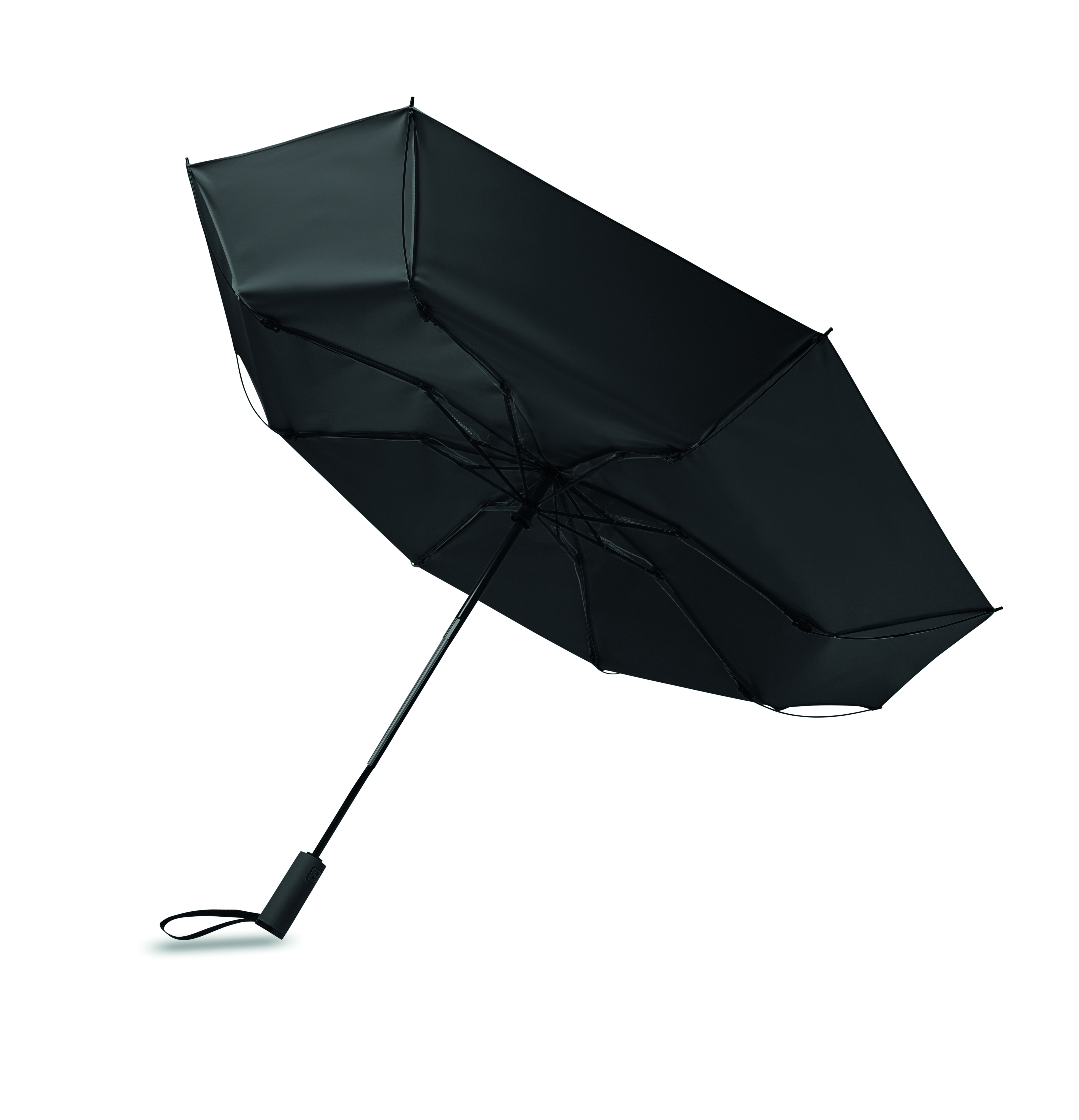 23-calowa, 3-częściowa parasolka z odwróconym mechanizmem, odporna na wiatr, wykonana z tkaniny pongee 190T RPET, z dopasowanym etui. Automatyczne otwieranie i zamykanie, całkowicie czarna rama, żebra