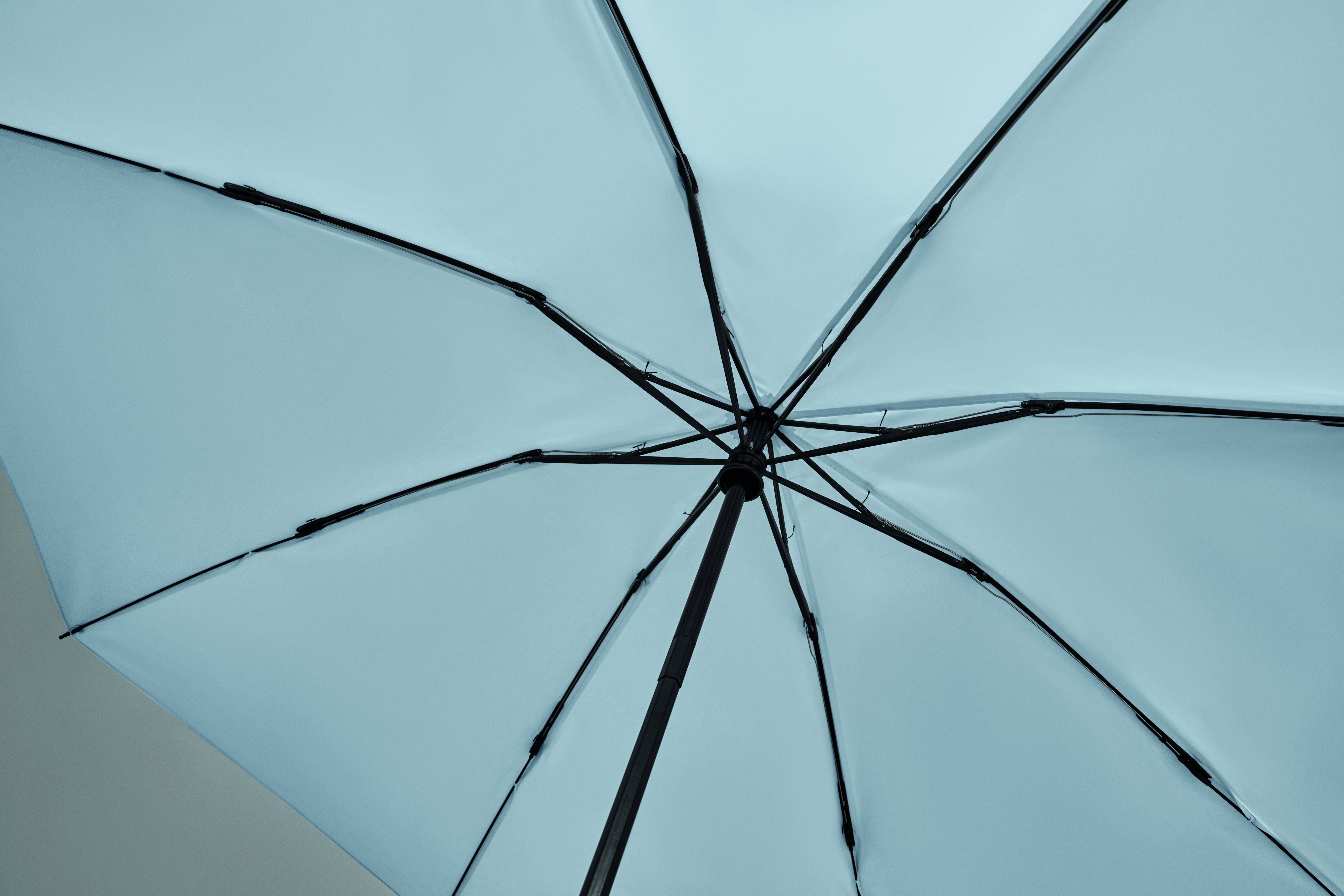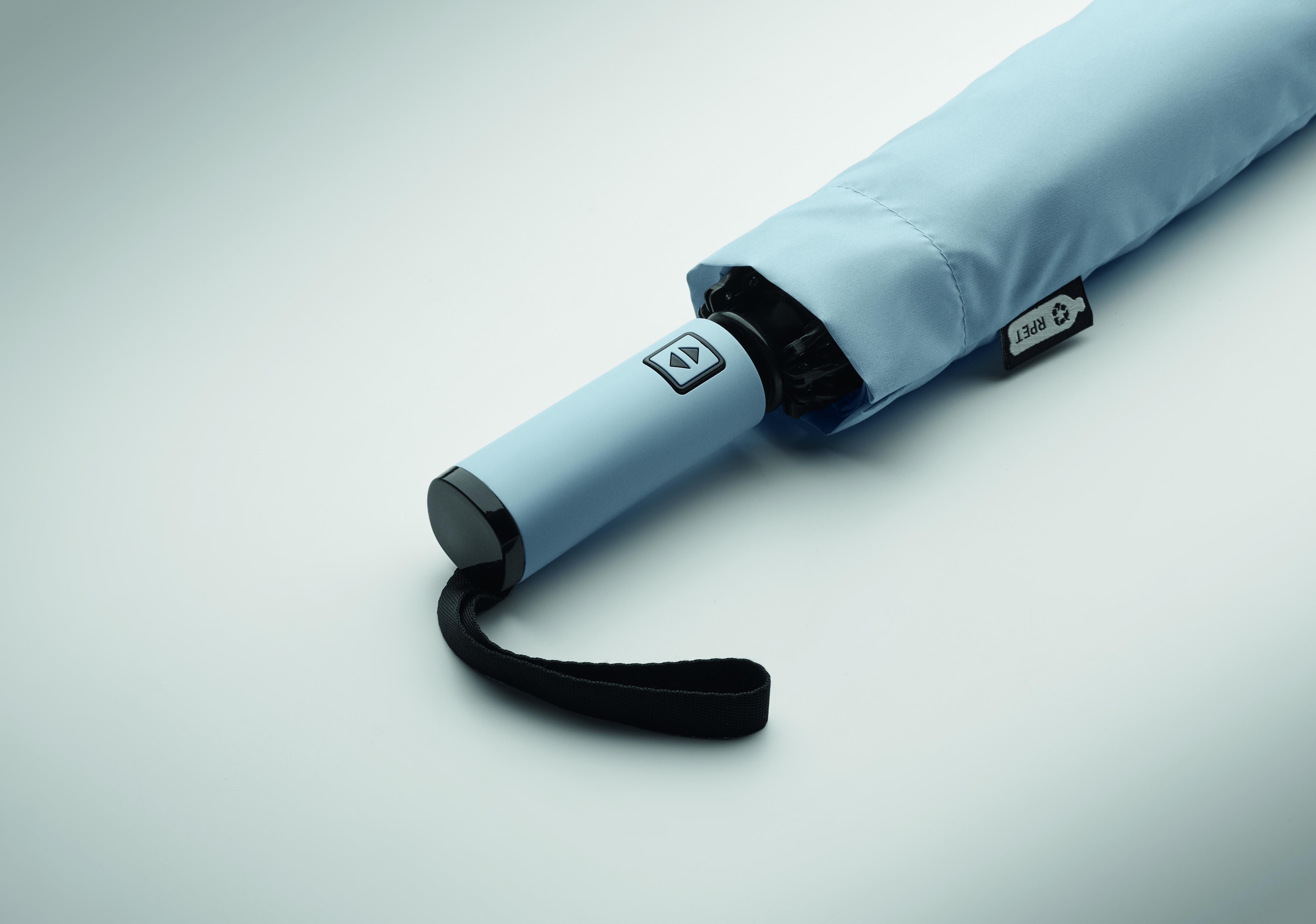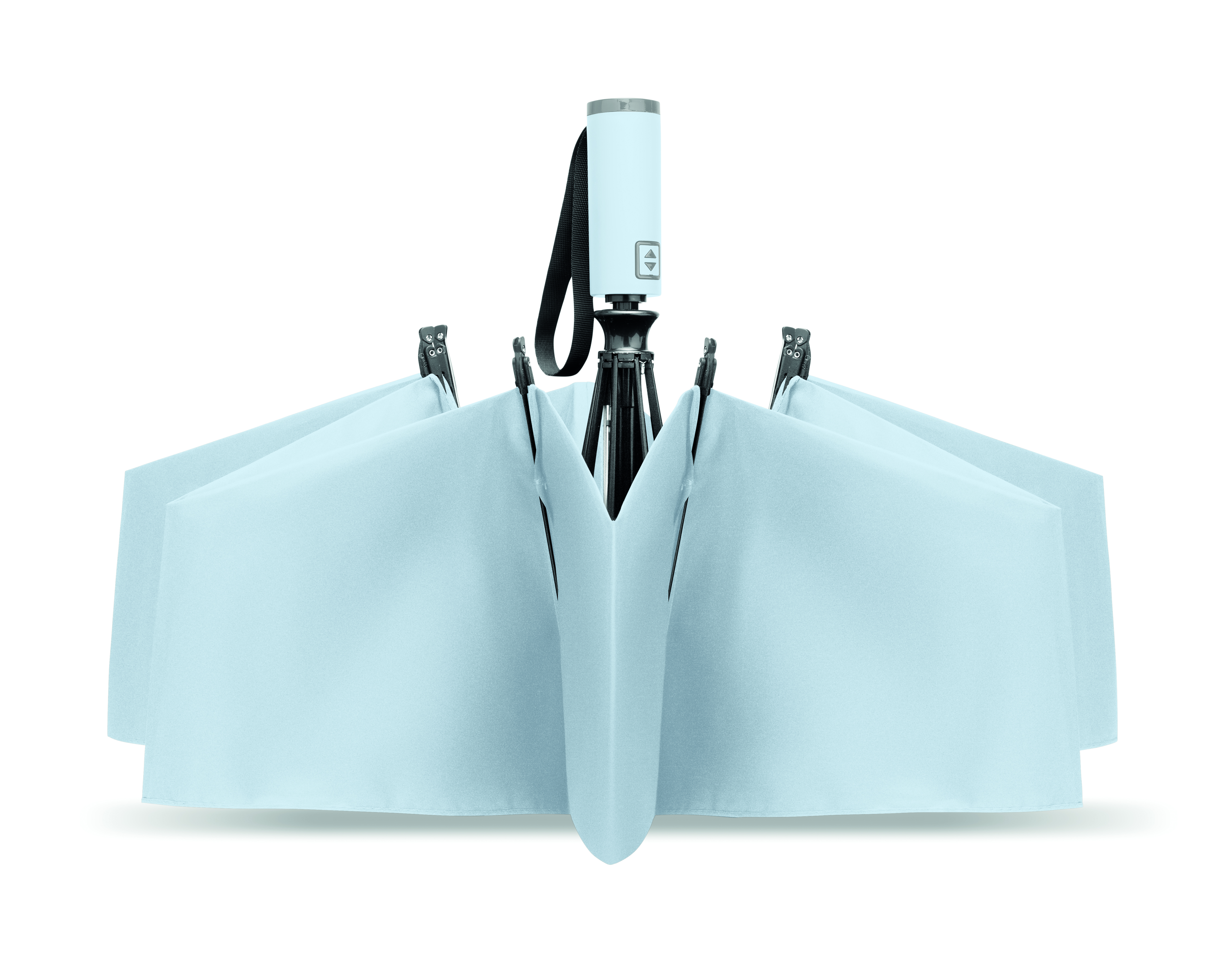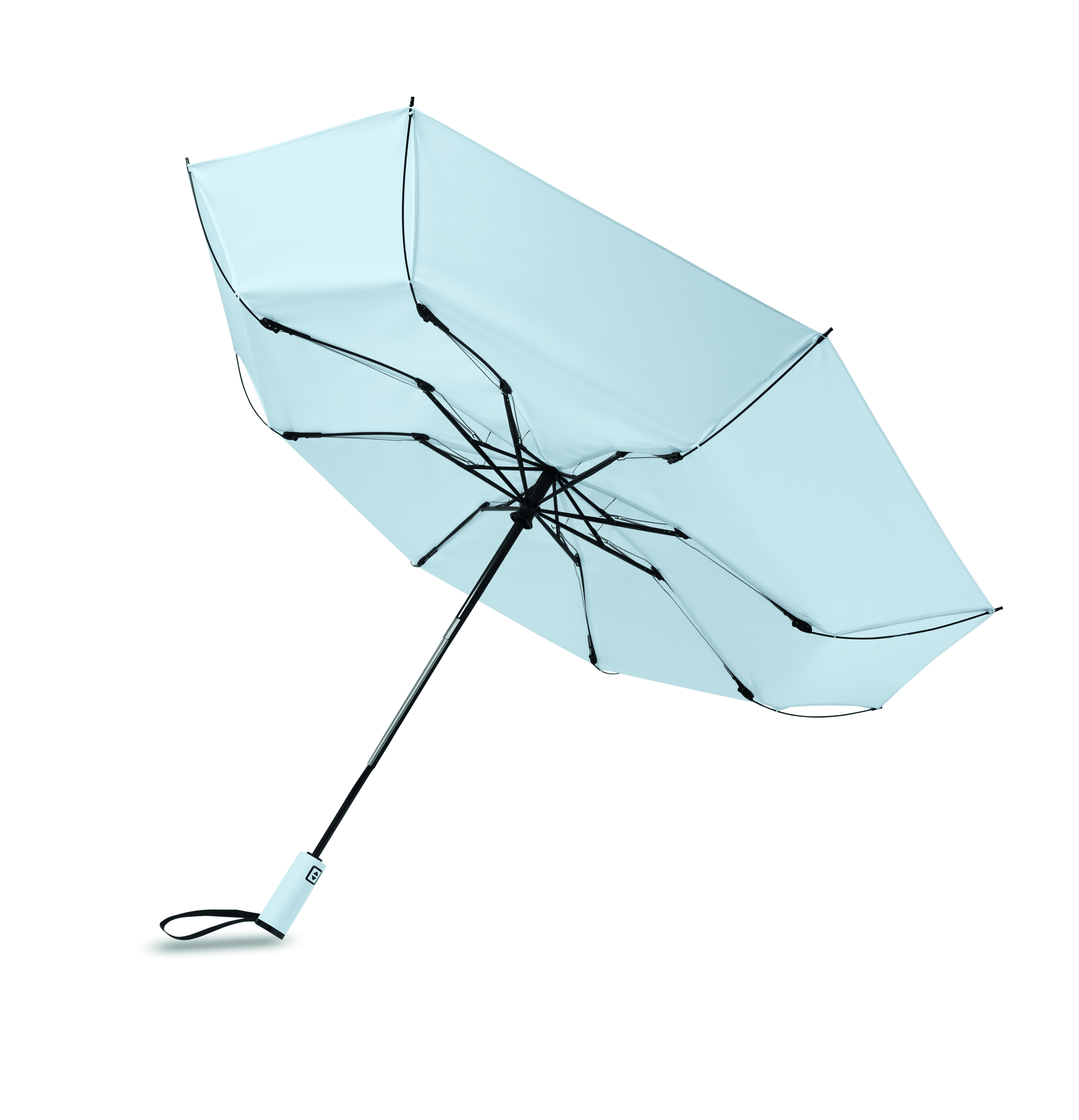 23-calowa, 3-częściowa parasolka z odwróconym mechanizmem, odporna na wiatr, wykonana z tkaniny pongee 190T RPET, z dopasowanym etui. Automatyczne otwieranie i zamykanie, całkowicie czarna rama, żebra