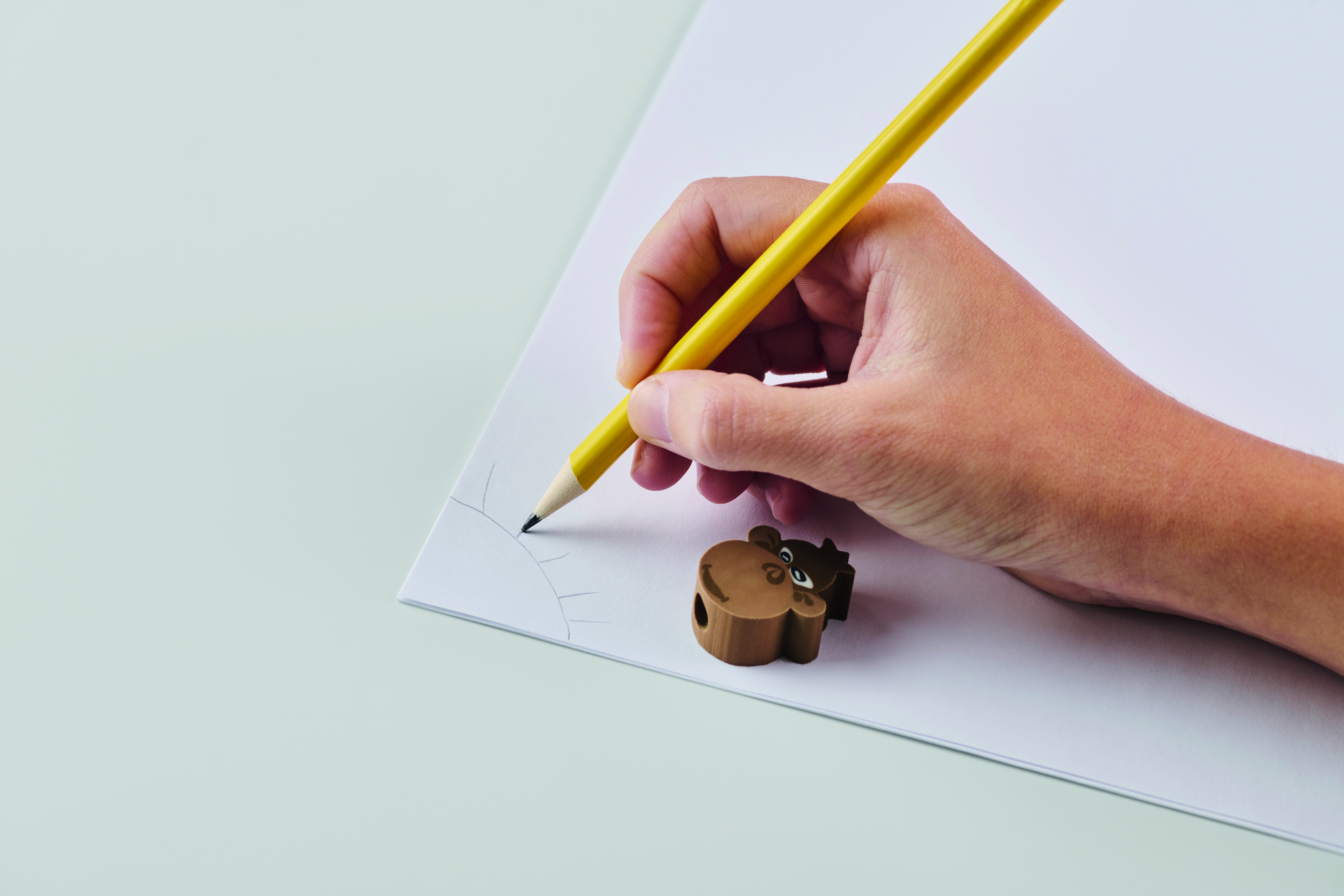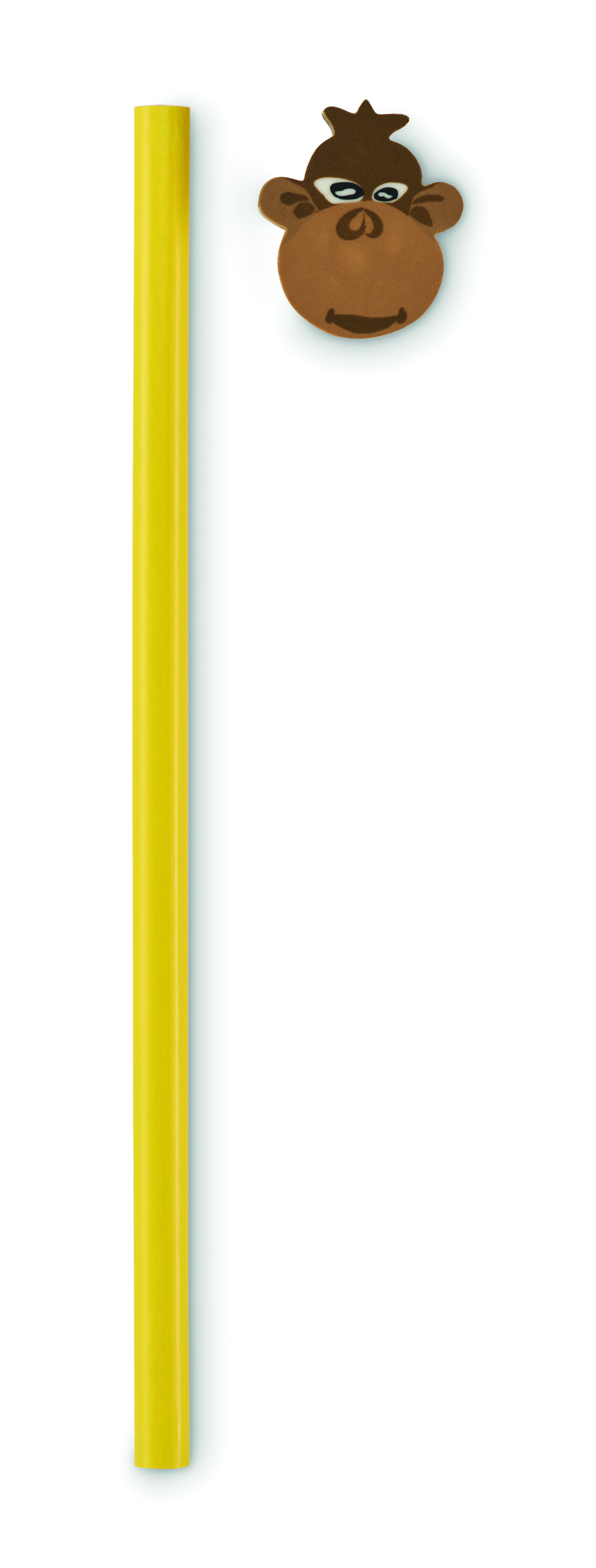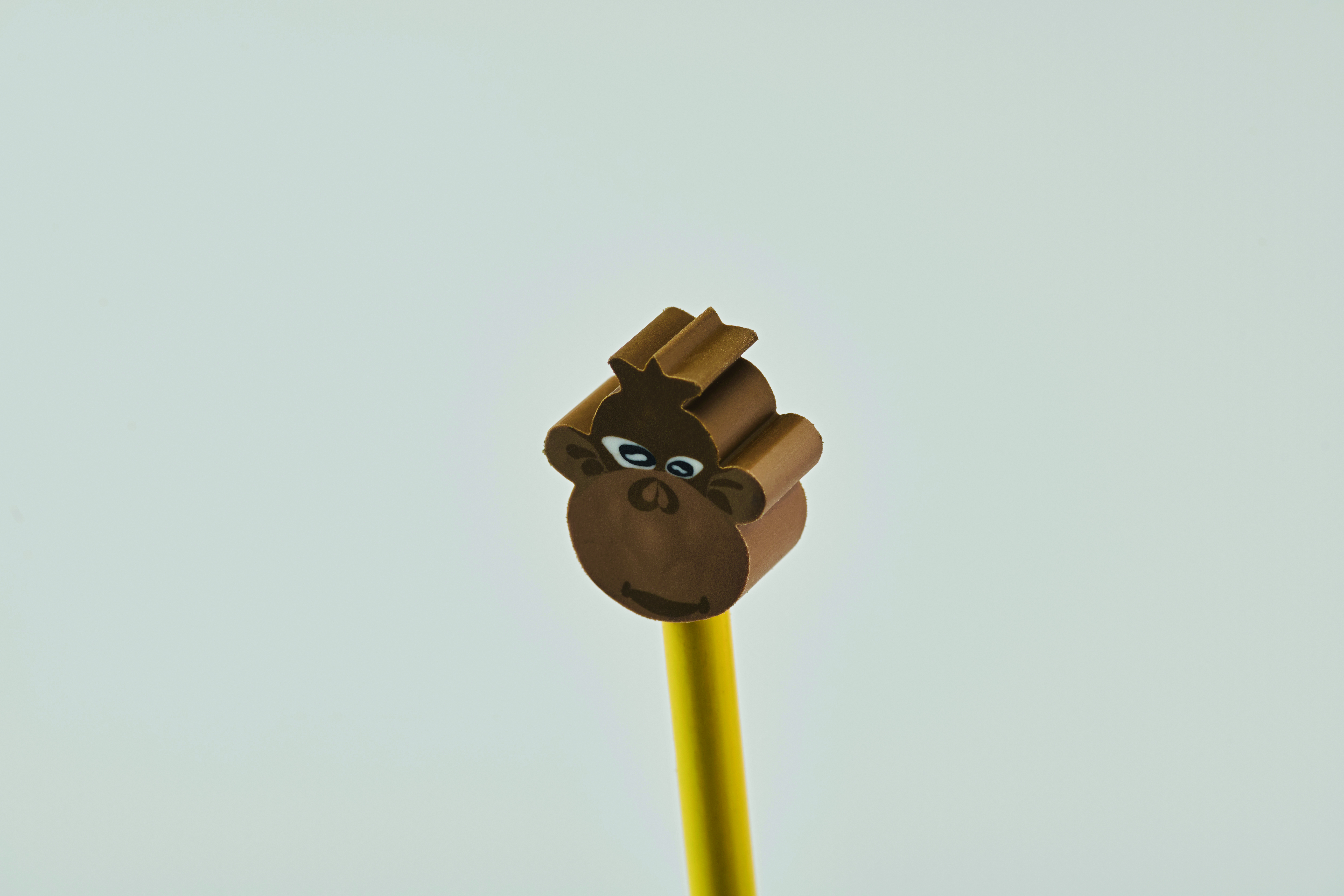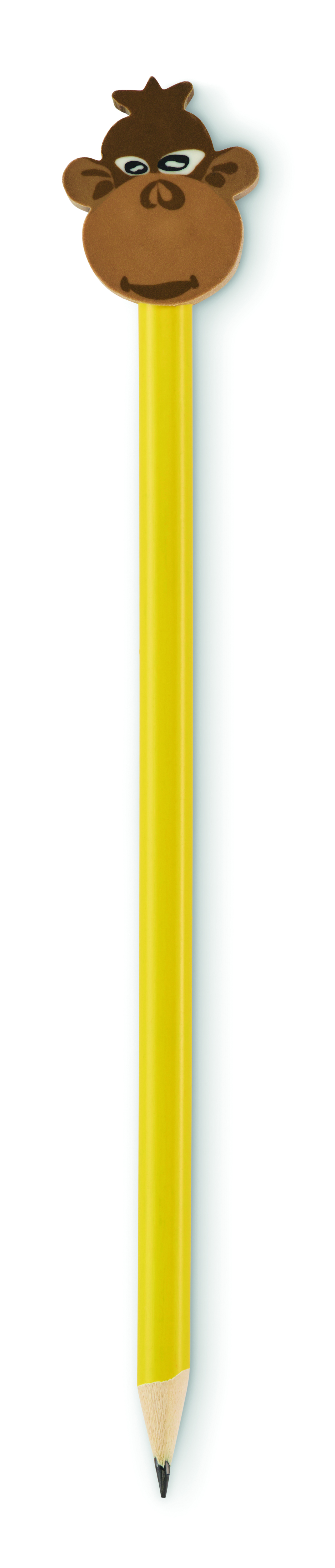 Drewniany ołówek z gumką w kształcie zwierzęcia.