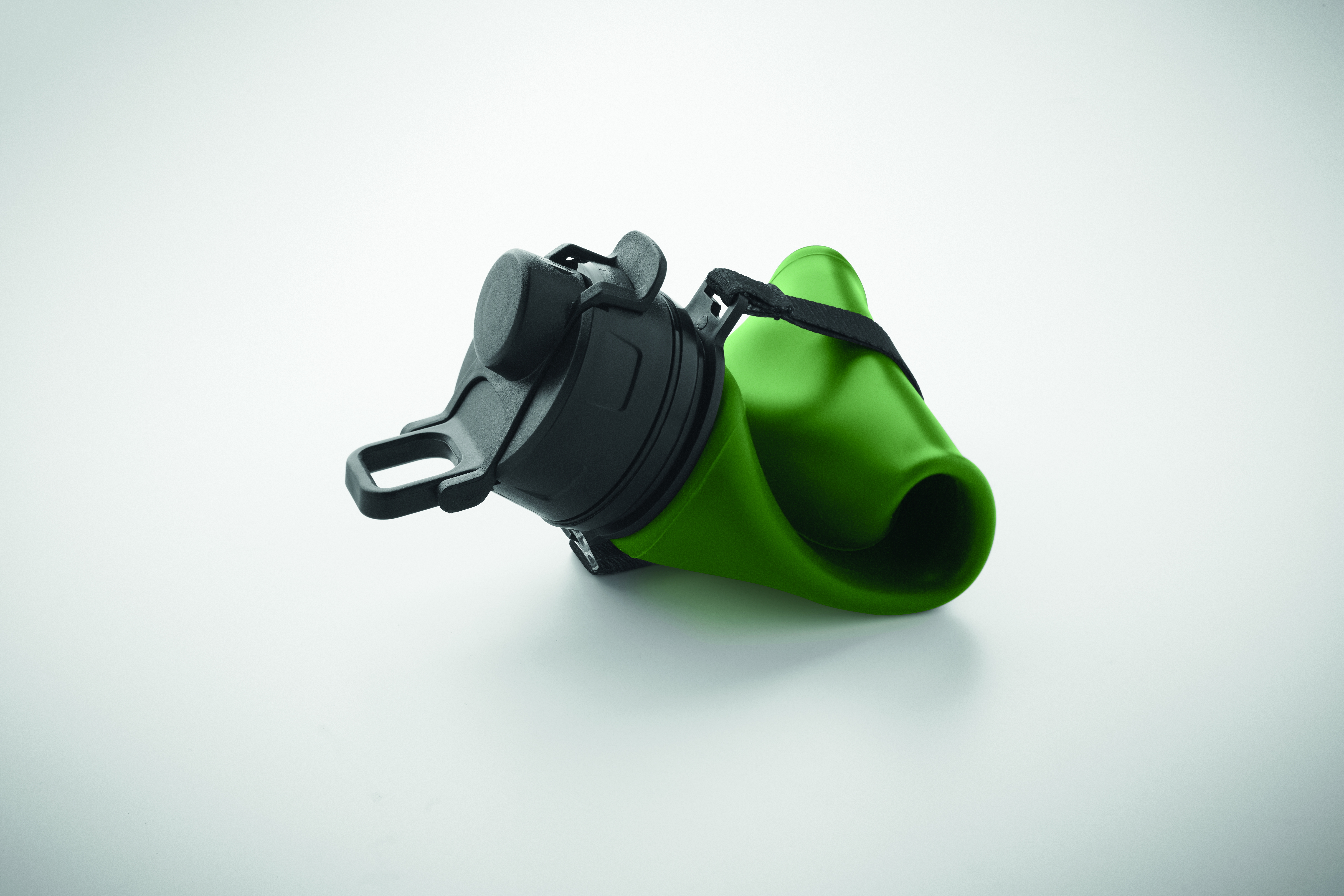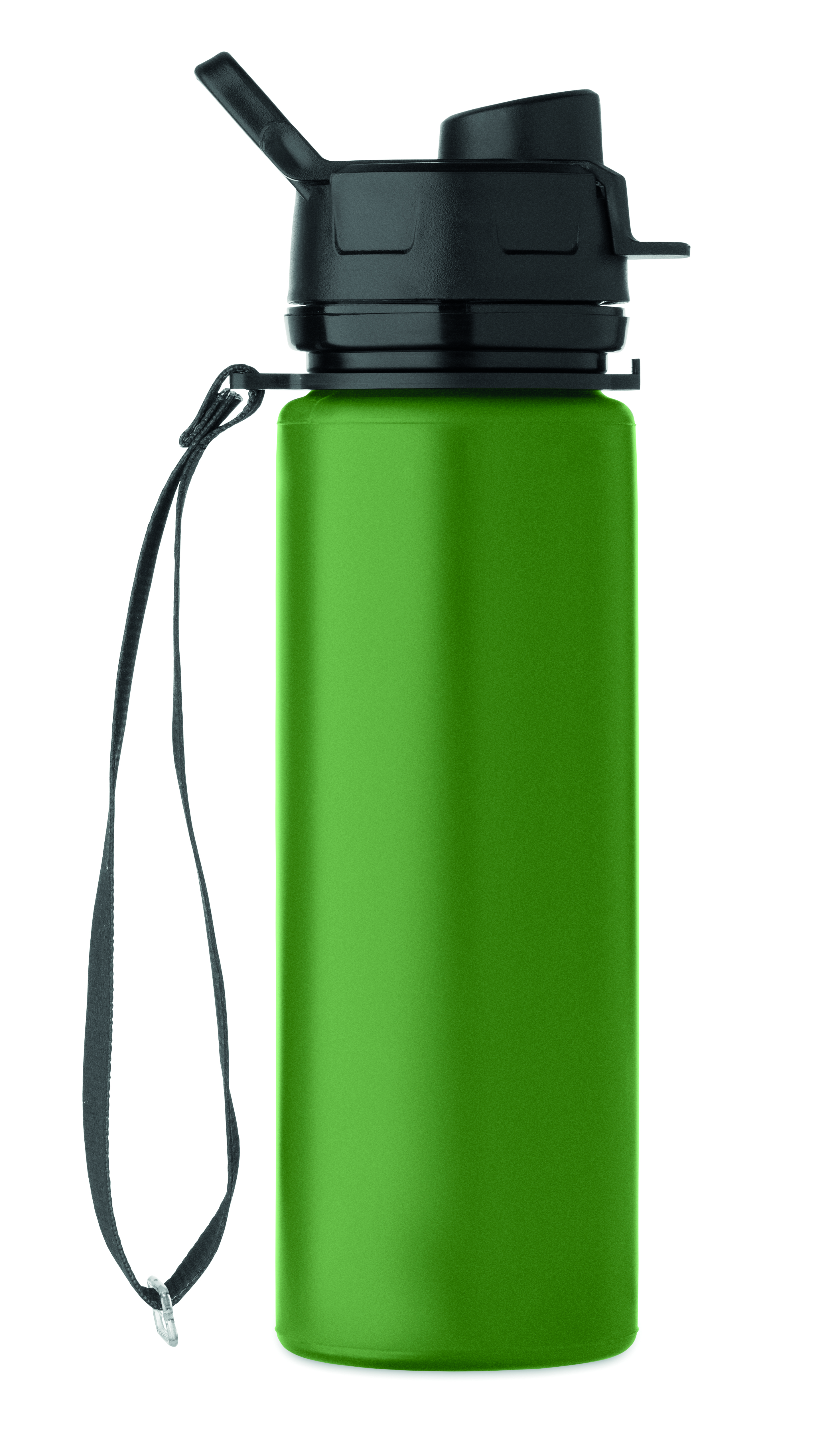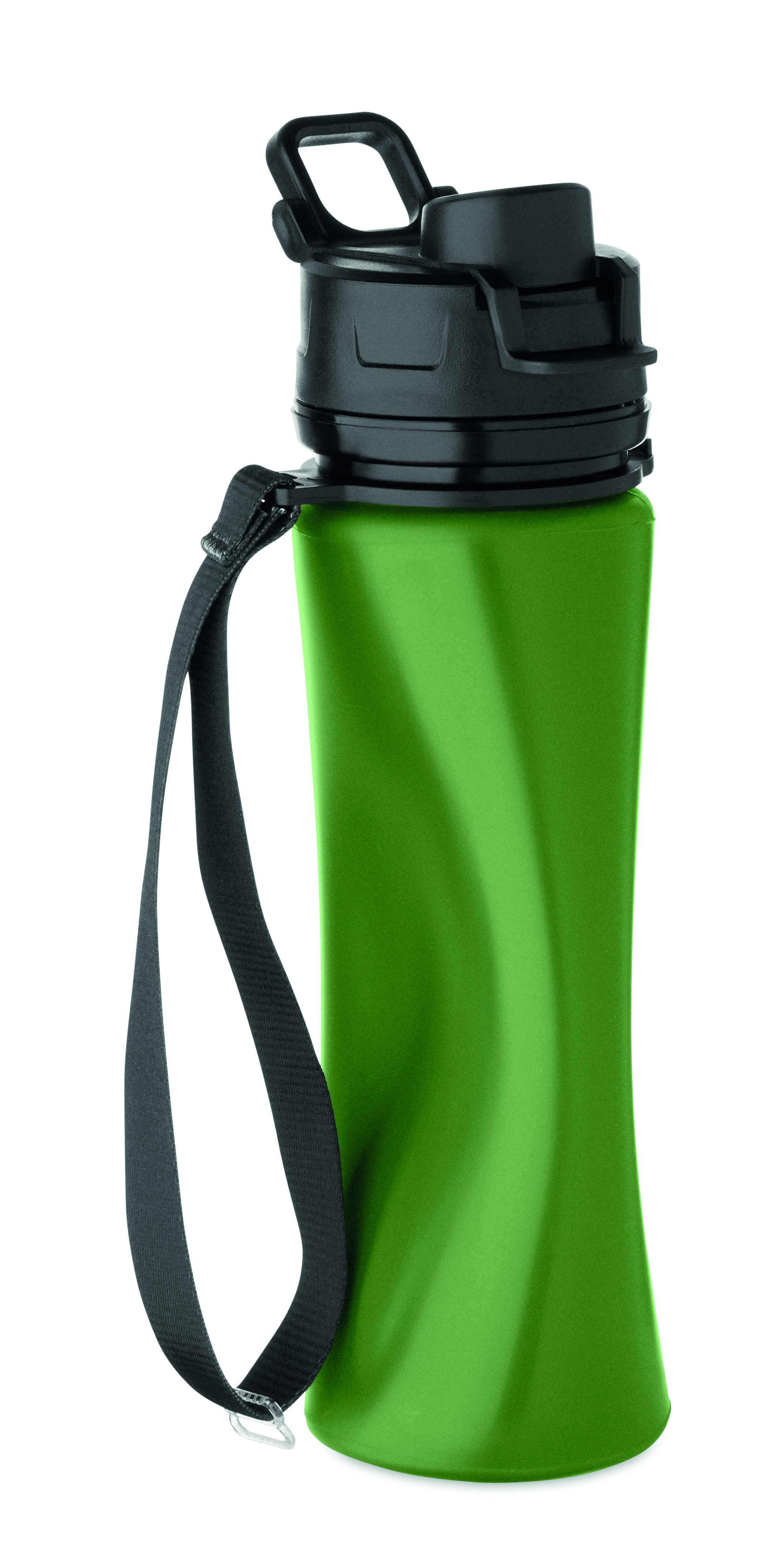 Składana silikonowa butelka sportowa z pokrywką z PP, uchwytem, poliestrowym paskiem i przezroczystą klamrą do zabezpieczenia po złożeniu. Nie przecieka. Pojemność: 500 ml.