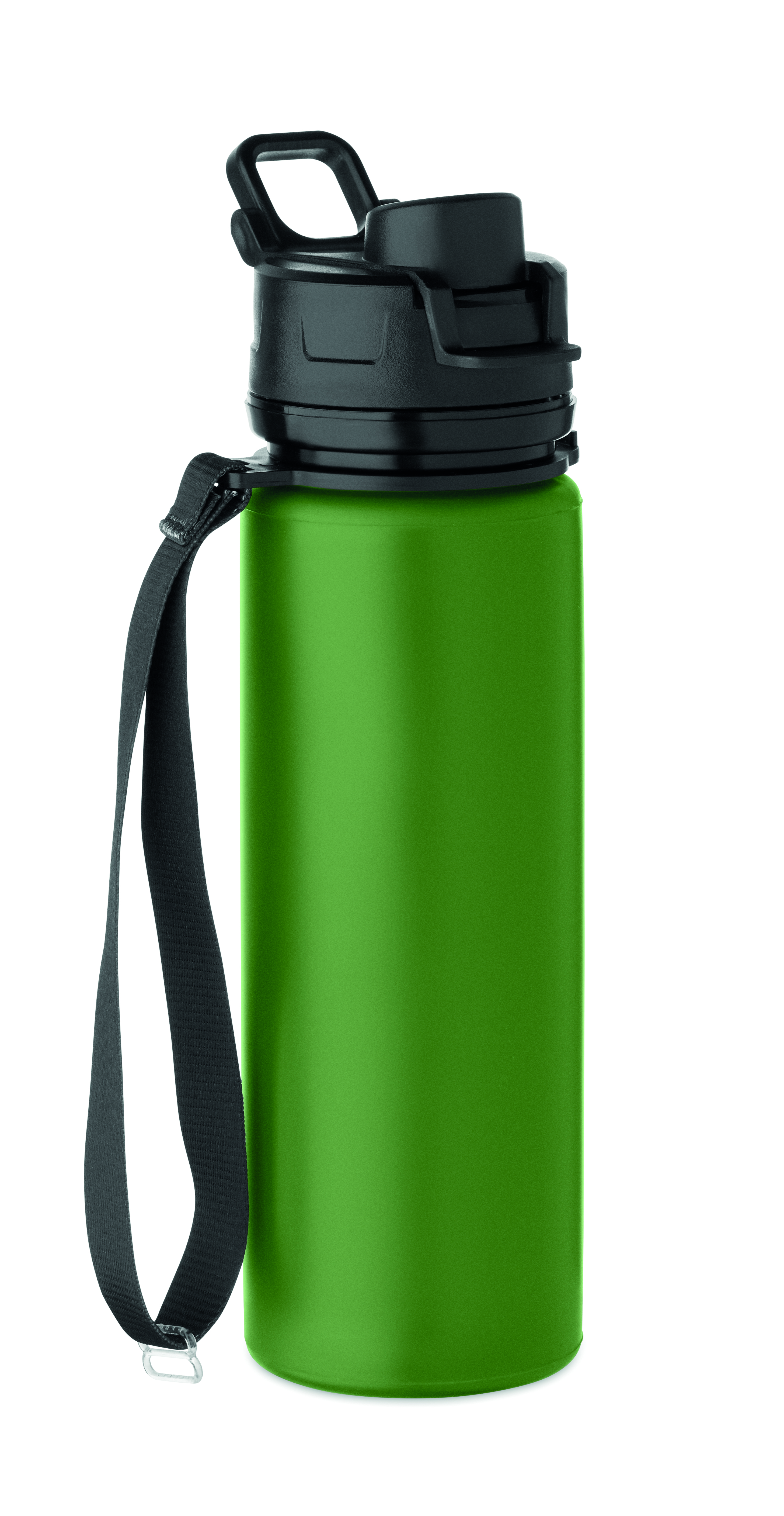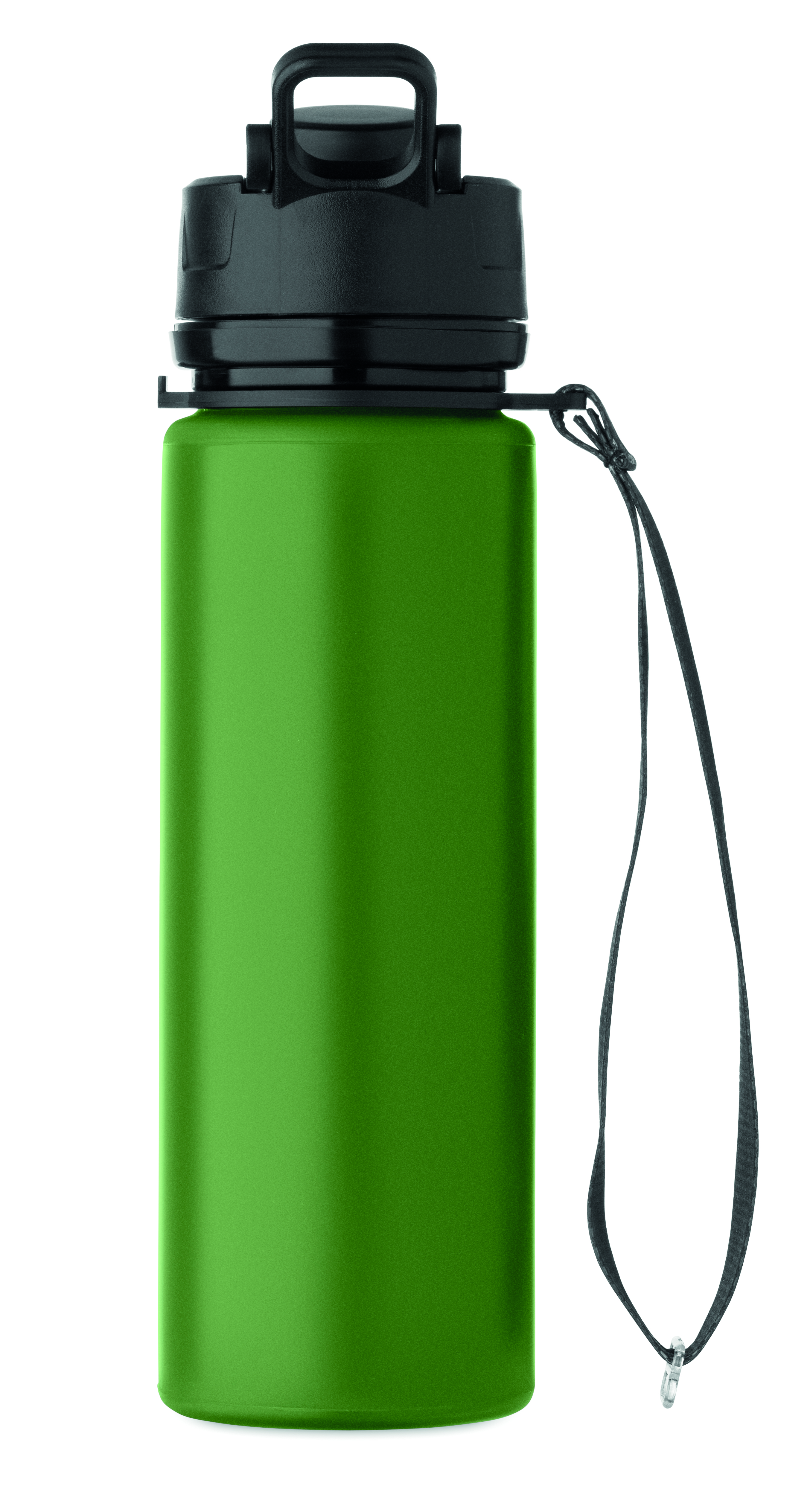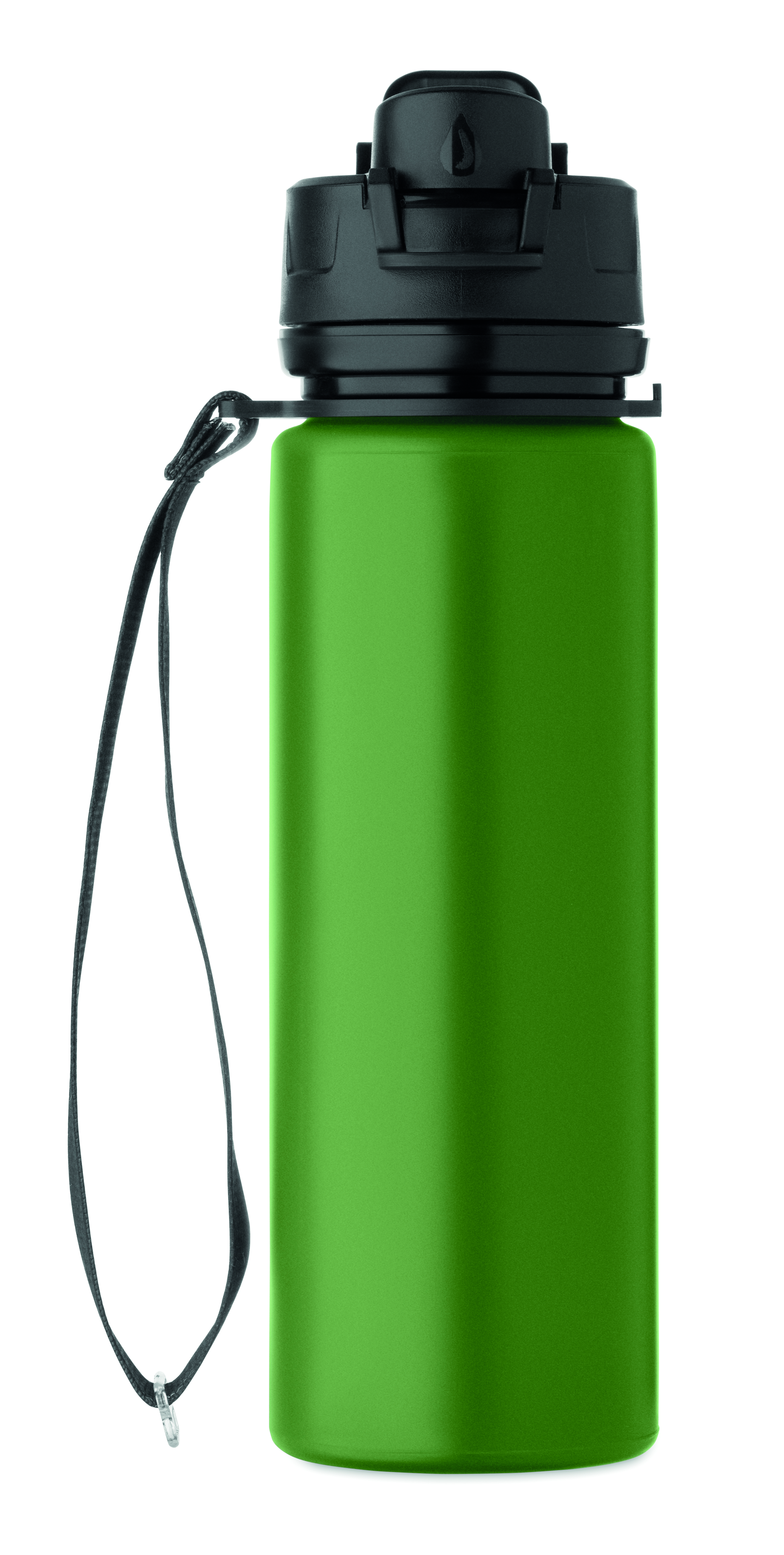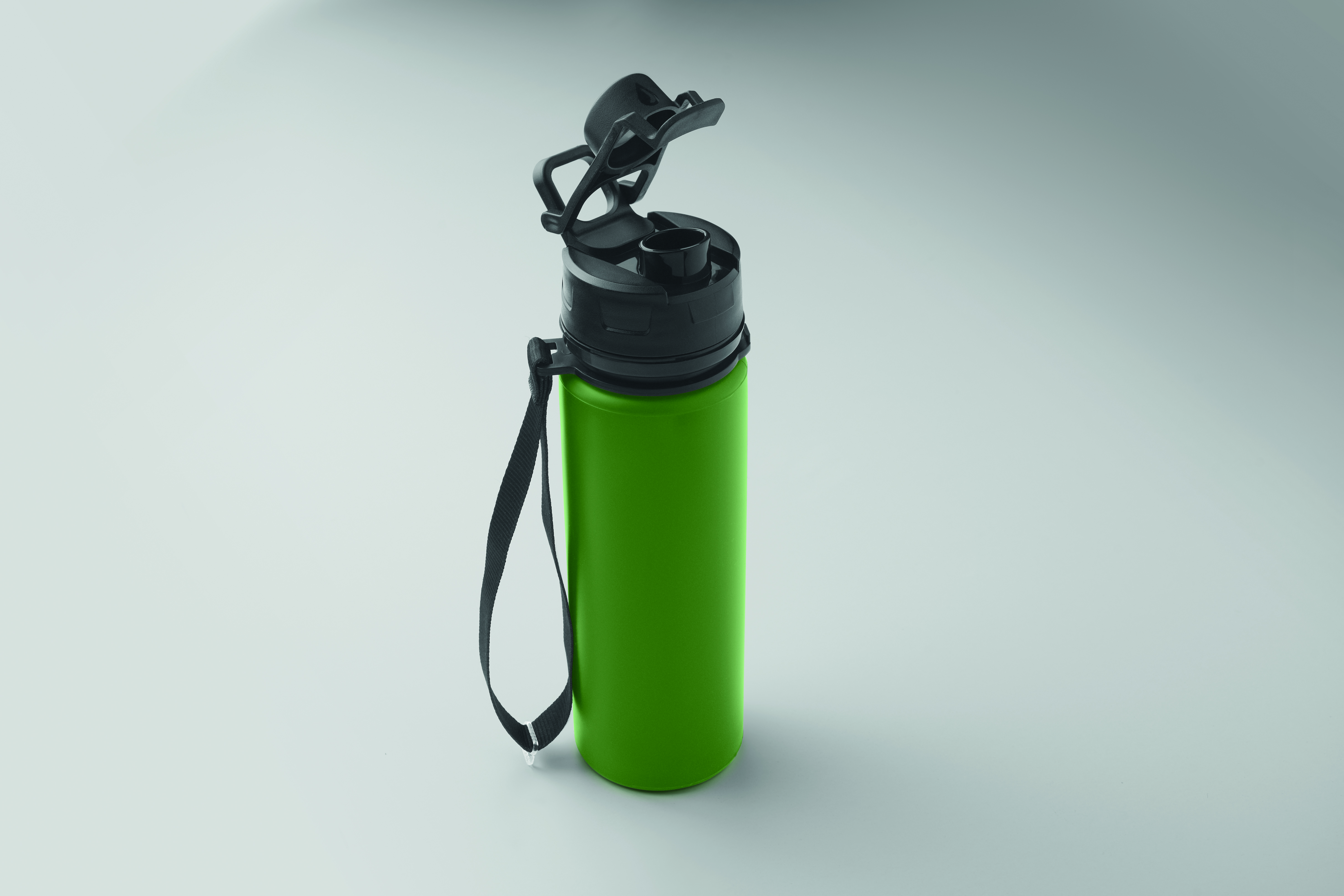 Składana silikonowa butelka sportowa z pokrywką z PP, uchwytem, poliestrowym paskiem i przezroczystą klamrą do zabezpieczenia po złożeniu. Nie przecieka. Pojemność: 500 ml.