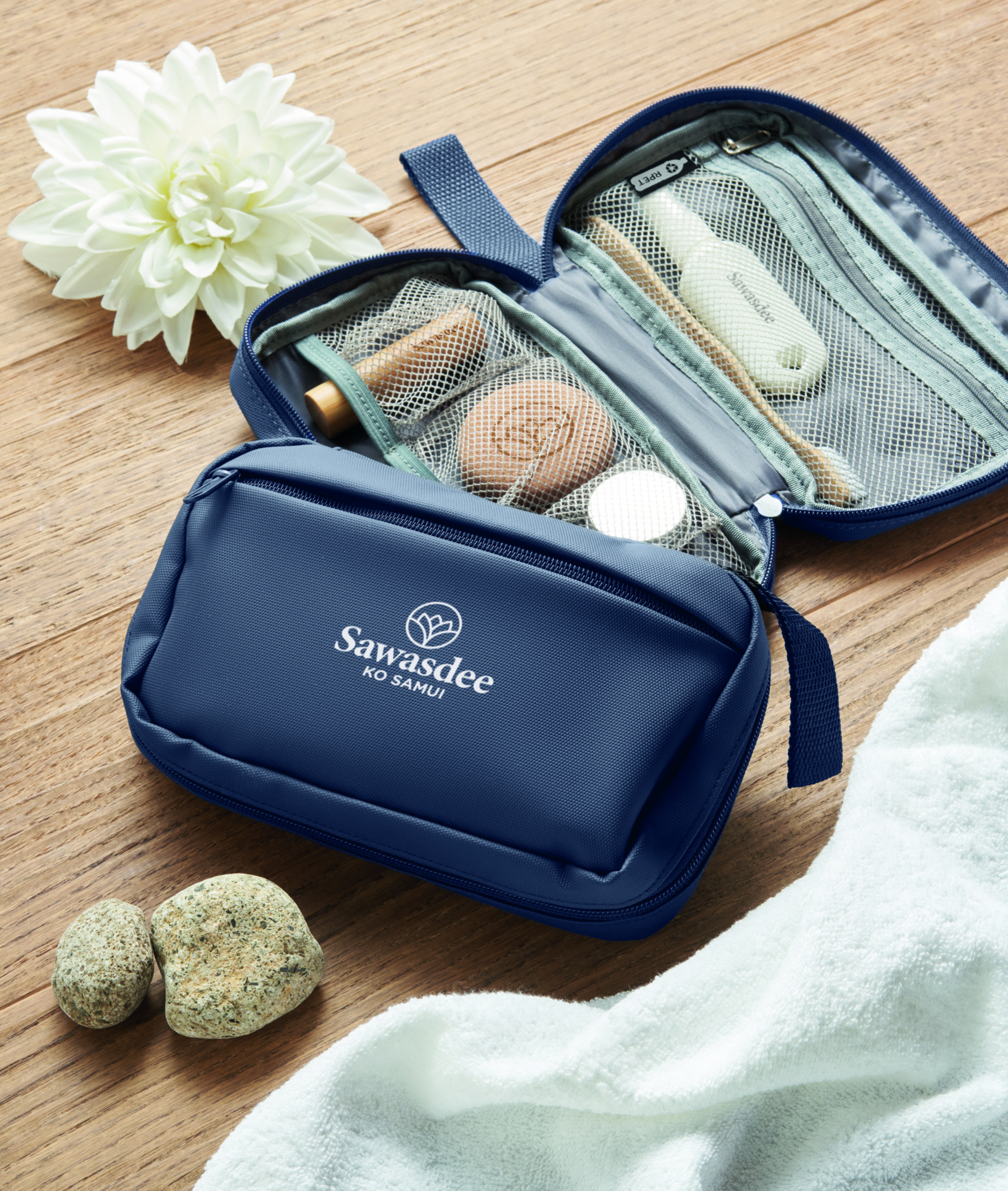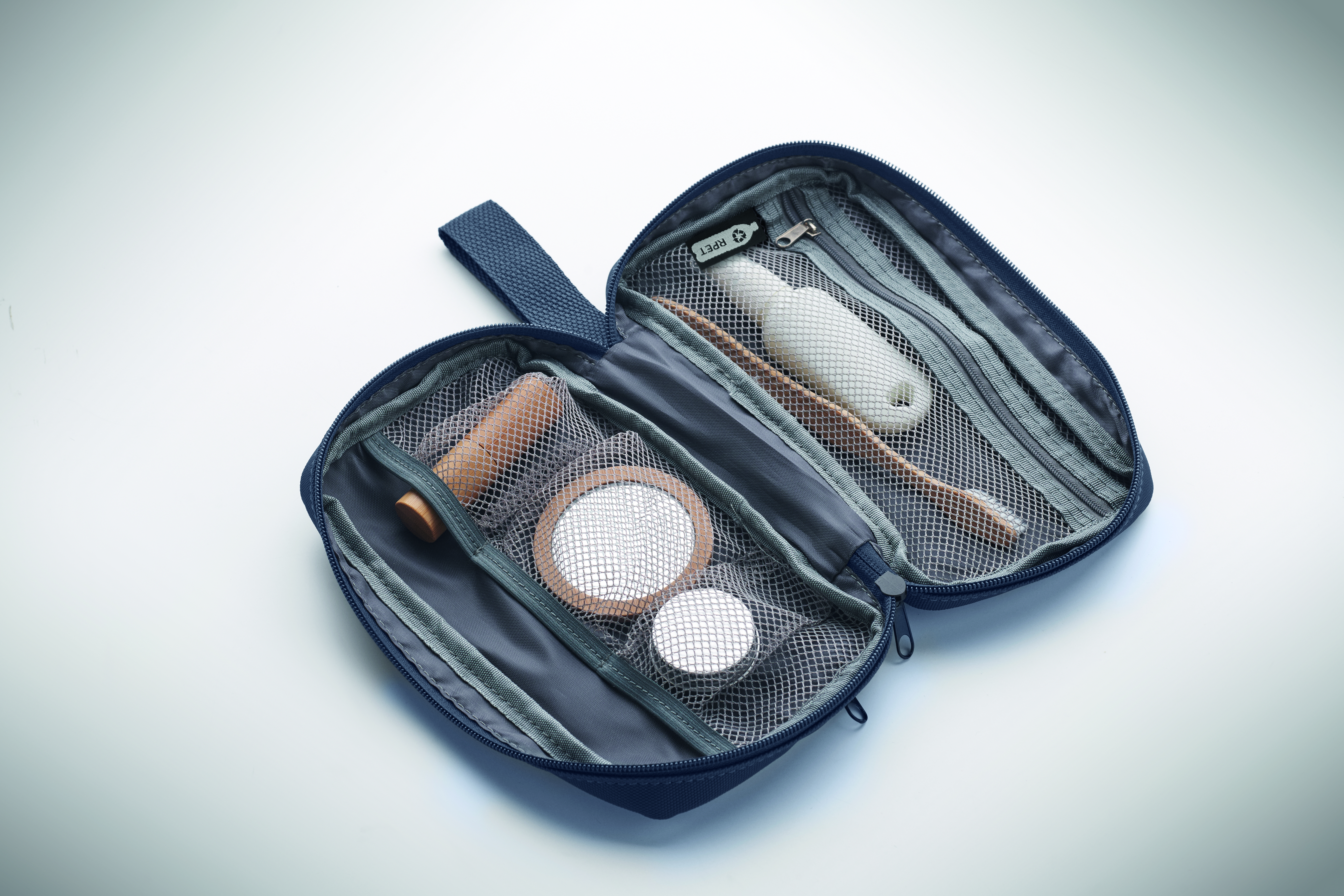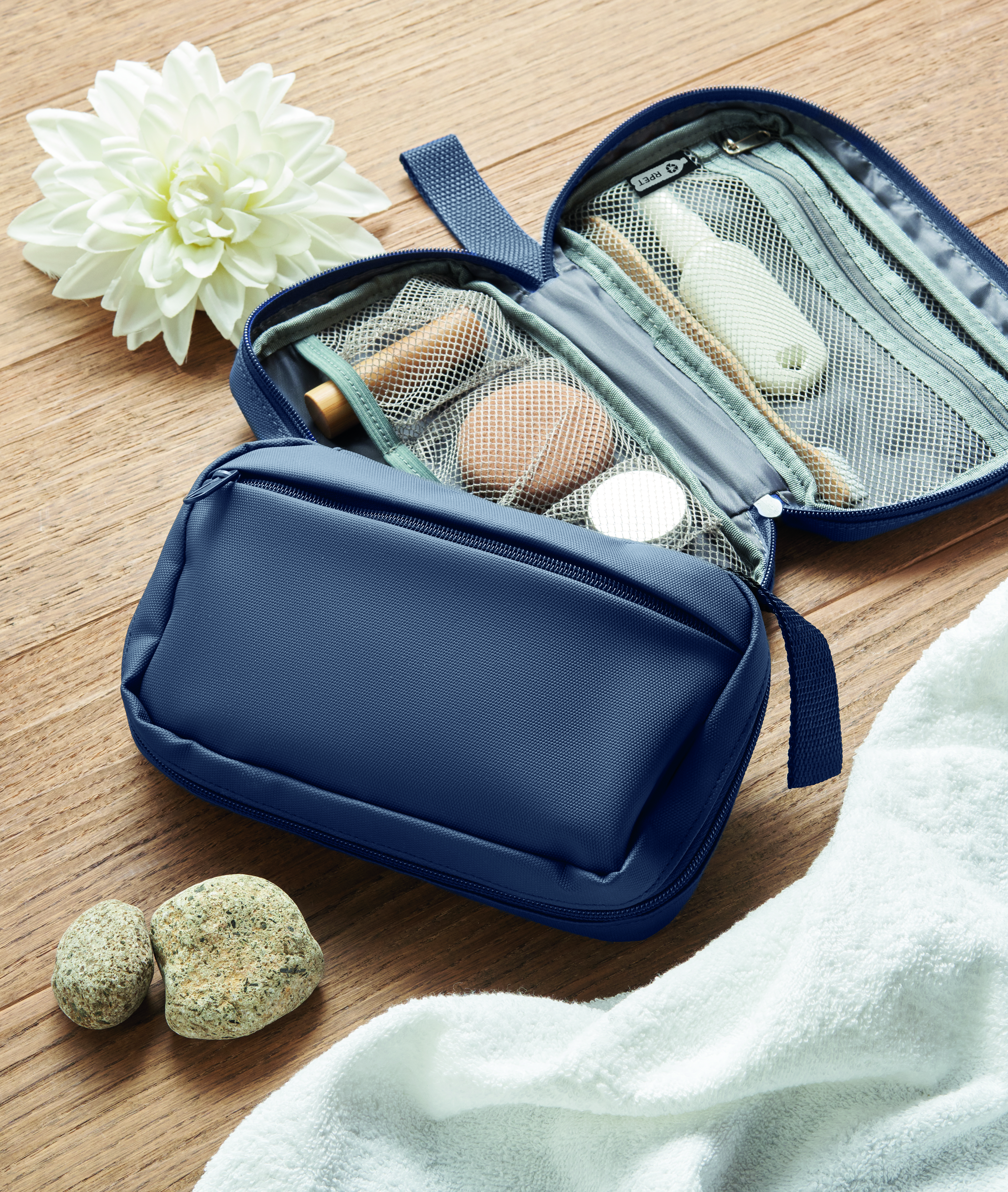 Kosmetyczka wykonana z 600D RPET z powłoką PU, siatką RPET i podszewką 210D RPET. Wyposażona w przednią kieszeń główną zapinaną na zamek błyskawiczny, wewnętrzną siatkę i otwarte kieszenie.