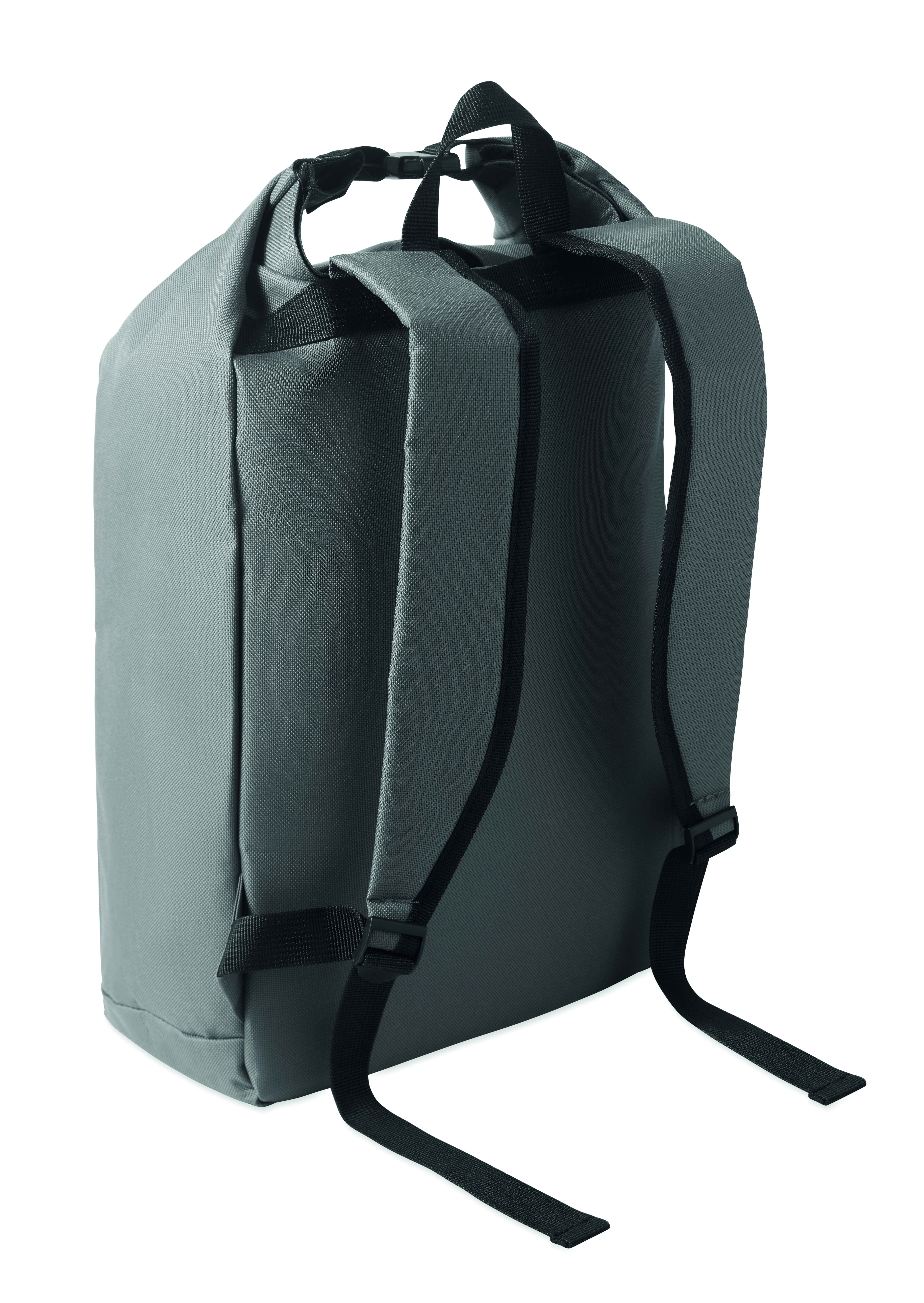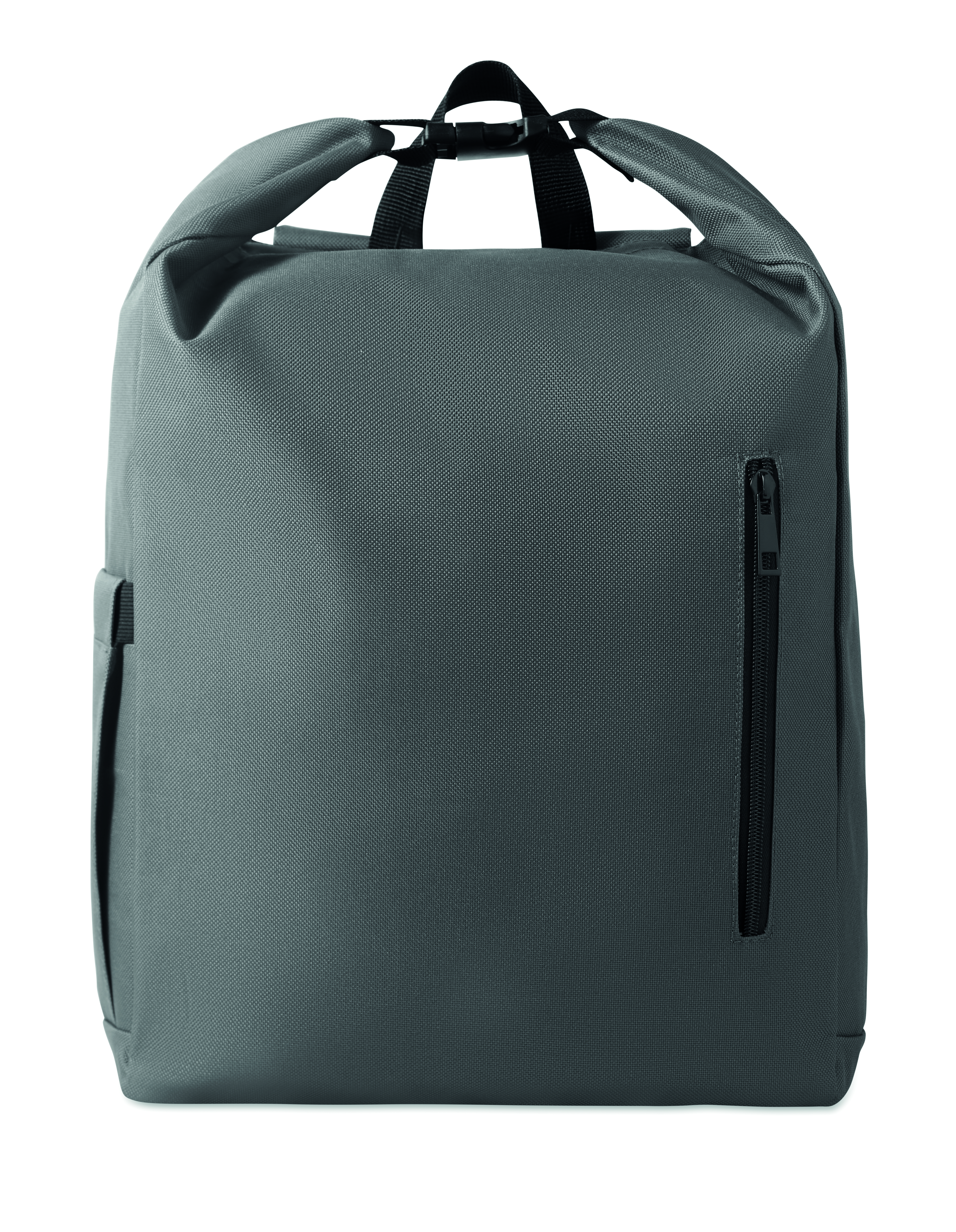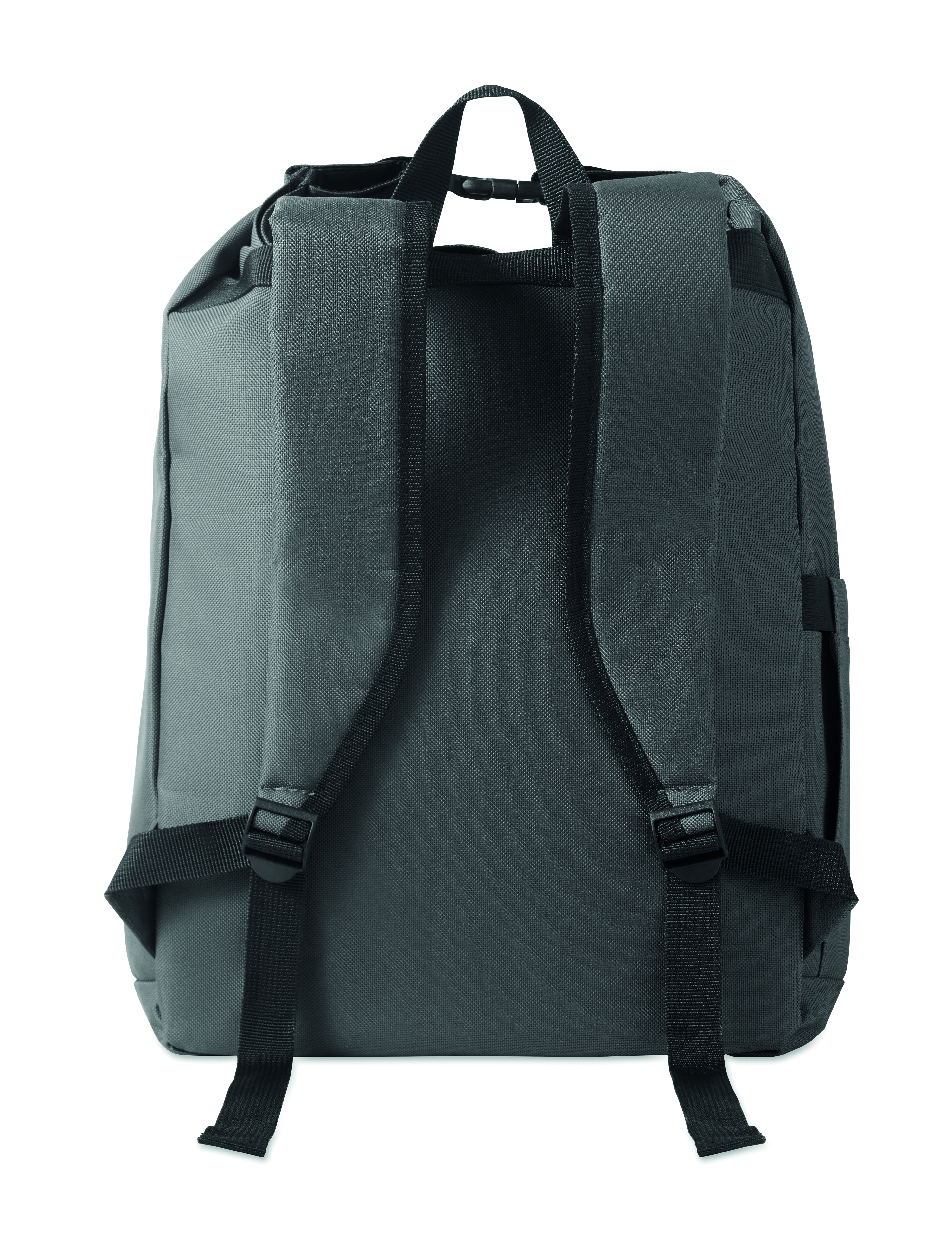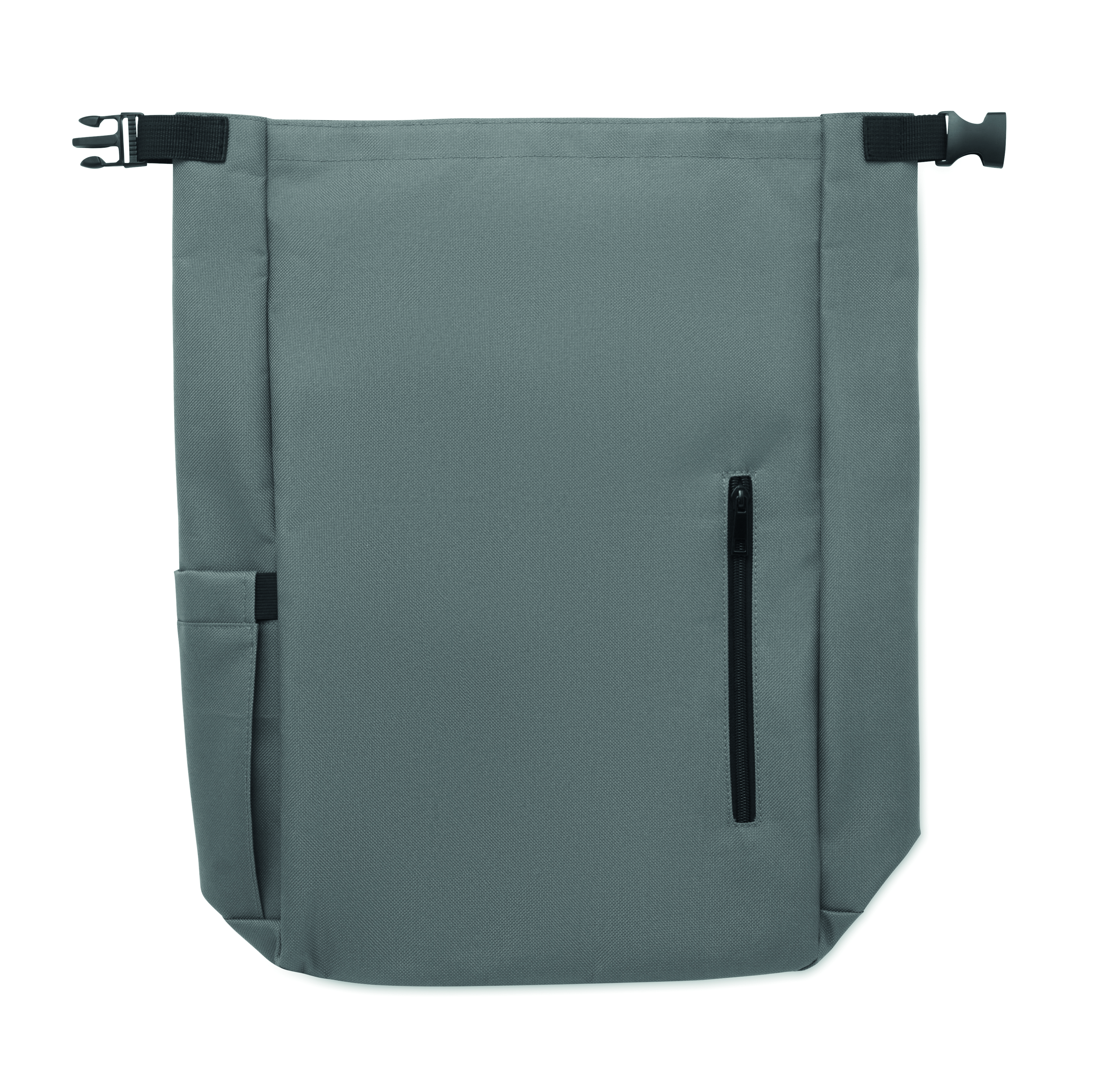15-calowy plecak na laptopa wykonany z poliestru 600D RPET z wyściełaną podszewką 210D RPET. Posiada przednią kieszeń zapinaną na zamek, elastyczną kieszeń boczną i regulowane paski na ramiona.