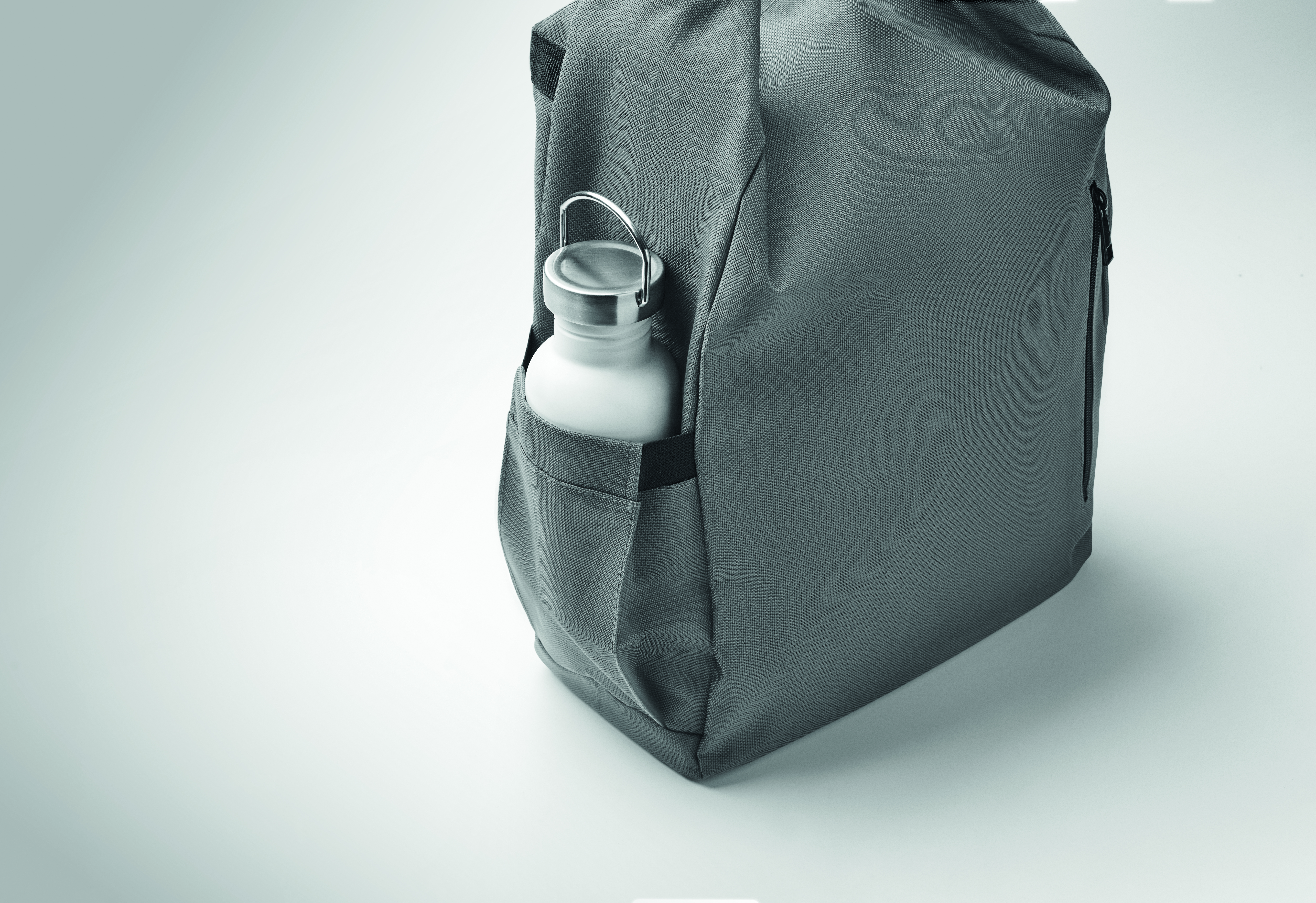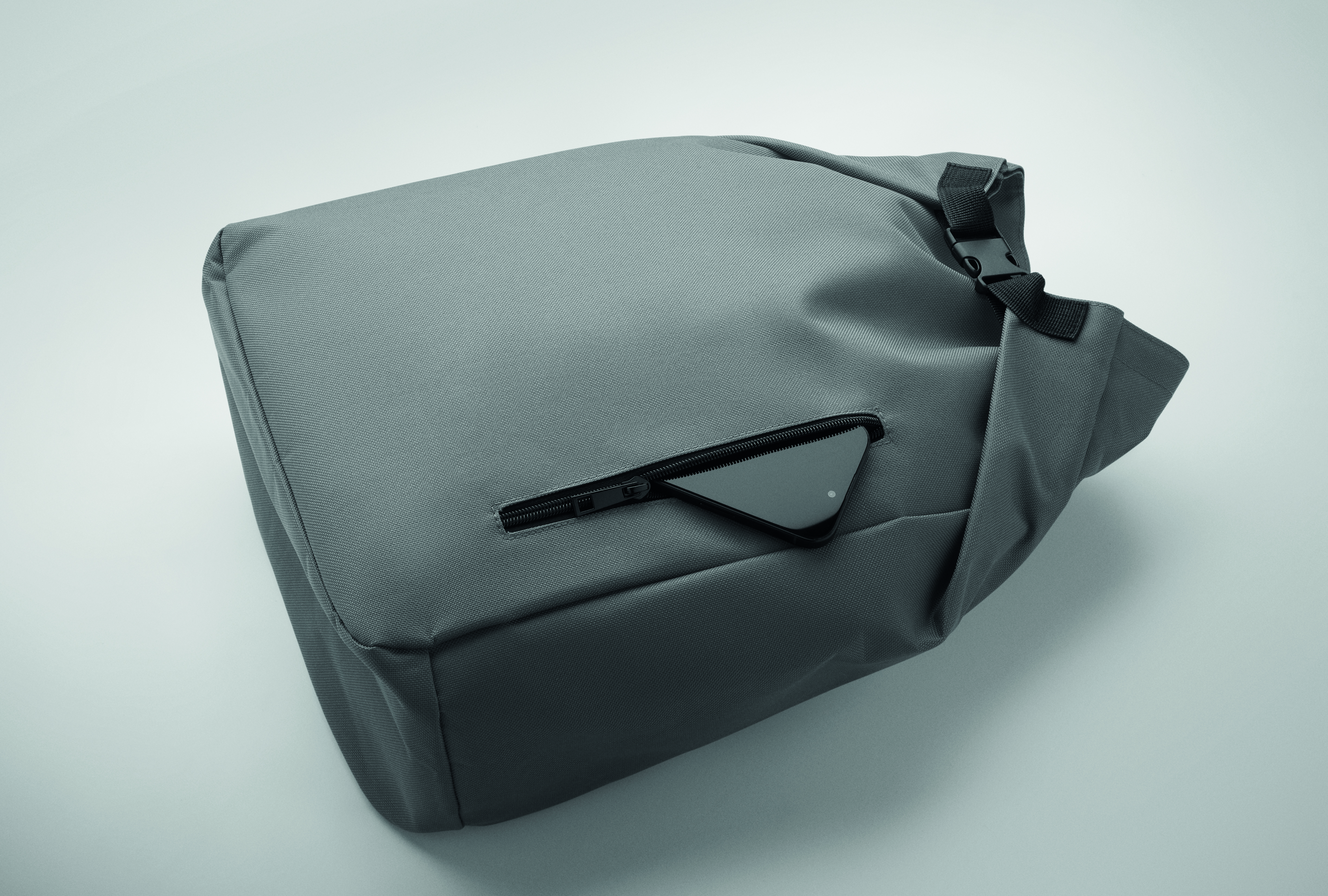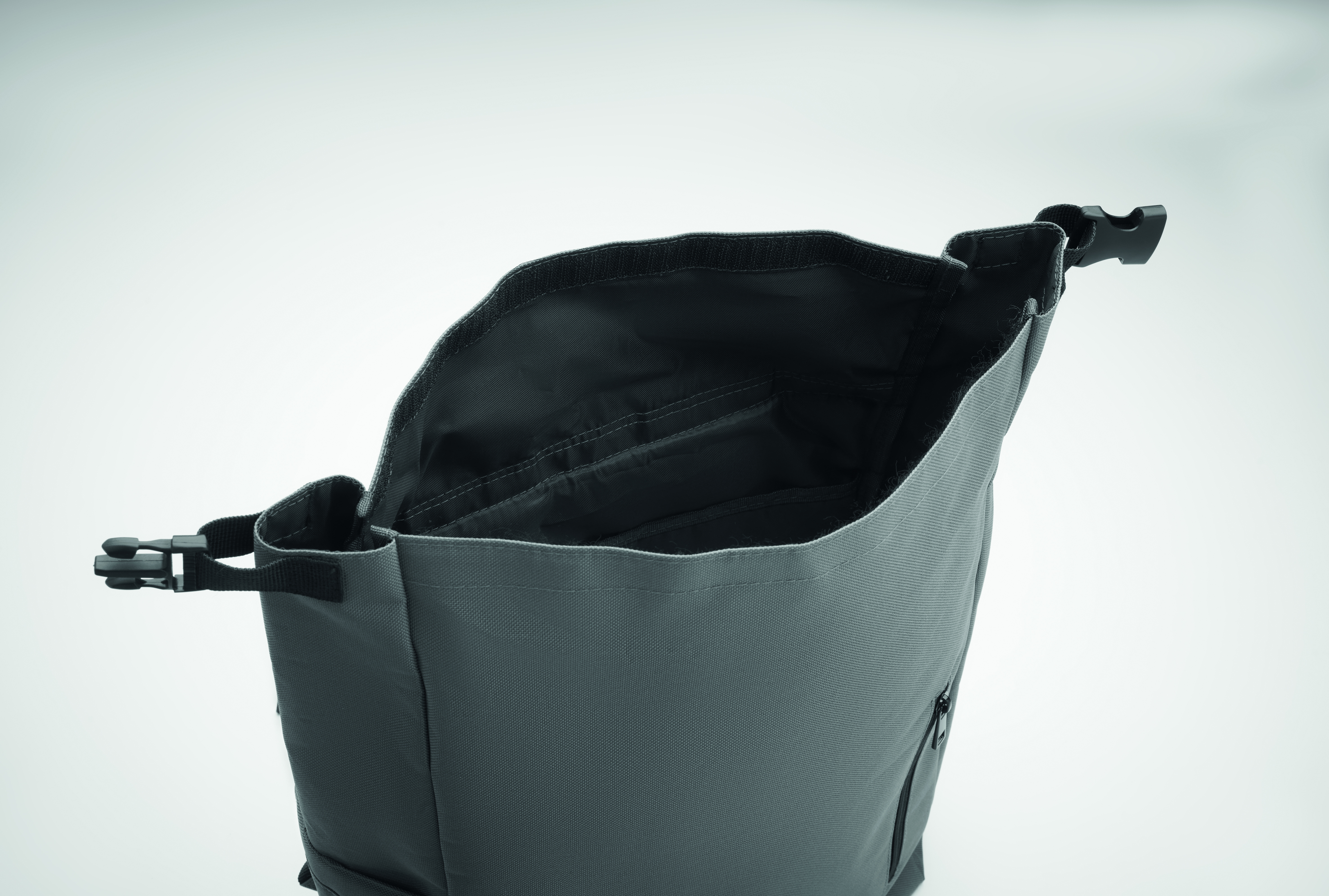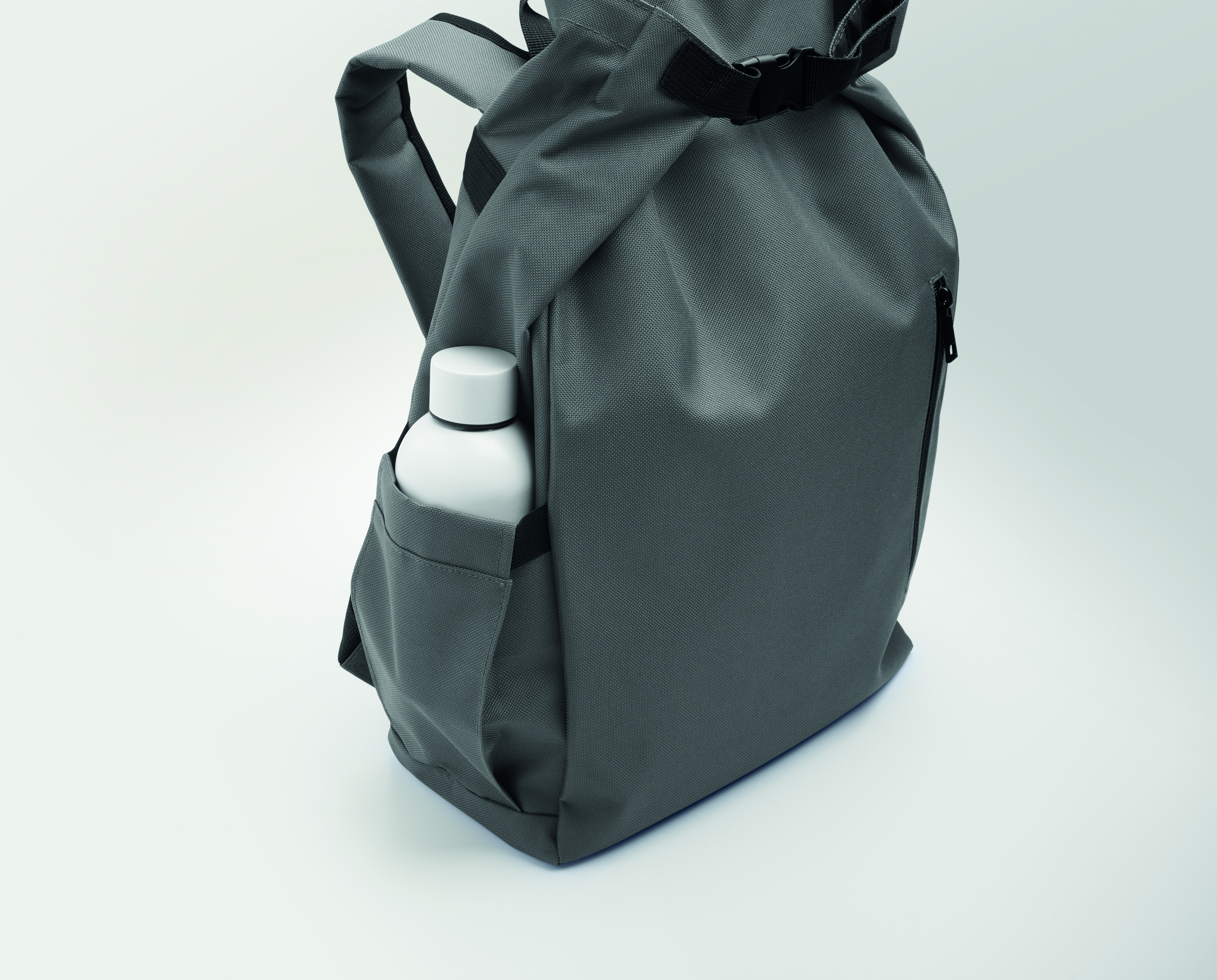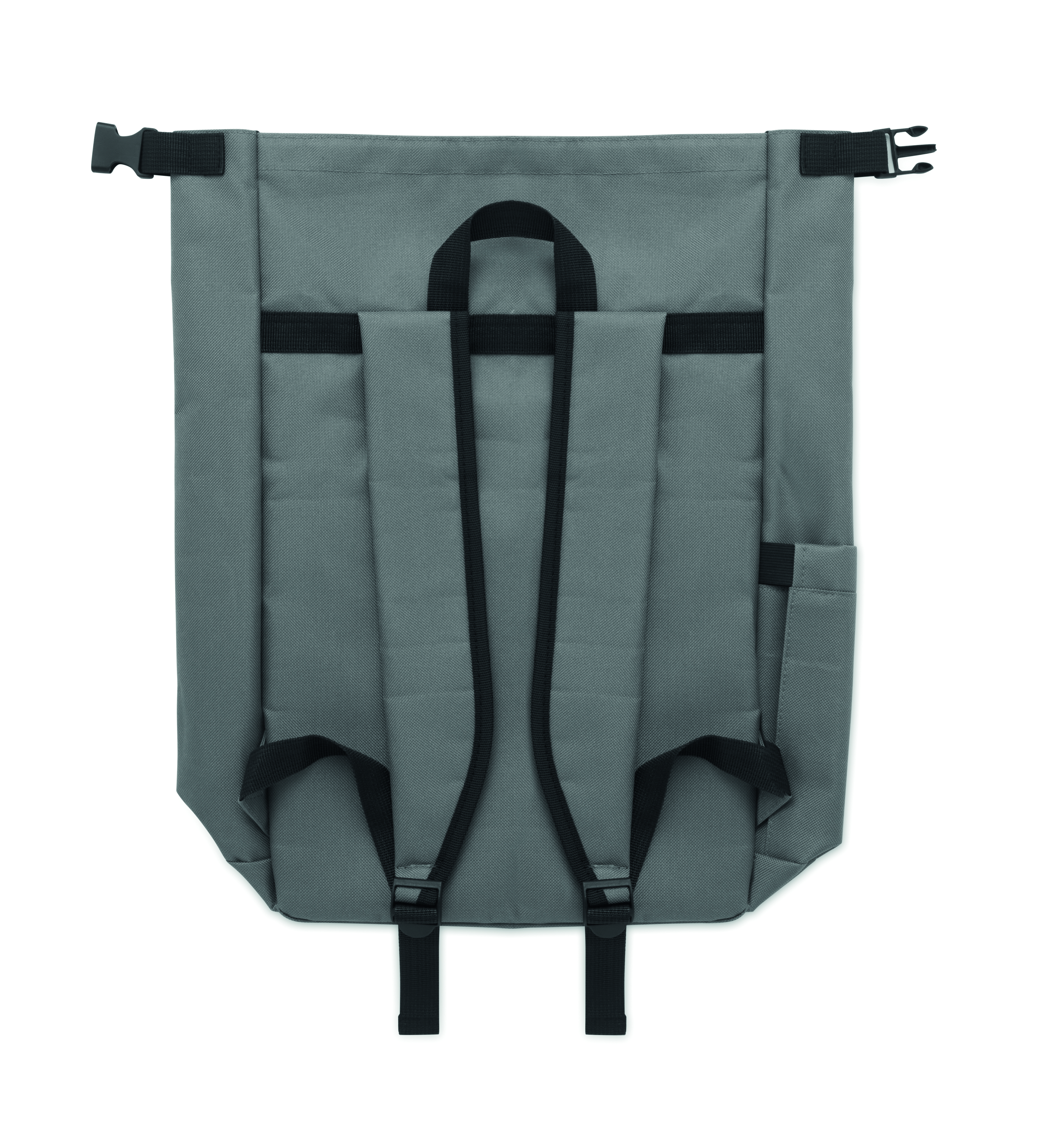 15-calowy plecak na laptopa wykonany z poliestru 600D RPET z wyściełaną podszewką 210D RPET. Posiada przednią kieszeń zapinaną na zamek, elastyczną kieszeń boczną i regulowane paski na ramiona.