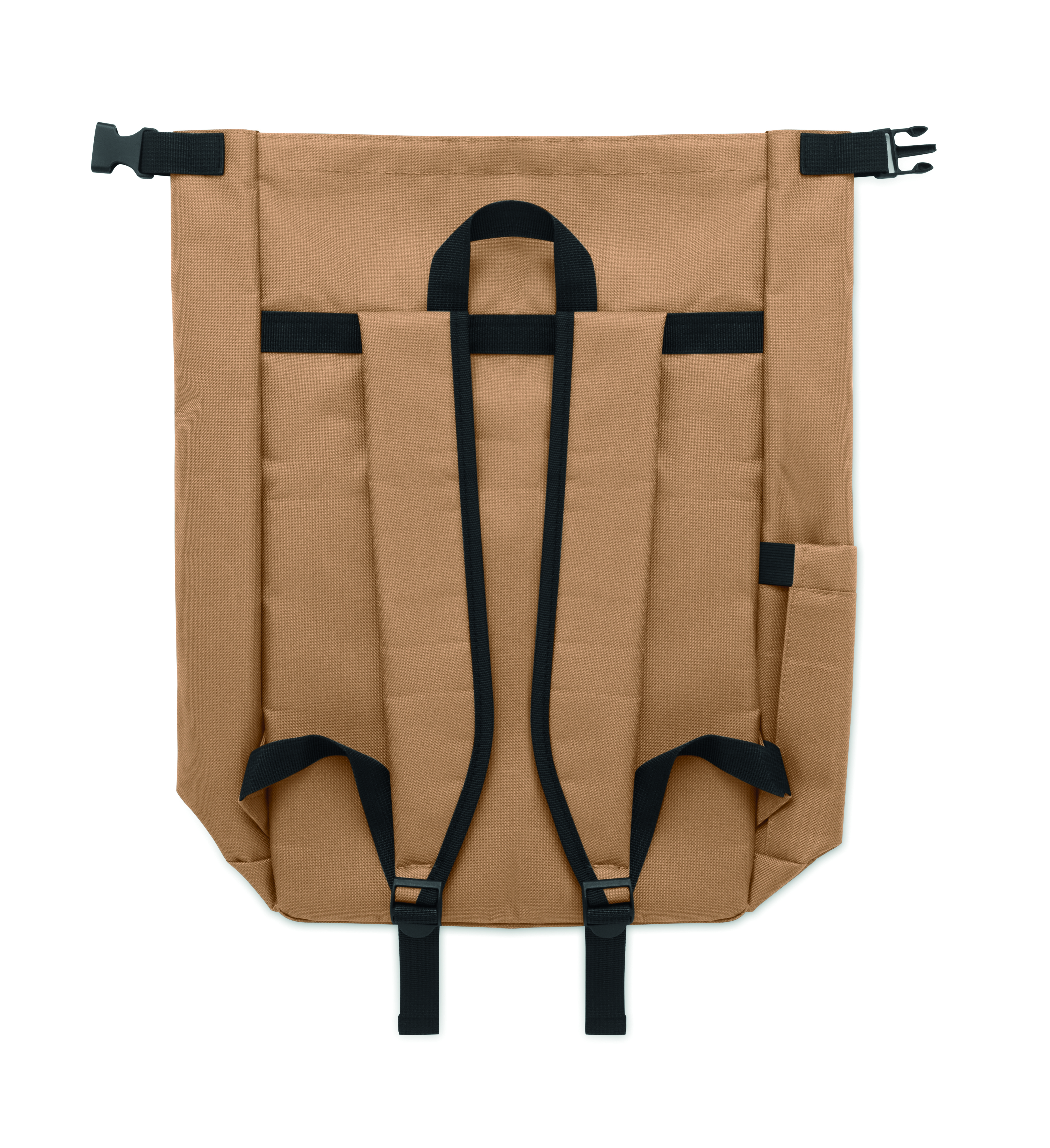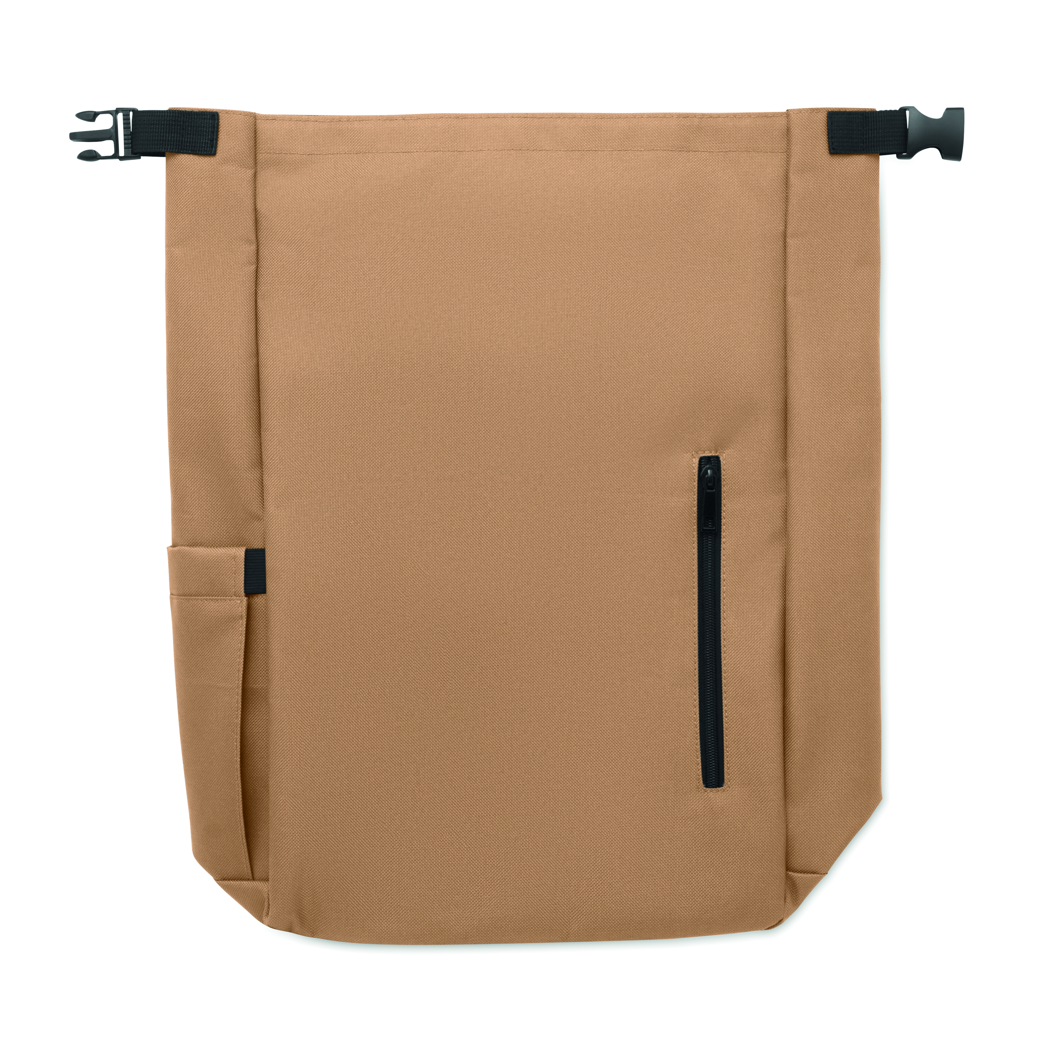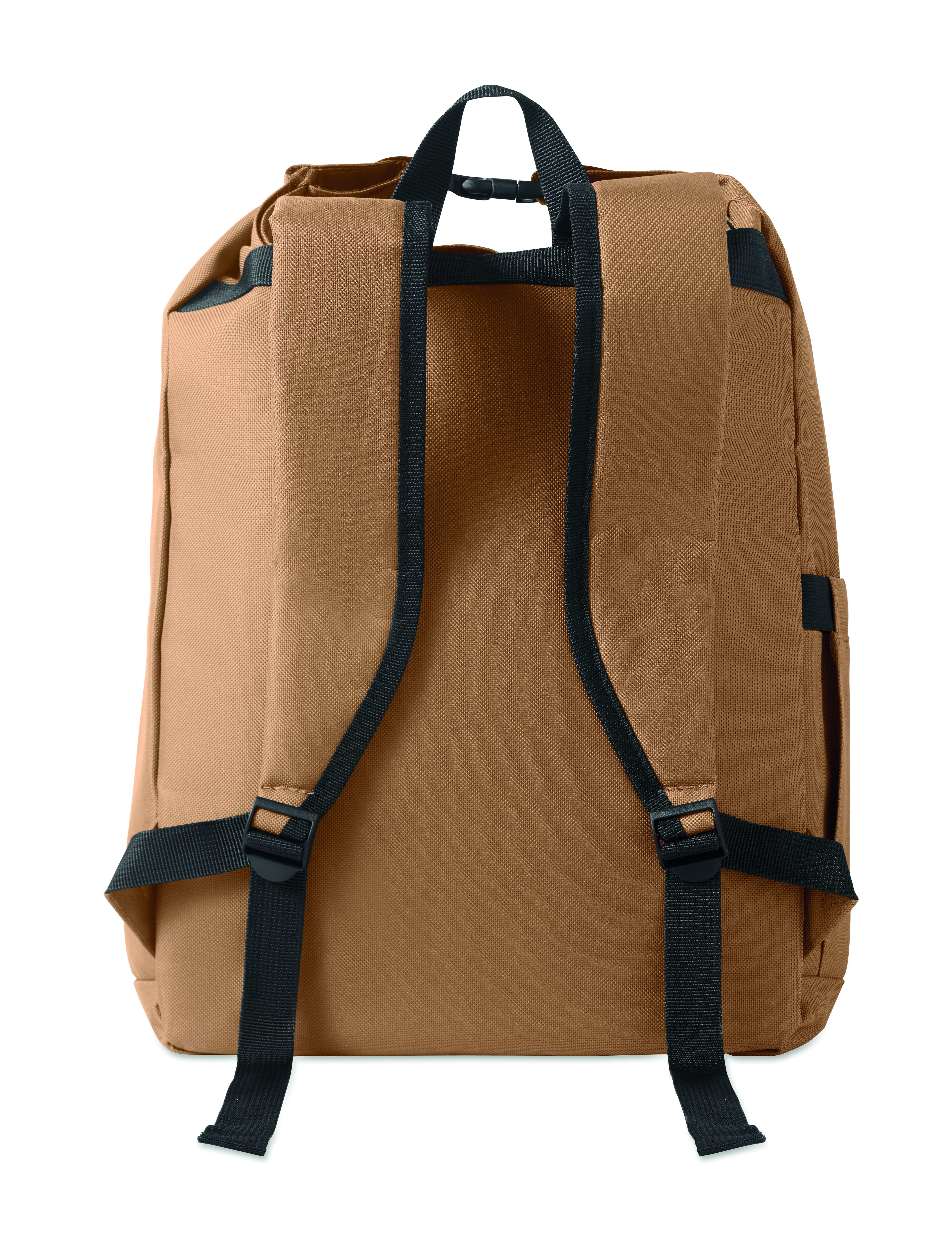 15-calowy plecak na laptopa wykonany z poliestru 600D RPET z wyściełaną podszewką 210D RPET. Posiada przednią kieszeń zapinaną na zamek, elastyczną kieszeń boczną i regulowane paski na ramiona.