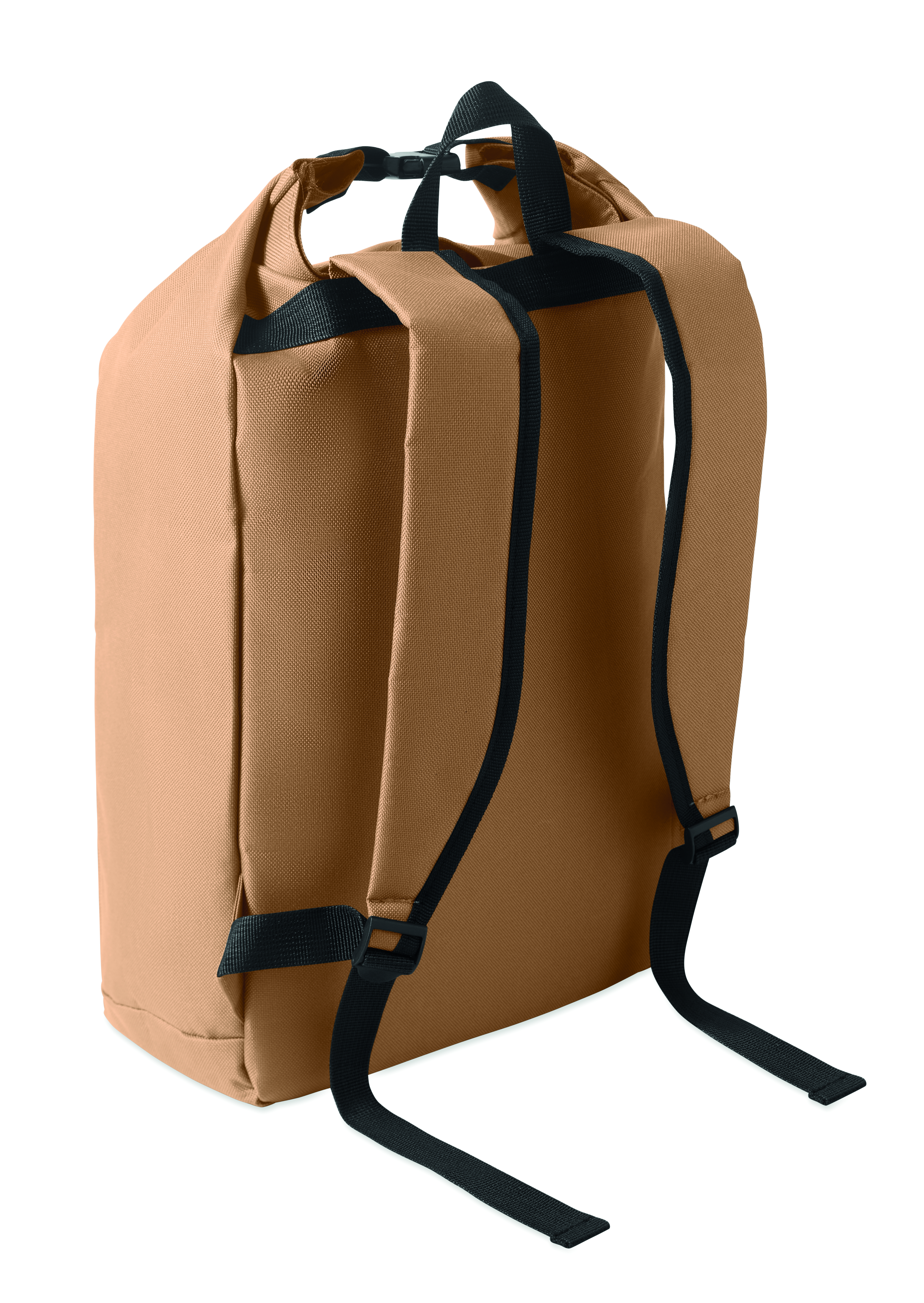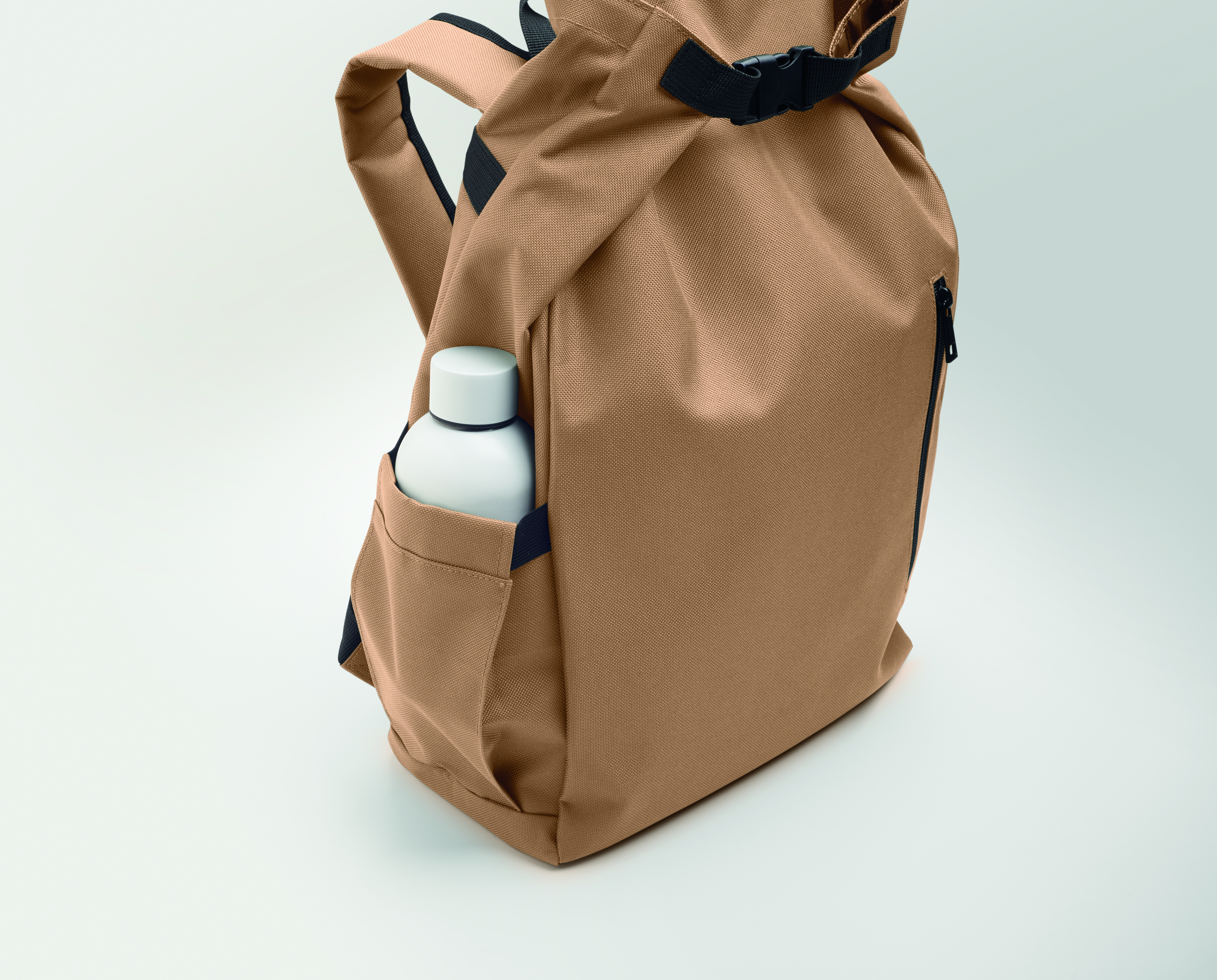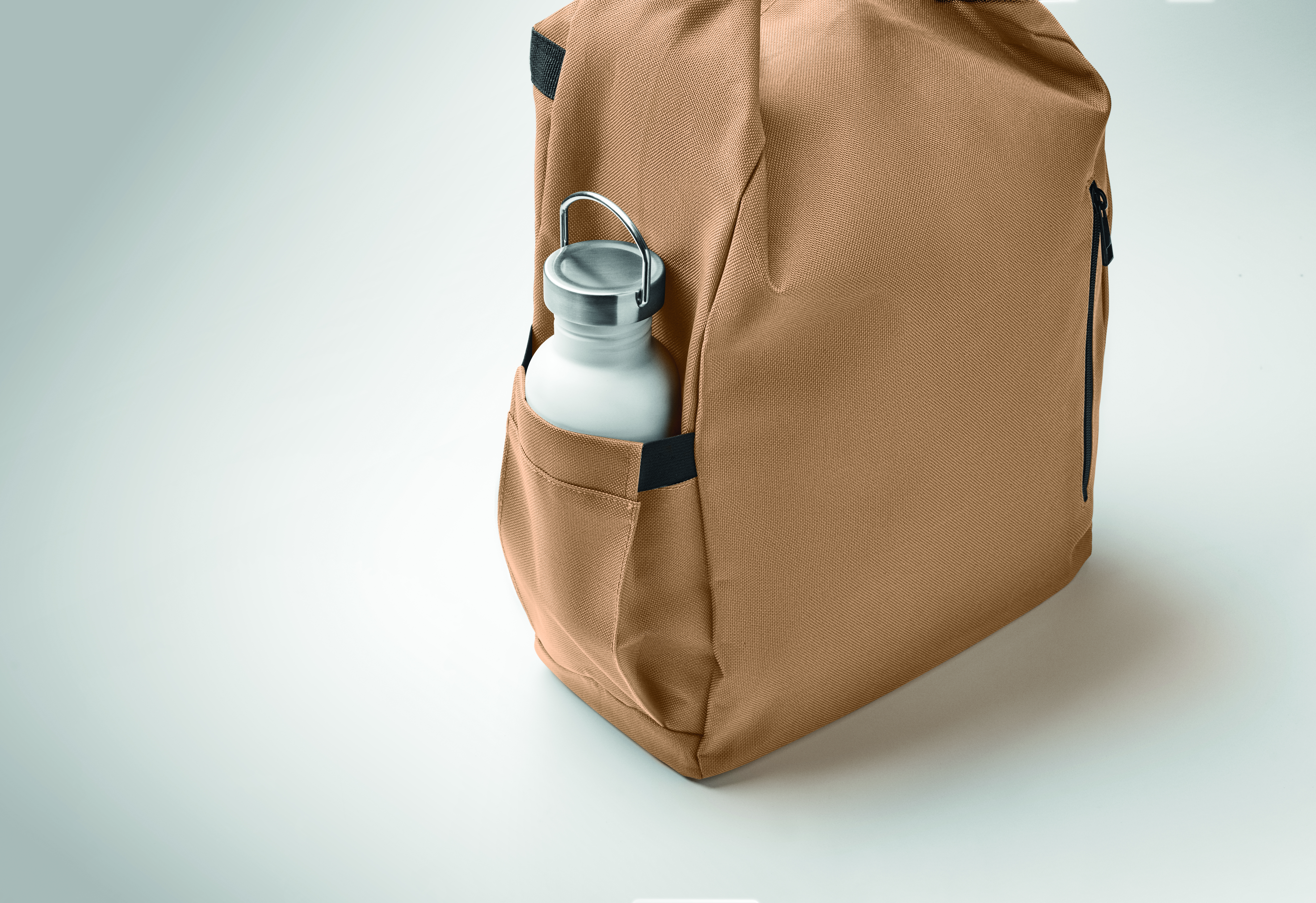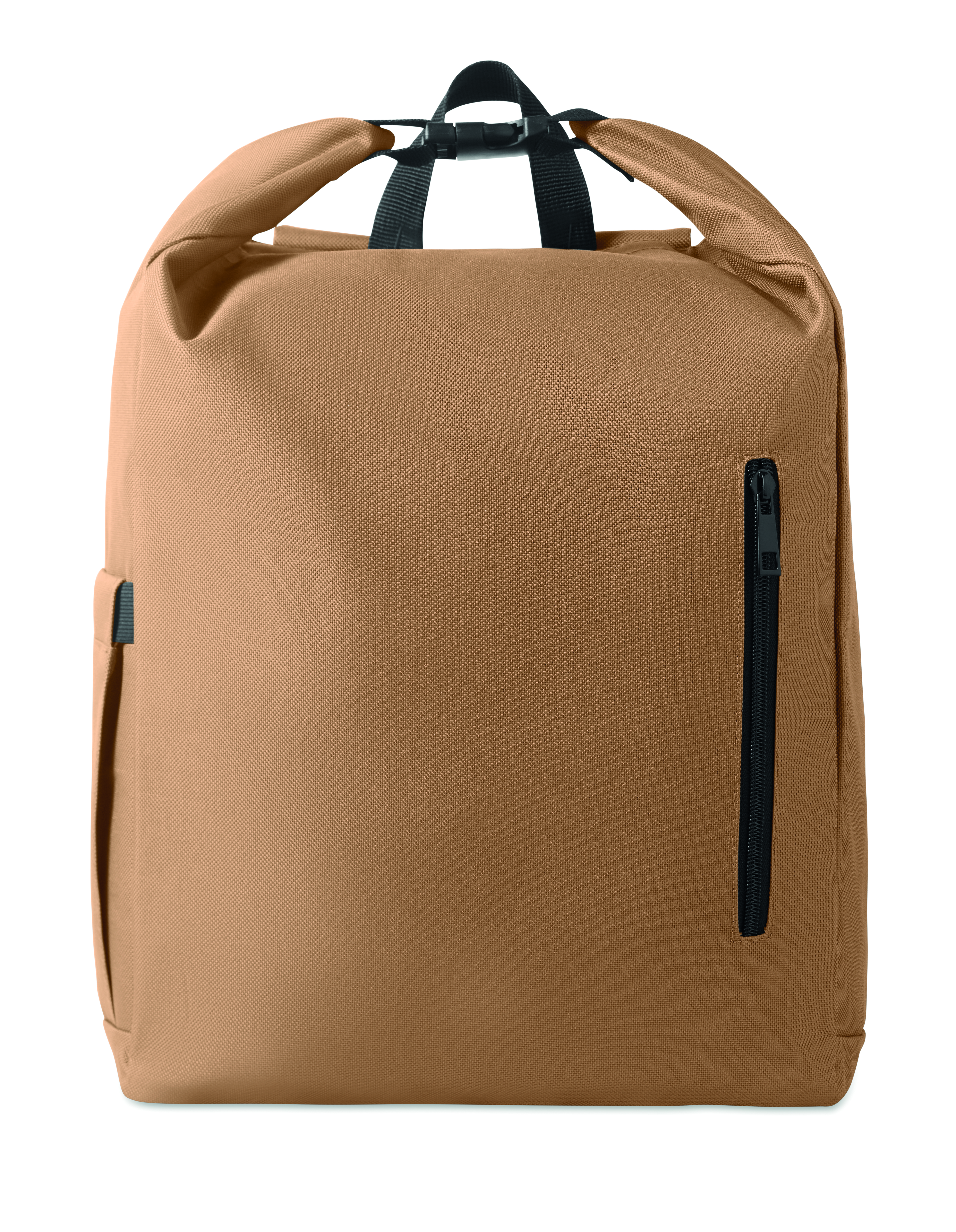 15-calowy plecak na laptopa wykonany z poliestru 600D RPET z wyściełaną podszewką 210D RPET. Posiada przednią kieszeń zapinaną na zamek, elastyczną kieszeń boczną i regulowane paski na ramiona.