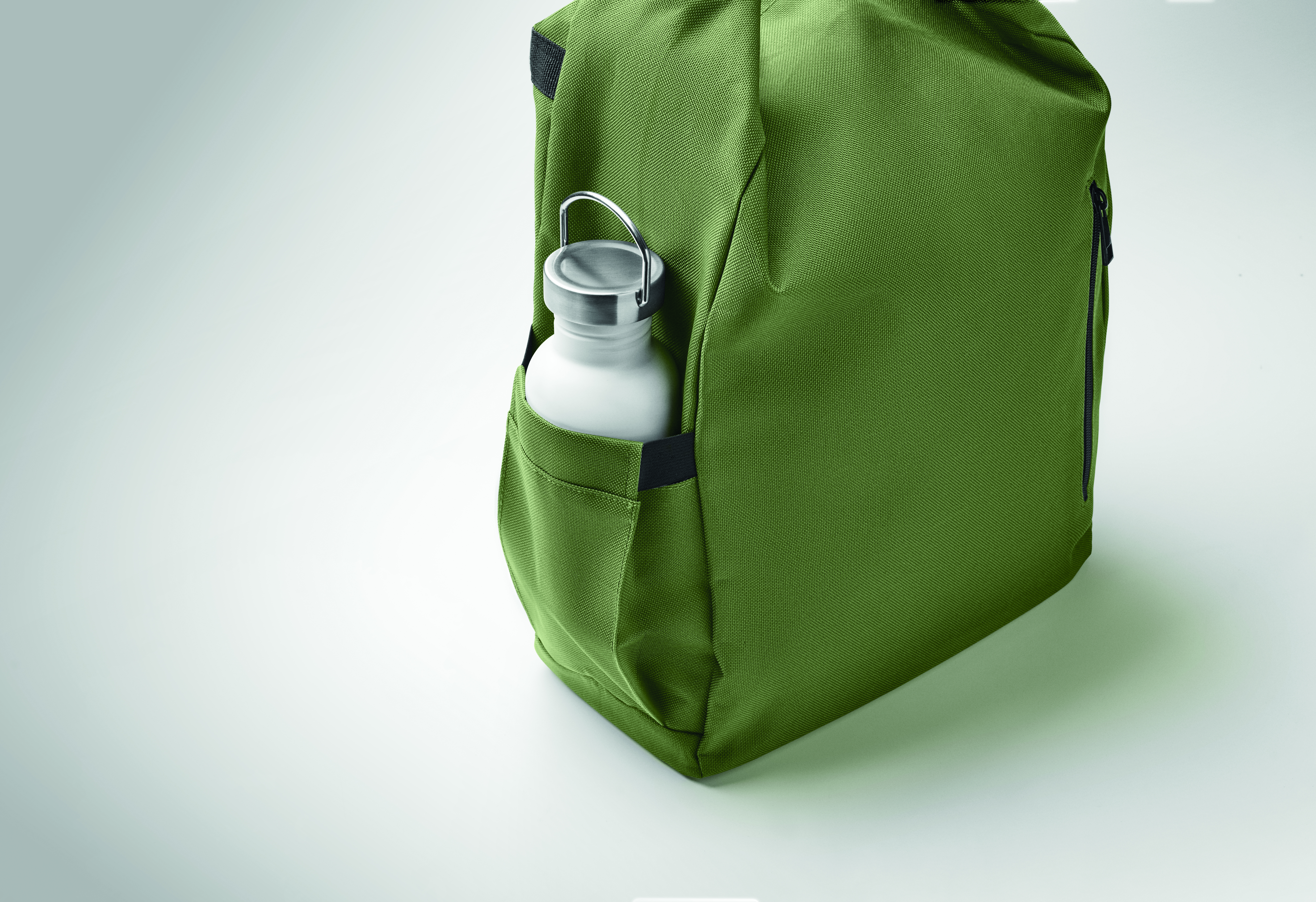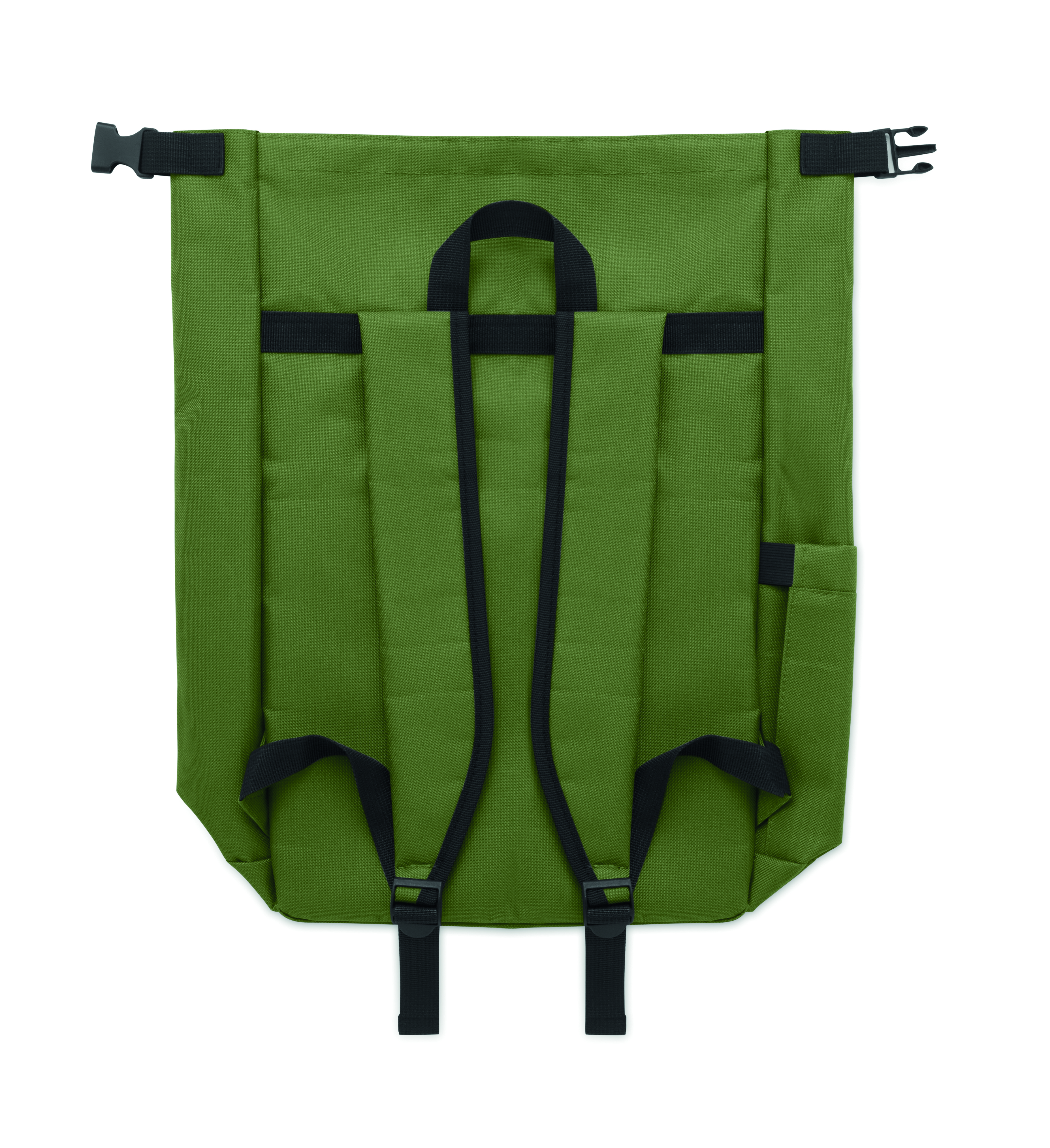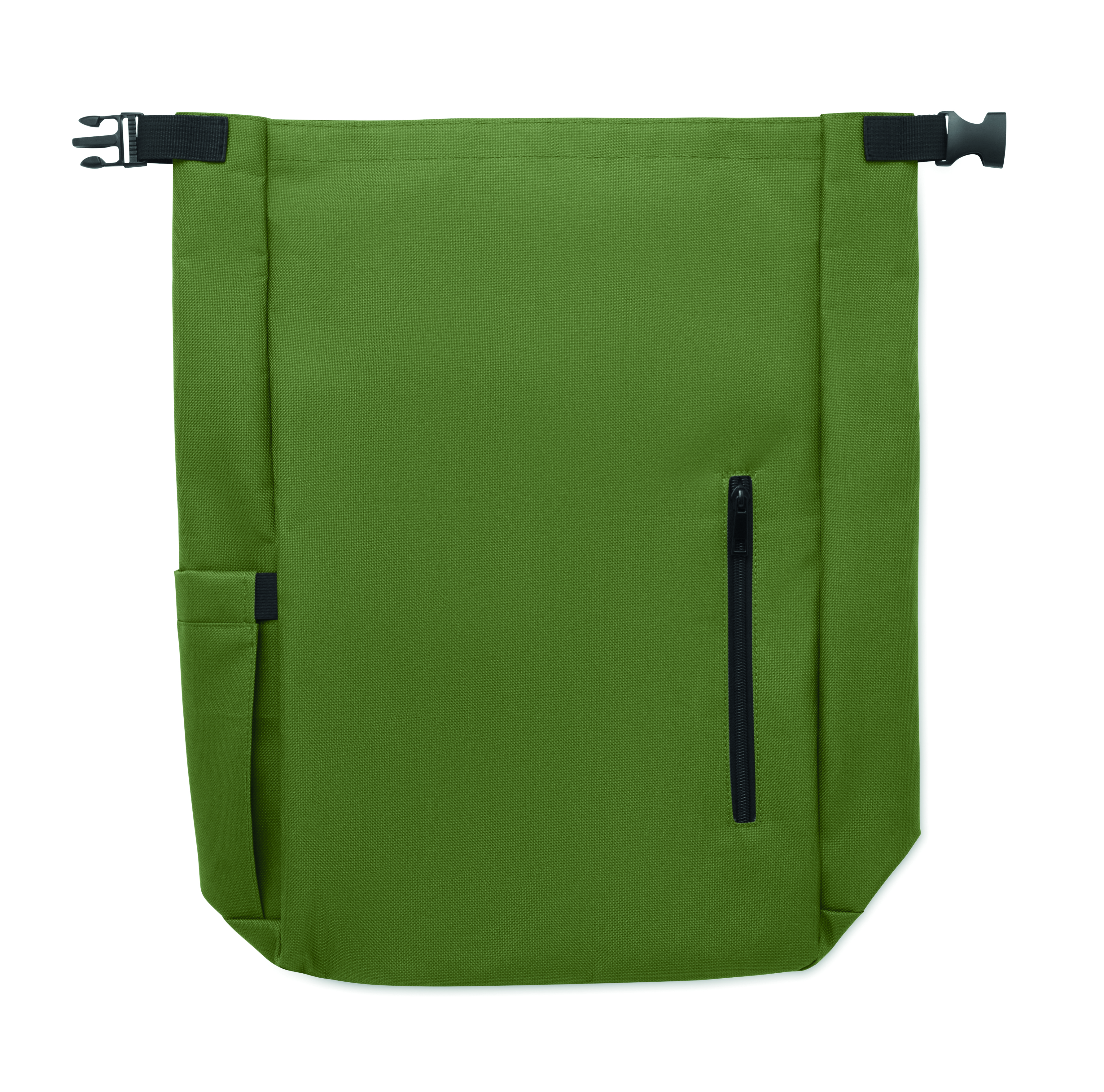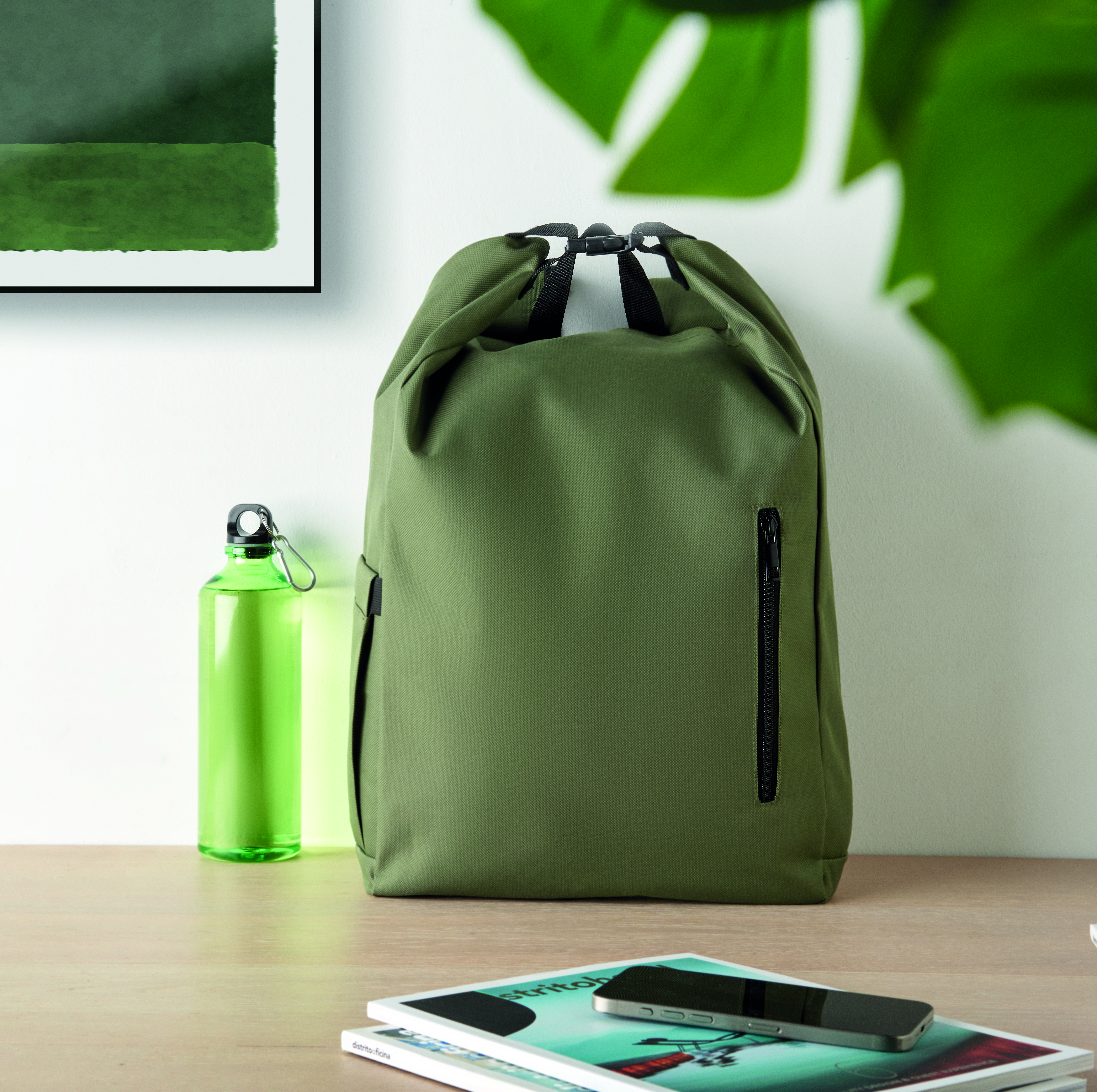 15-calowy plecak na laptopa wykonany z poliestru 600D RPET z wyściełaną podszewką 210D RPET. Posiada przednią kieszeń zapinaną na zamek, elastyczną kieszeń boczną i regulowane paski na ramiona.