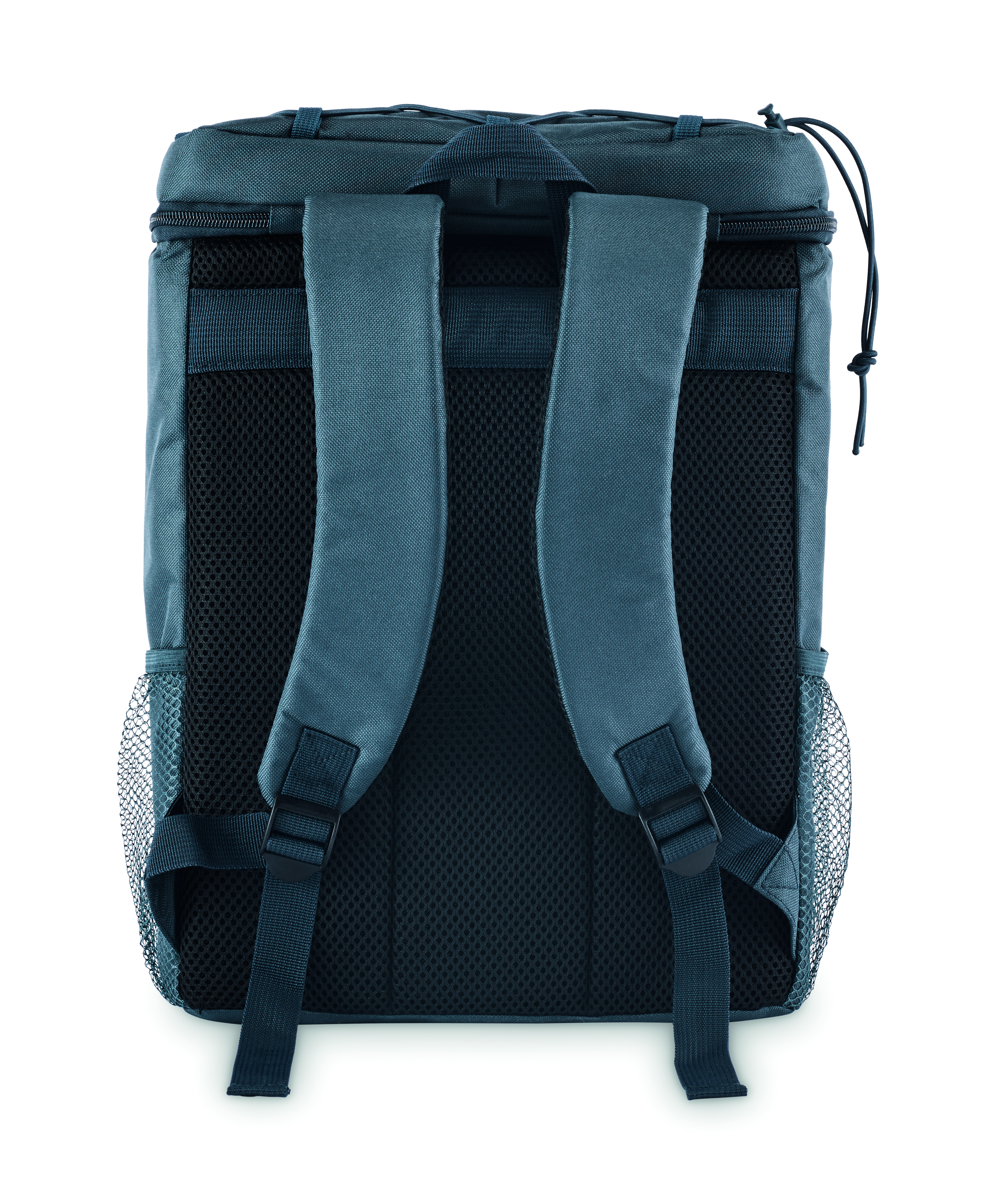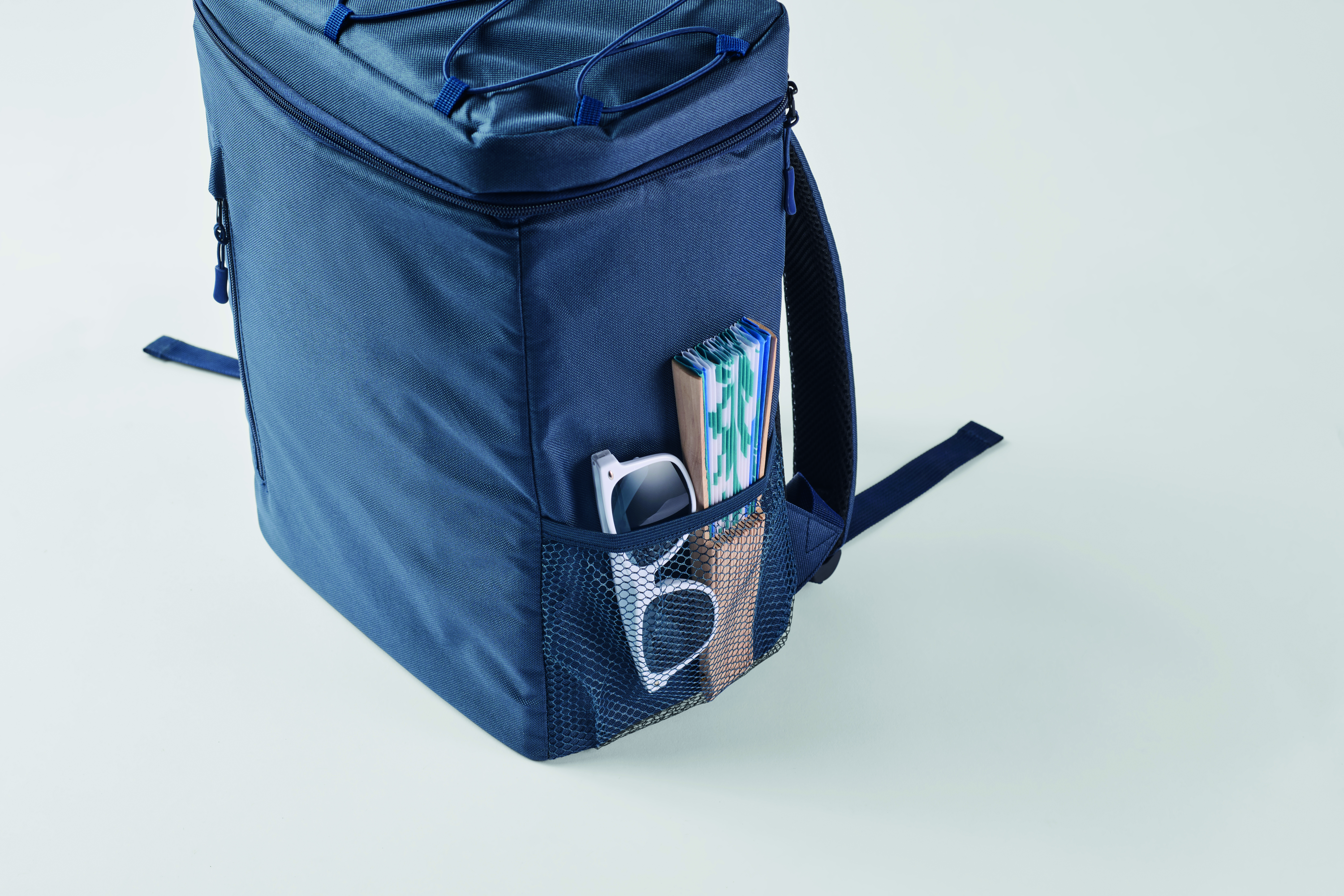 Plecak chłodzący z poliestru 600D RPET z wyściełanymi regulowanymi paskami na ramiona, podszewką PEVA i pianką PE o grubości 5 mm. Ma przednią kieszeń i dwie boczne kieszenie z siatki. Pojemność: 9 l.