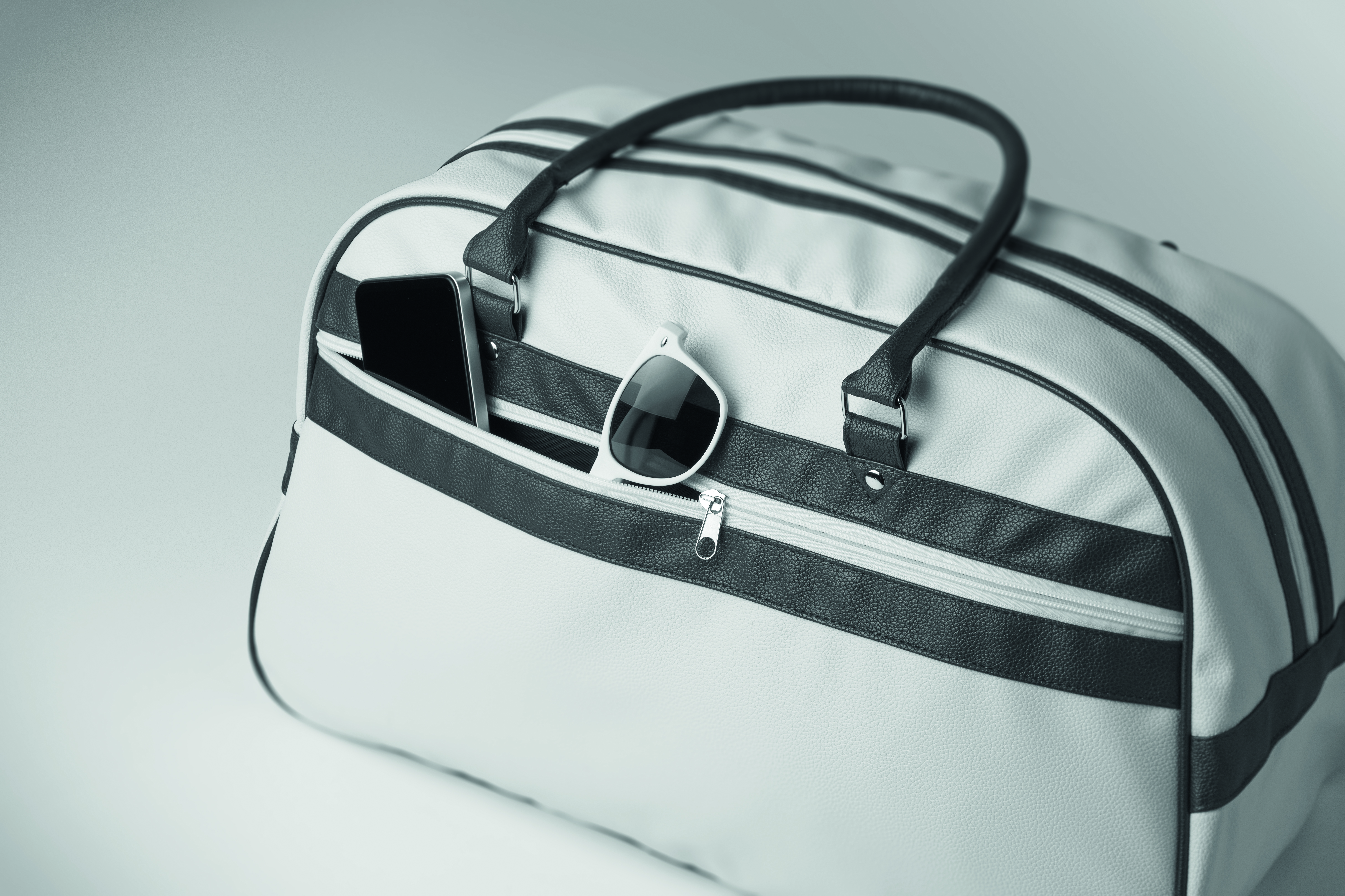 Torba sportowa z PU, wewnętrzna podszewka, komora główna i kieszeń zapinana na suwak, solidne uchwyty, wkładka dolna i ćwieki. Pojemność ok. 21,5 litra.