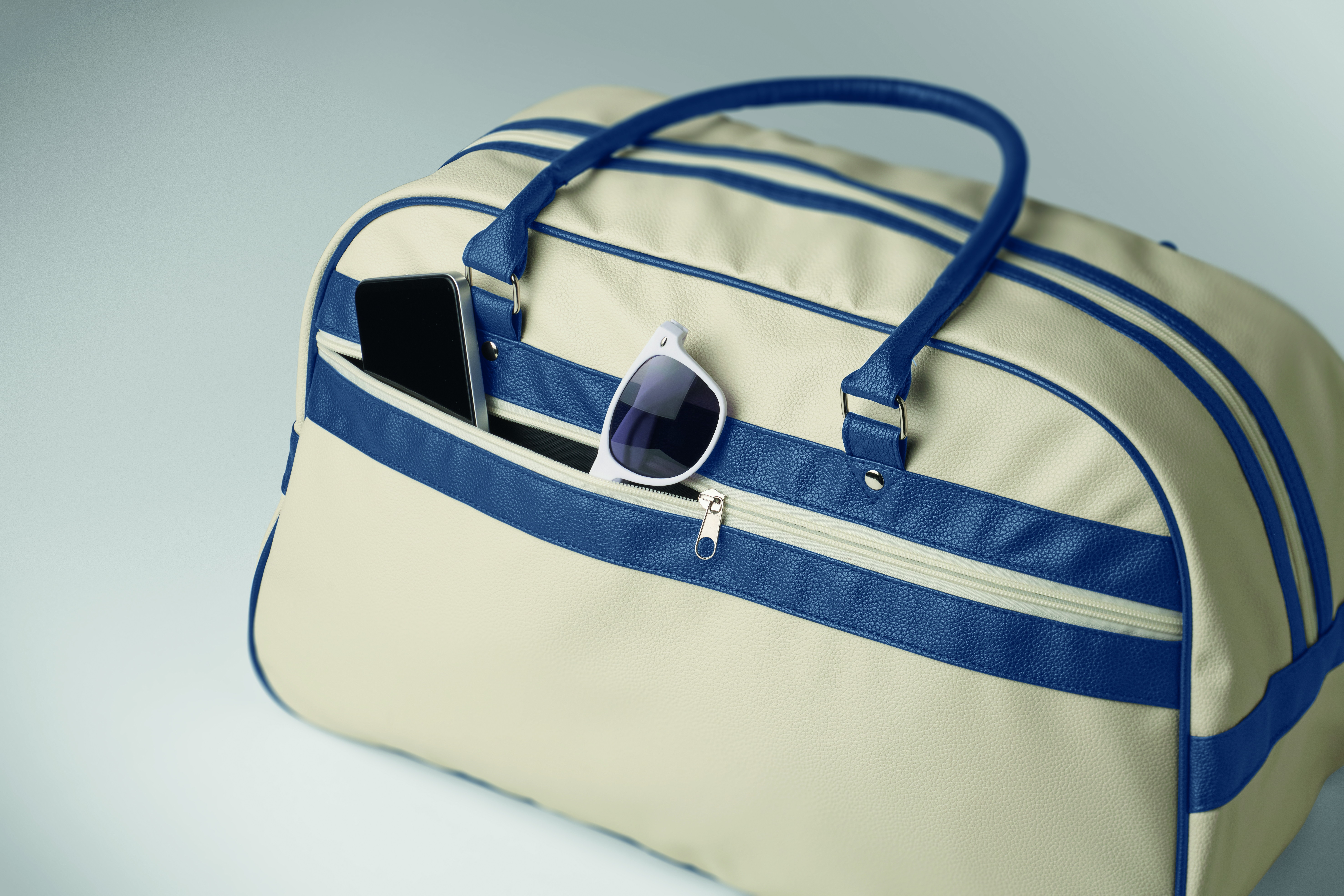 Torba sportowa z PU, wewnętrzna podszewka, komora główna i kieszeń zapinana na suwak, solidne uchwyty, wkładka dolna i ćwieki. Pojemność ok. 21,5 litra.