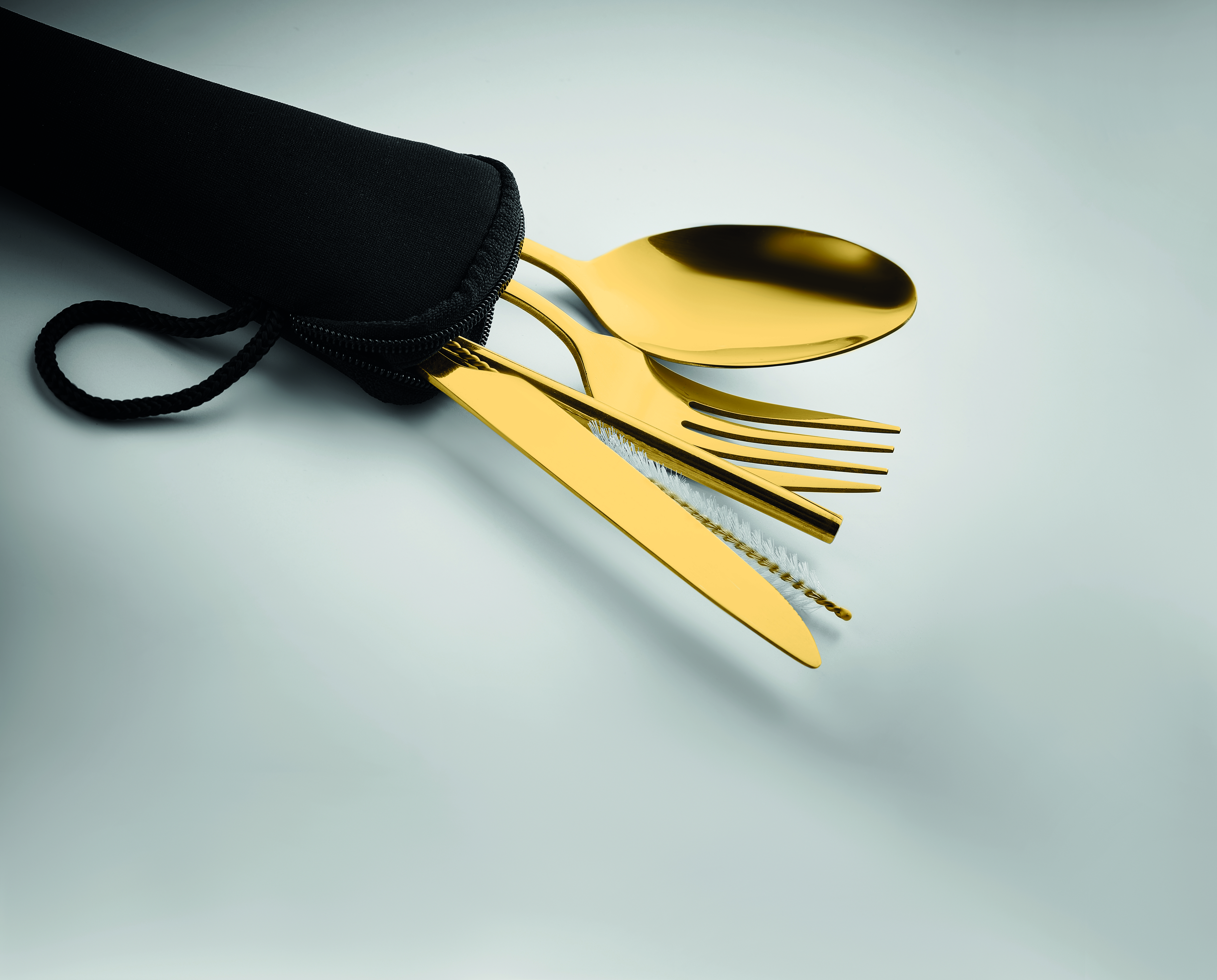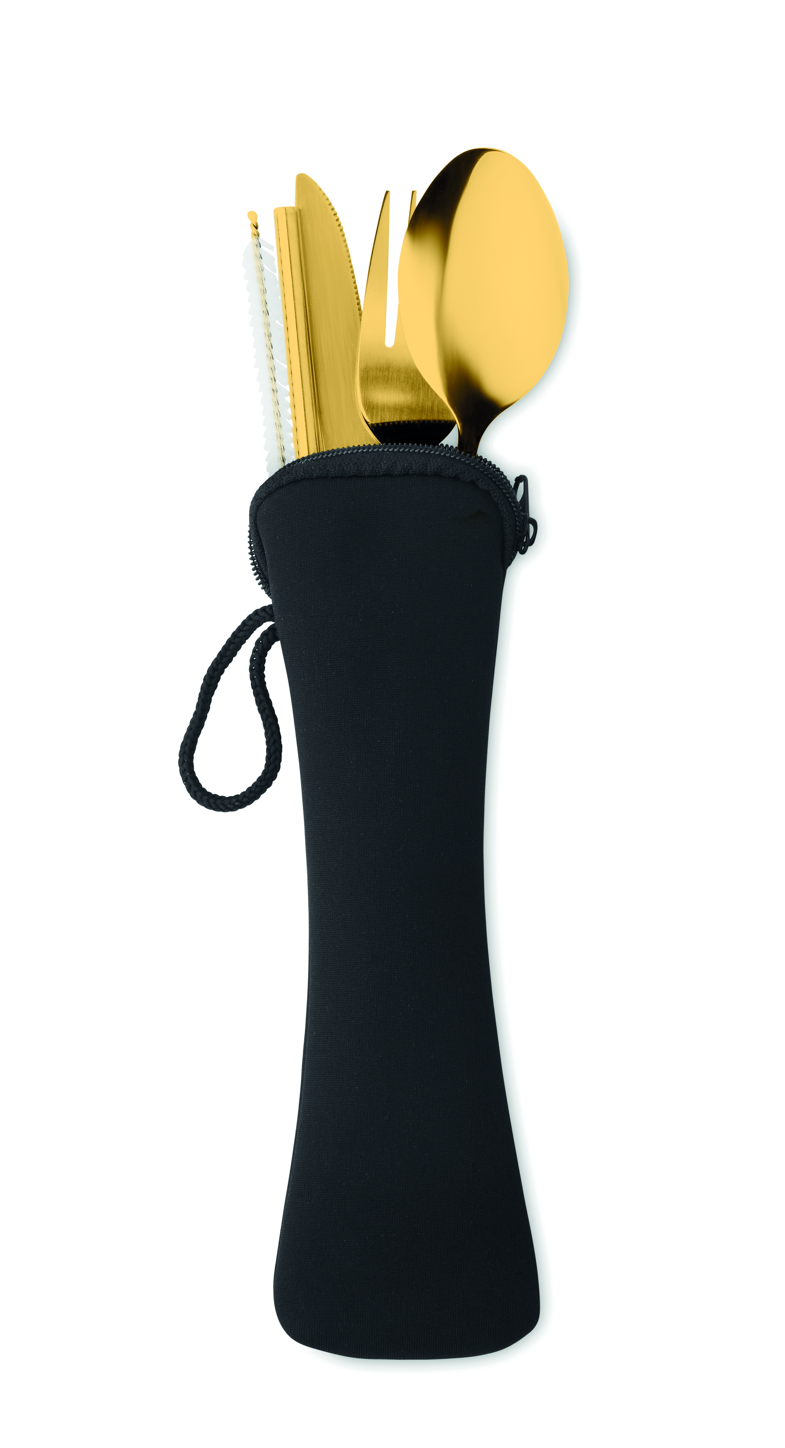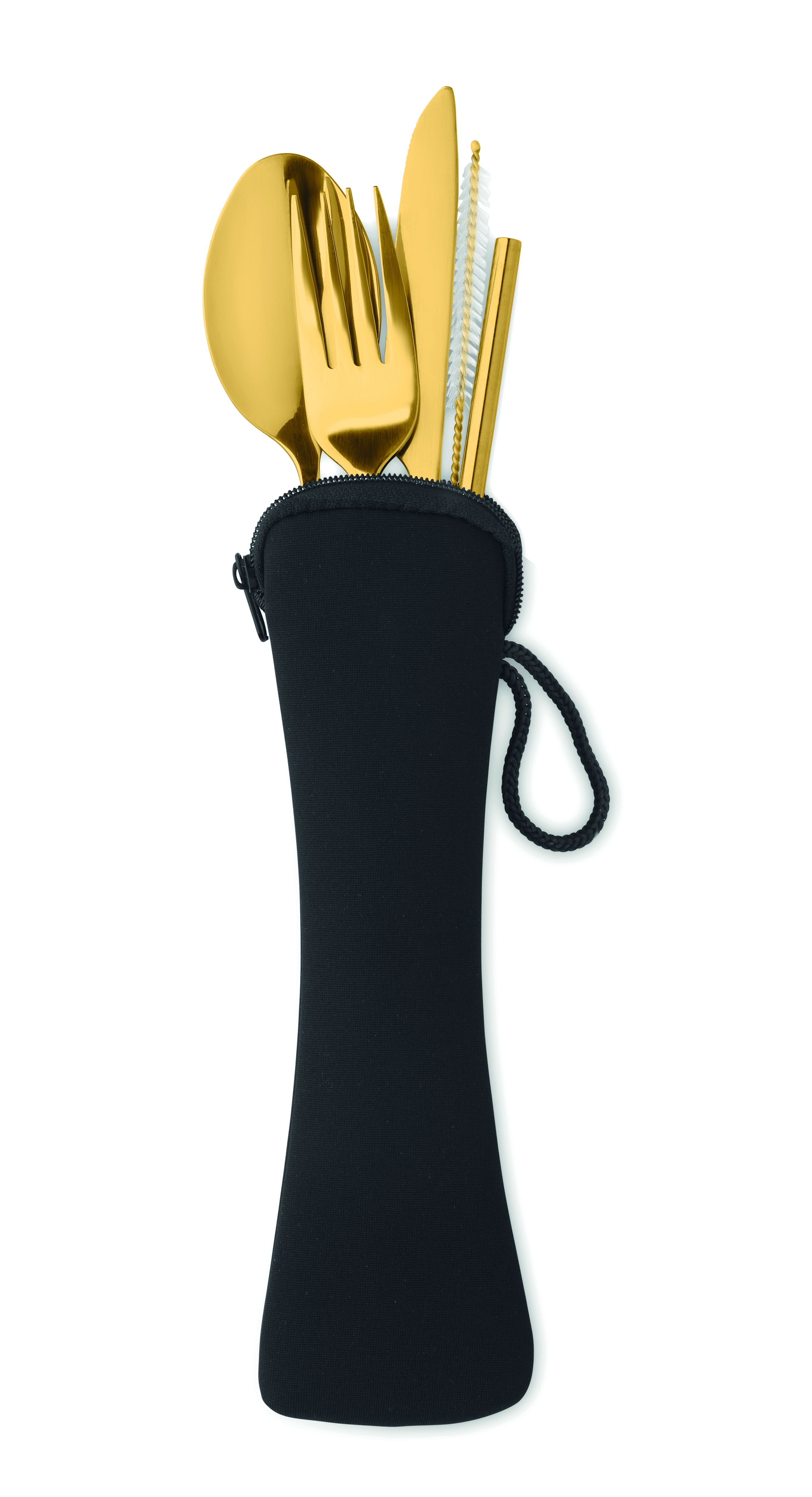 Zestaw sztućców ze stali nierdzewnej wielokrotnego użytku, w tym widelec, nóż, łyżka, słomka i szczotka w etui z neoprenu.