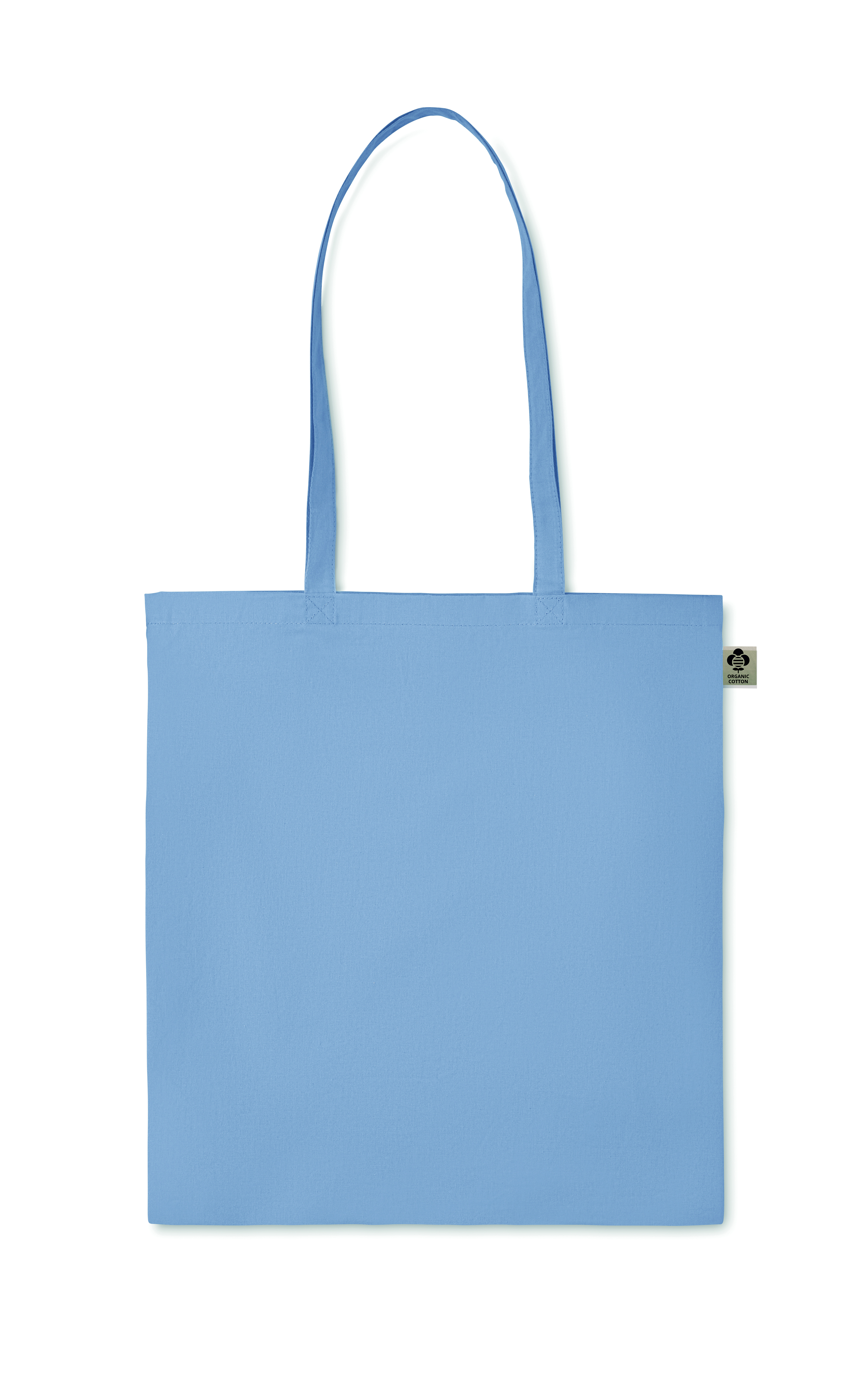 Torba na zakupy z bawełny organicznej z długimi uchwytami. Klasyczna torba na ramię przeznaczona do przenoszenia codziennych artykułów spożywczych lub innych przedmiotów. Noś torbę w rękach lub na ramieniu za pomocą długich uchwytów. Uszyta w 100% z naturalnej bawełny organicznej 140 gr / m².