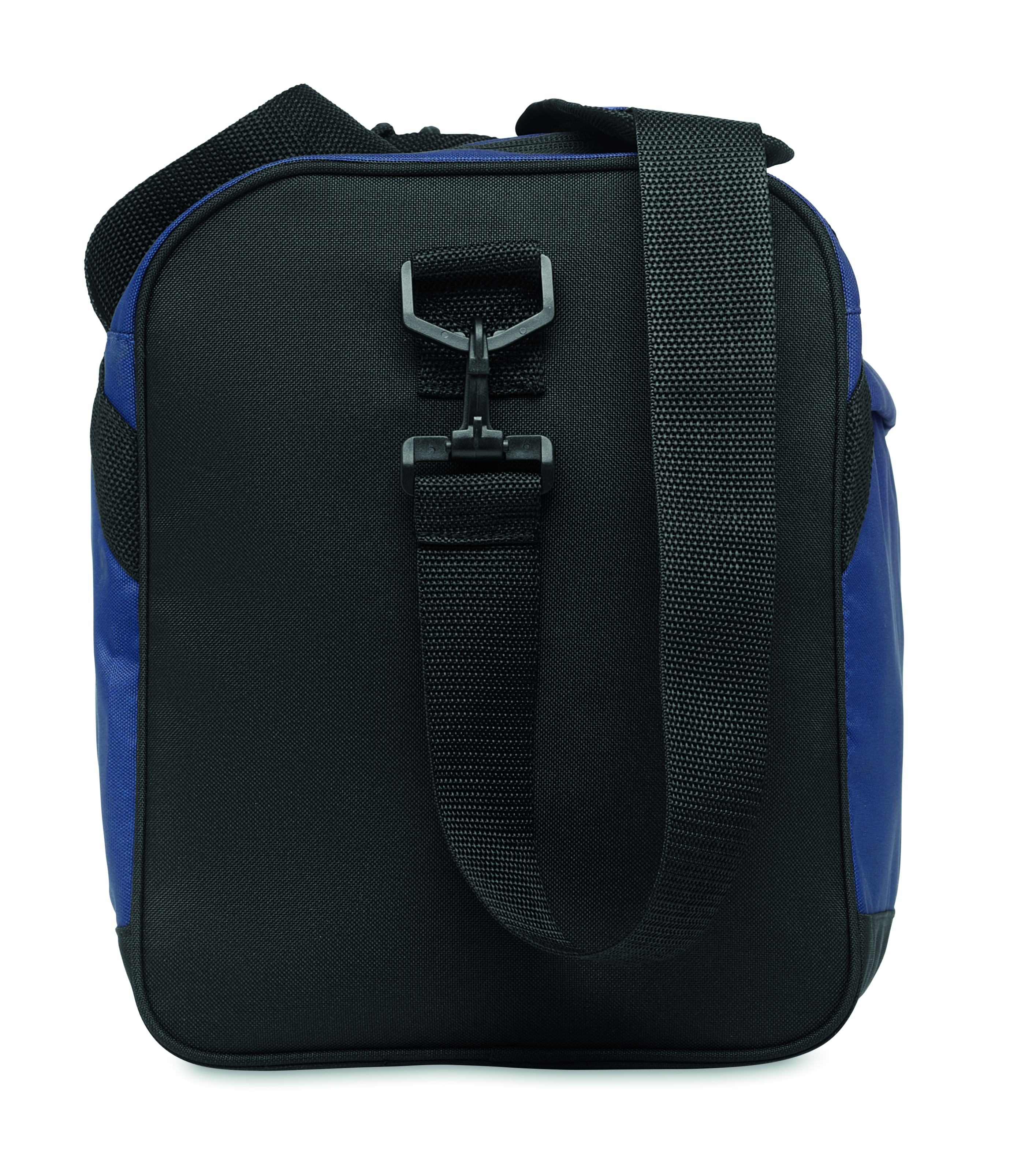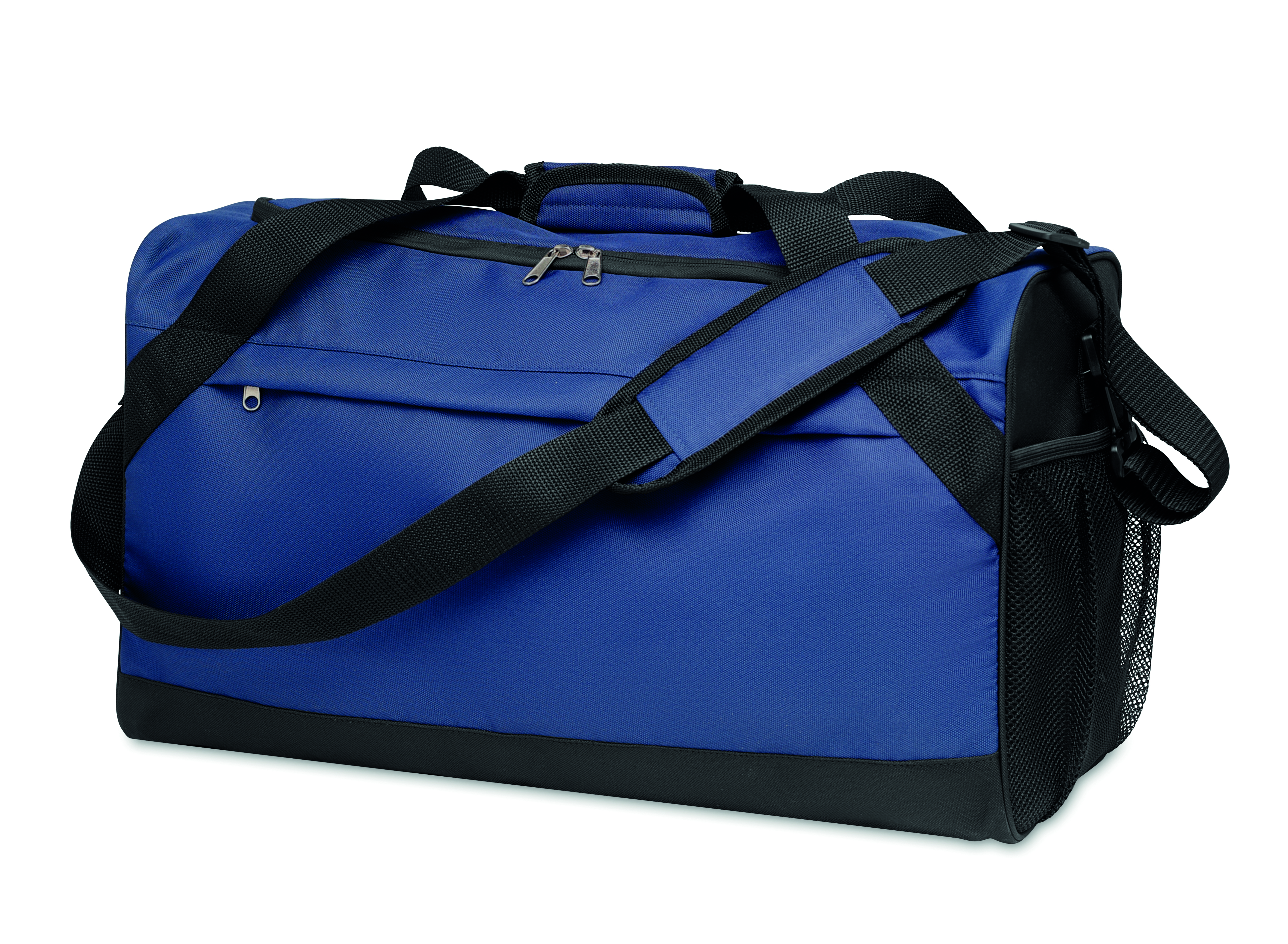 Torba sportowa lub podróżna z 600D RPET z dużą przednią kieszenią zapinaną na zamek, wewnętrzną kieszenią zapinaną na zamek oraz regulowanym i odpinanym paskiem na ramię.