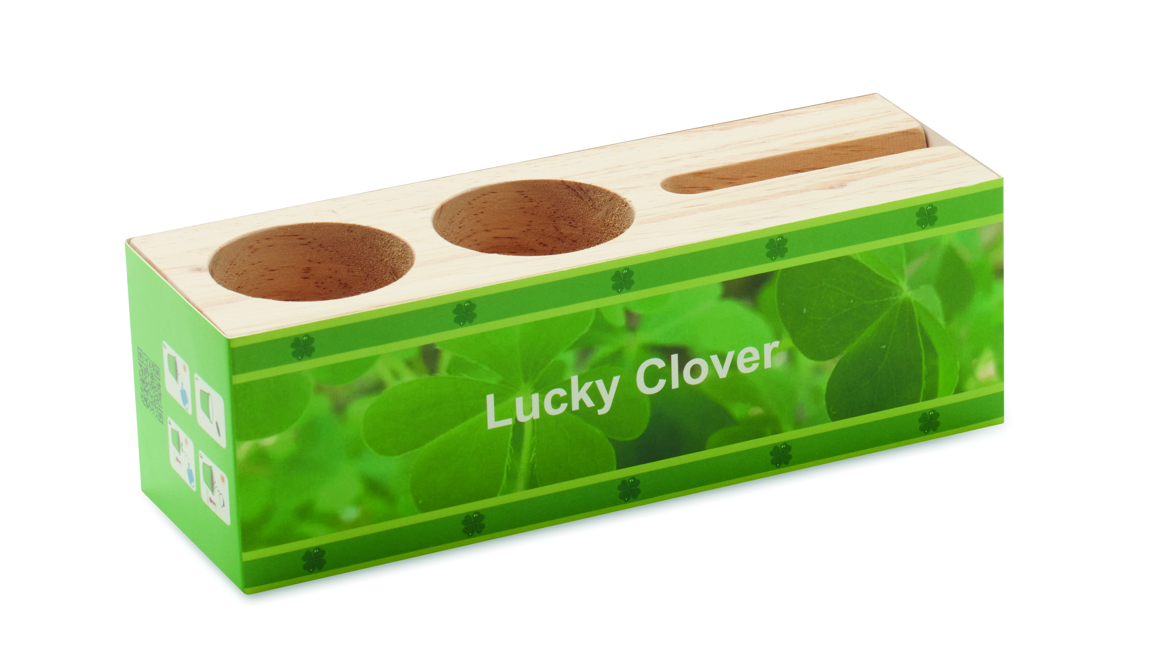 Drewniany stojak na biurko z uchwytem na długopis i telefon oraz nasionami koniczyny. Wnieś trochę życia i zieleni do swojego biura lub domu dzięki tej oryginalnej dekoracji na biurko, lub stół. Zasadź nasiona, a koniczyna sama wyrośnie. Może zaskoczy Cię kilka czterolistnych koniczynek na szczęście? Drewno jest produktem naturalnym, mogą wystąpić niewielkie różnice w kolorze i rozmiarze poszczególnych elementów, co może mieć wpływ na ostateczny efekt dekoracji. Krążek torfowy w zestawie. FSC®-certified | FSC 100%, W13.2, FSC-C213206