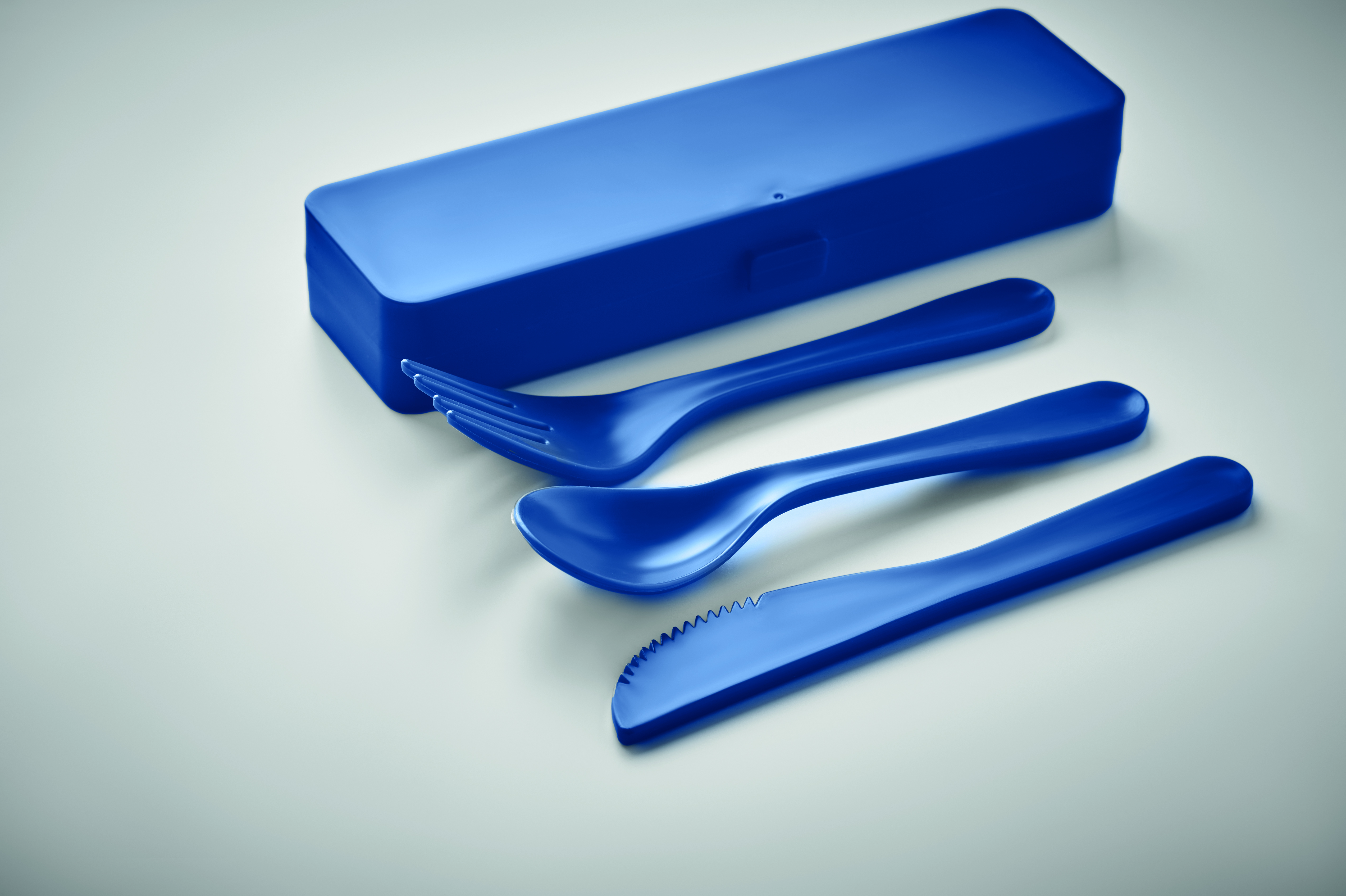 Zestaw przenośnych sztućców z PP wielokrotnego użytku i z etui. Zawiera łyżkę, widelec i nóż.