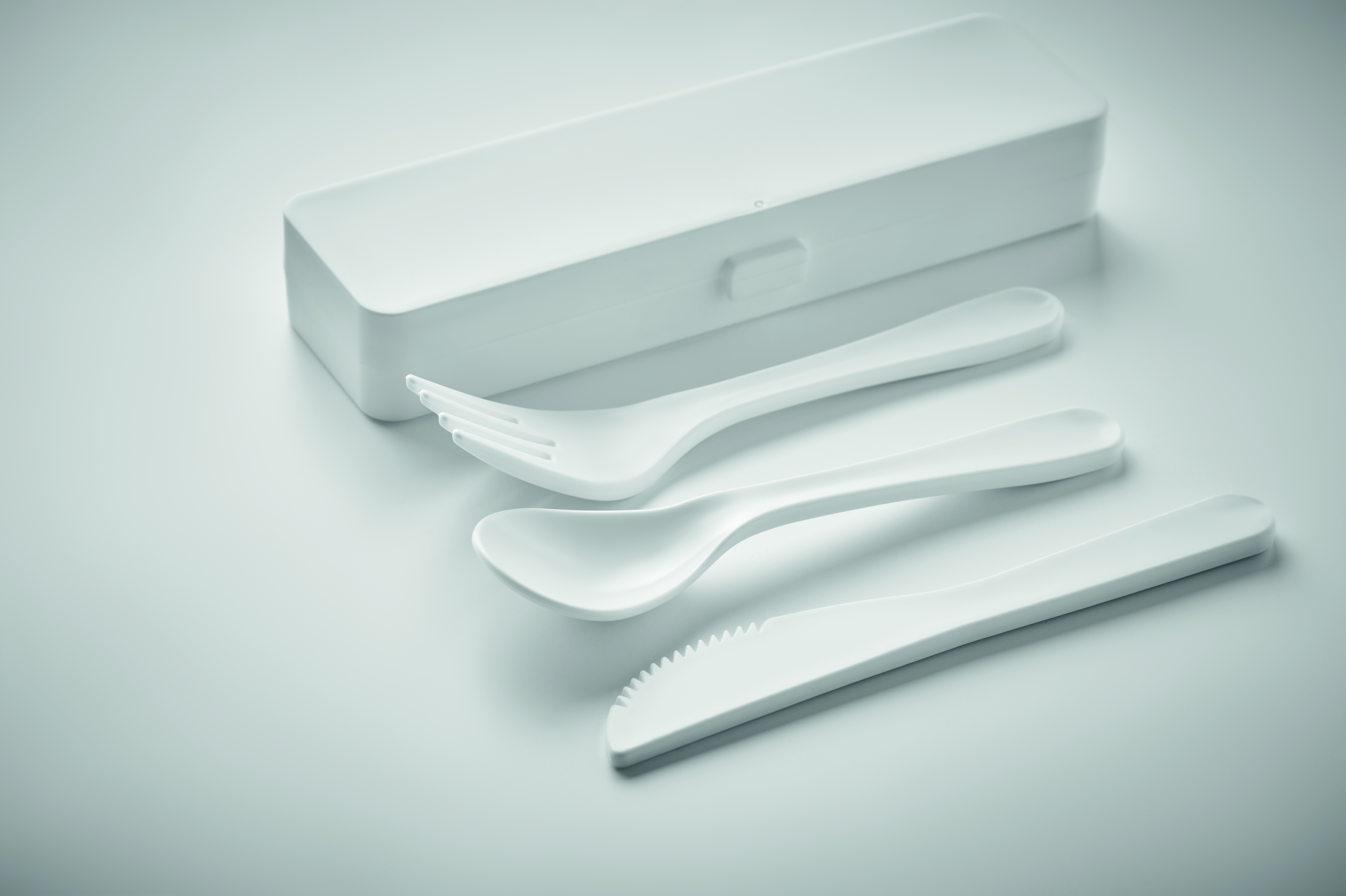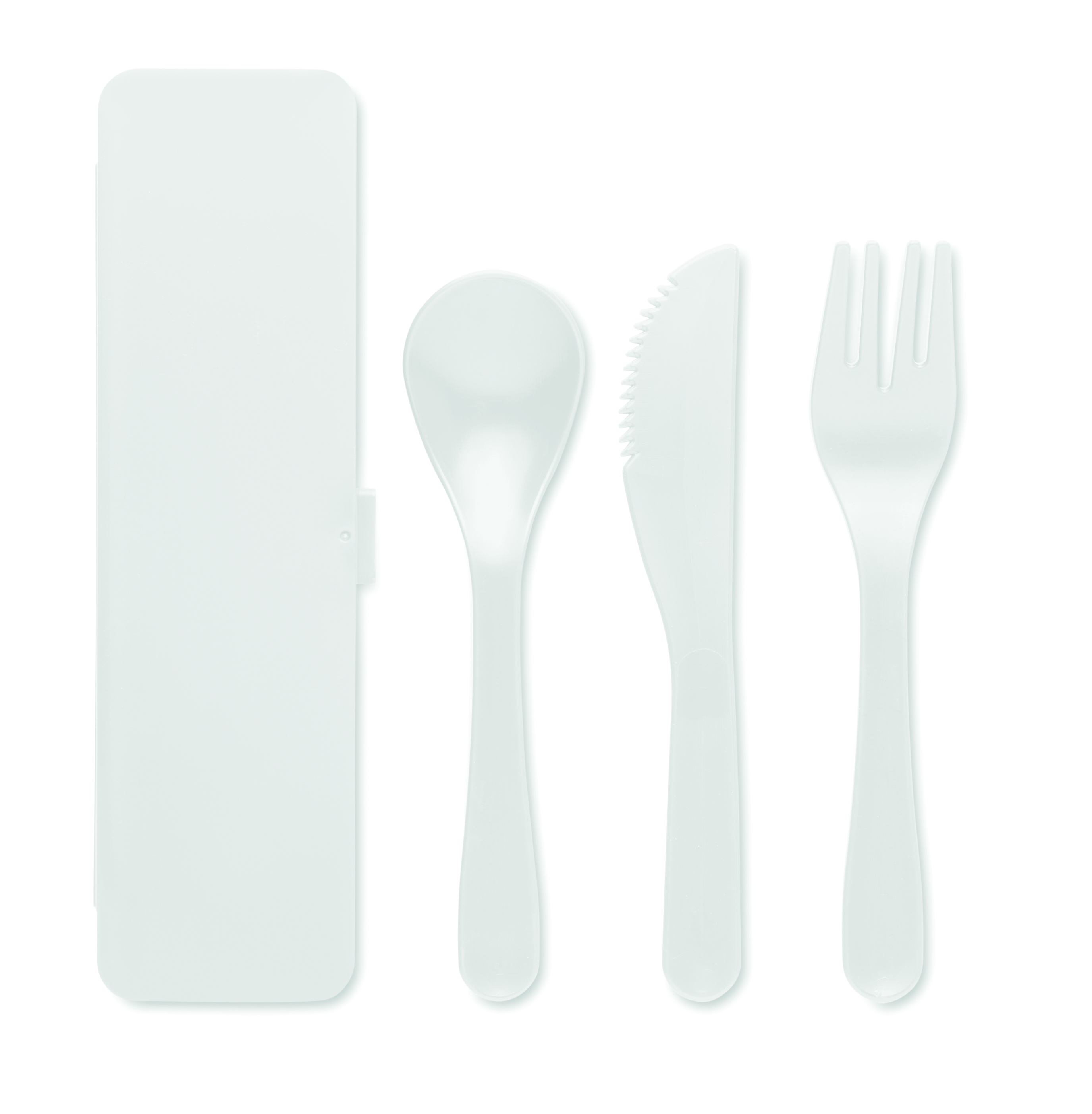 Zestaw przenośnych sztućców z PP wielokrotnego użytku i z etui. Zawiera łyżkę, widelec i nóż.