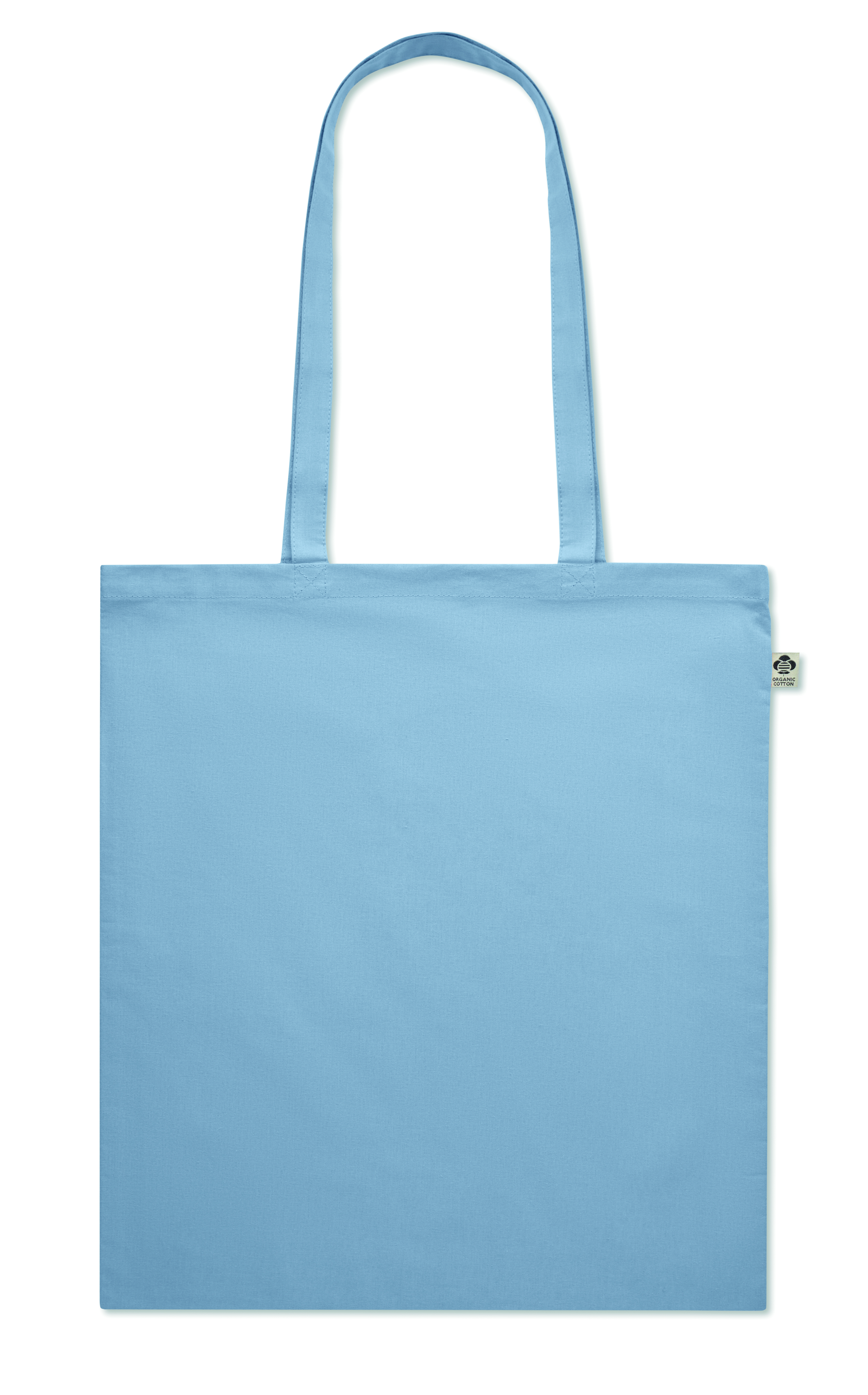 Torba na zakupy z bawełny organicznej z długimi uchwytami. 180 gr/m². Wyprodukowana zgodnie z certyfikowanym standardem dotyczącym stosowania szkodliwych substancji w tekstyliach.