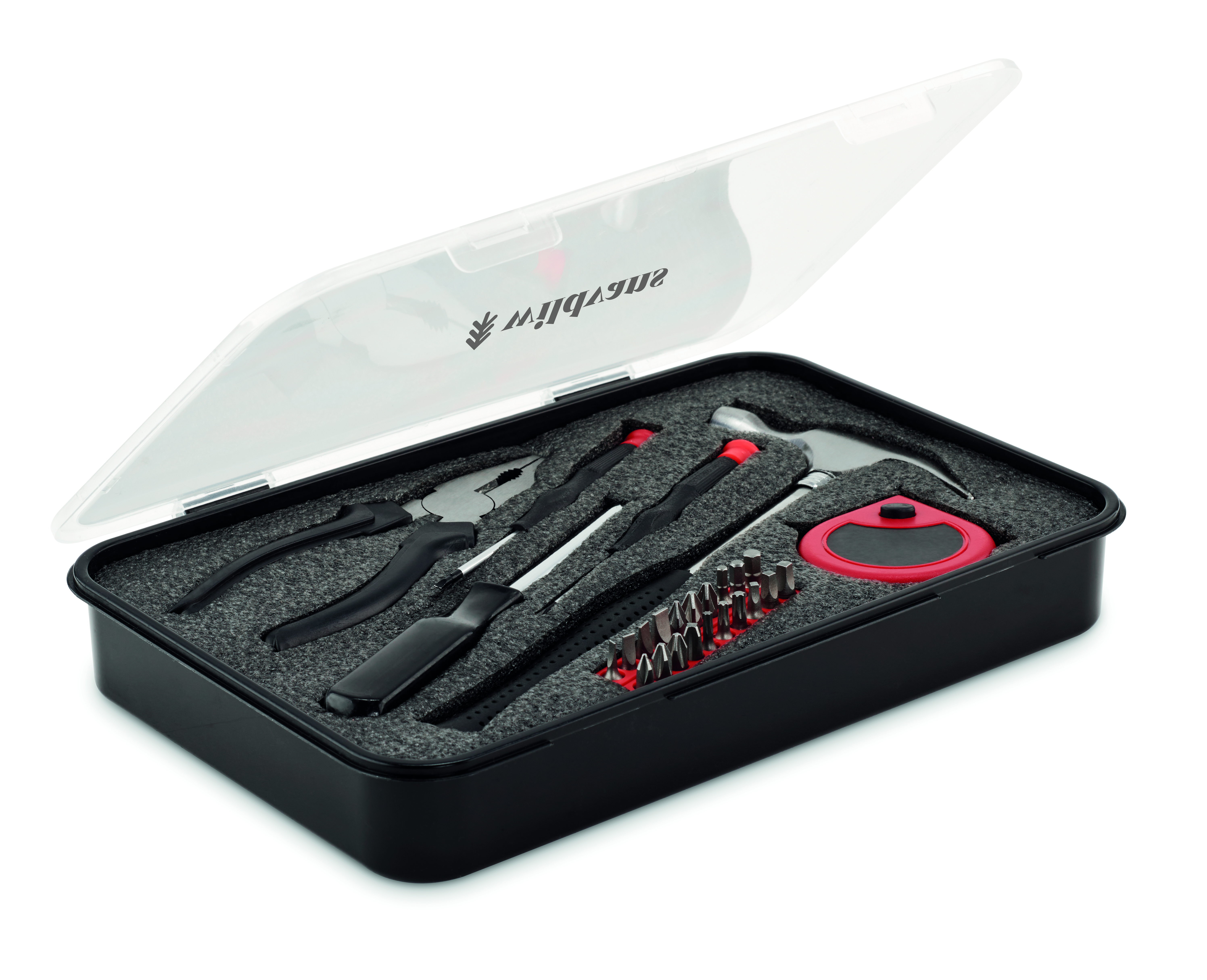 25-częściowy zestaw narzędzi w pudełku PP, w tym młotek, taśma miernicza, kombinerki, 20 końcówe, uchwyt do końcówek i 2 wkrętaki precyzyjne.