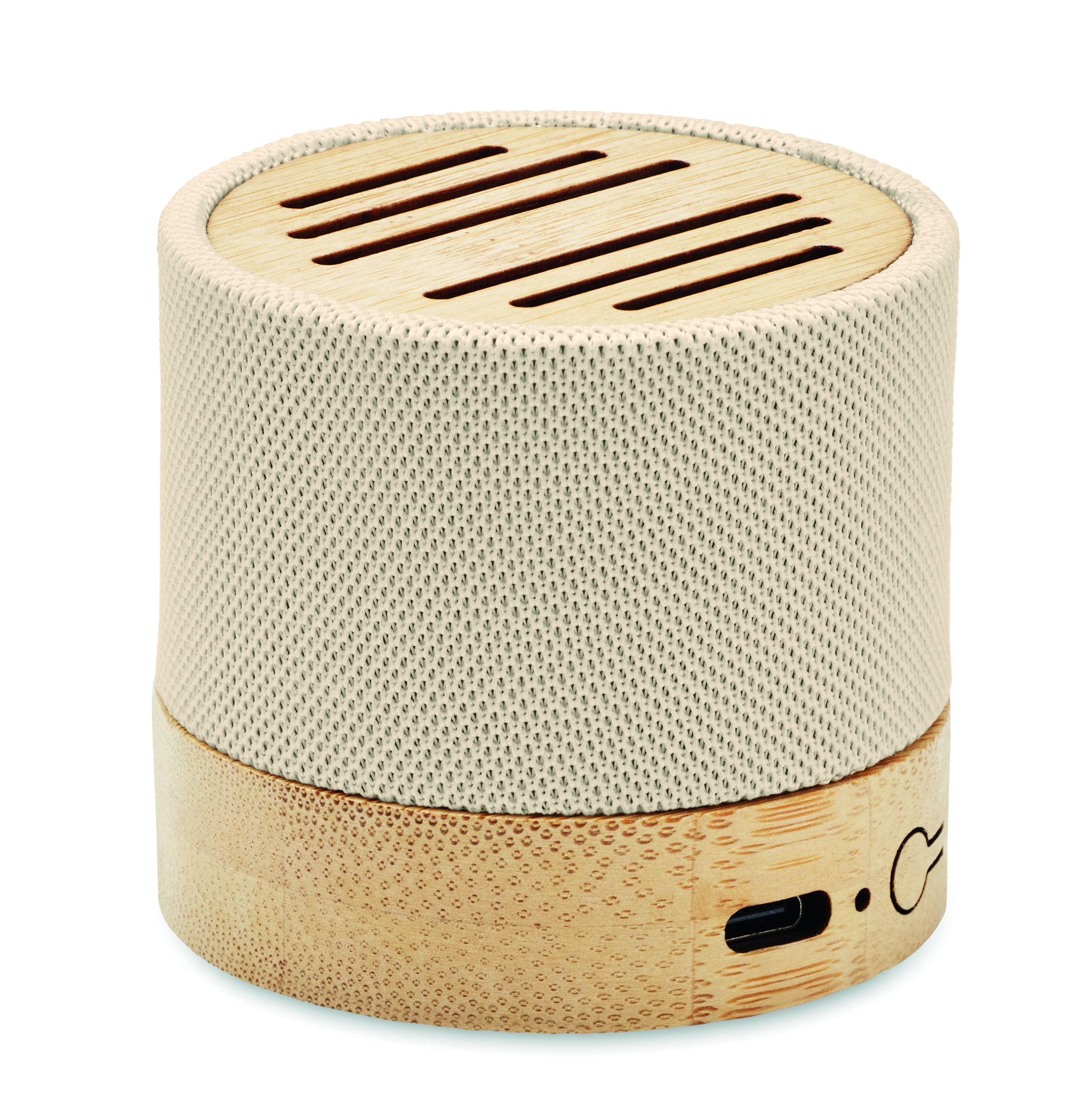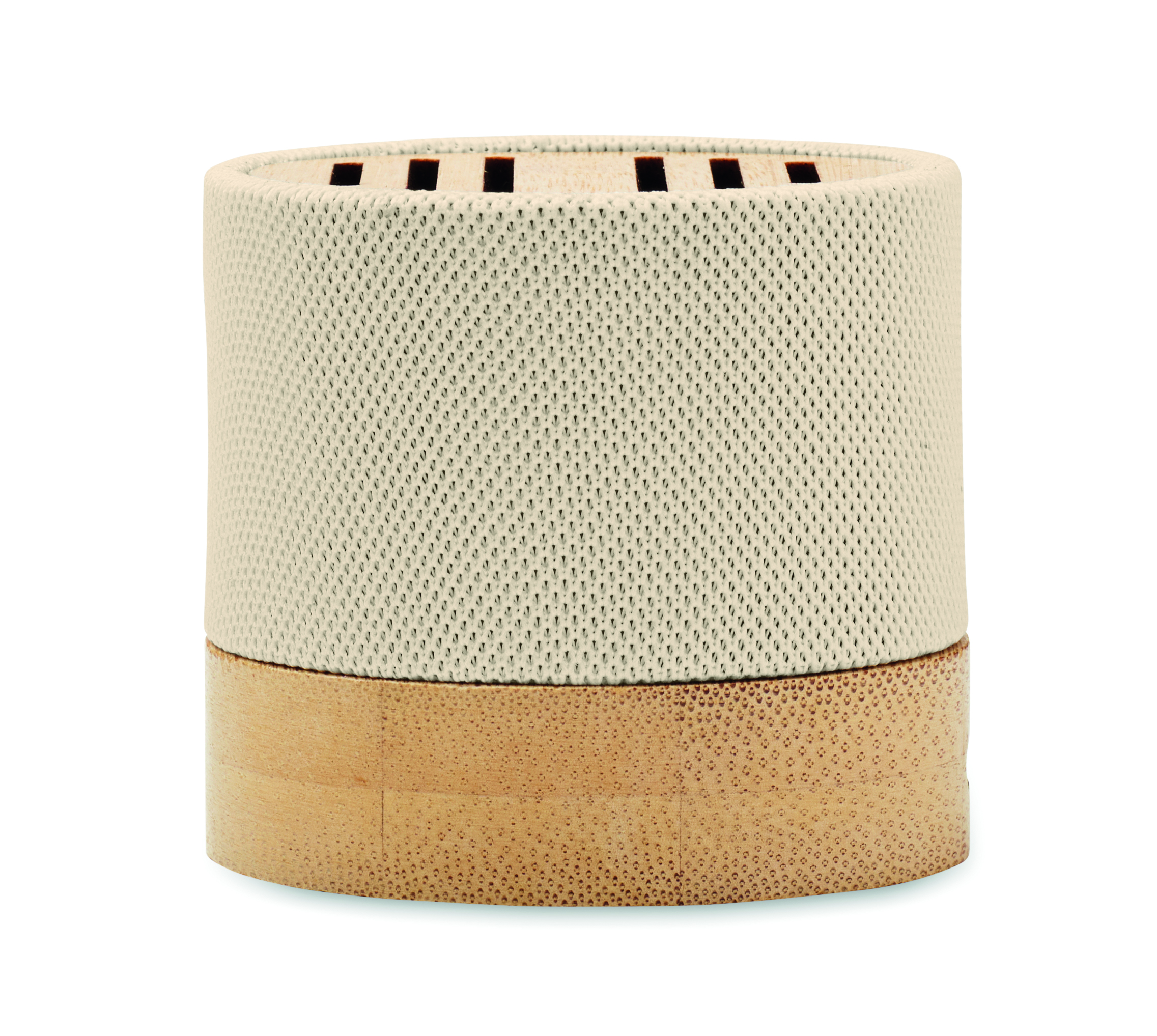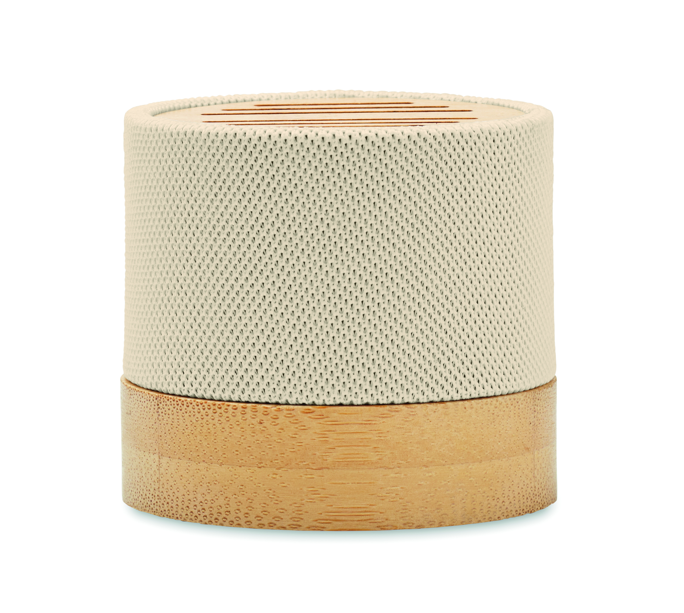 Głośnik bezprzewodowy 5.0 z RPET z bambusowym elementem. Sygnalizacja LED. 1 Akumulator Li-ION 300 mAh. Zawiera port kart SD oraz kabel AUX/USB. Wyjście: 3W, 3 Ohm i 5V. Czas odtwarzania ok. 3h. Bambus jest produktem naturalnym, dlatego mogą wystąpić nieznaczne różnice w kolorze, wzorze i rozmiarze.