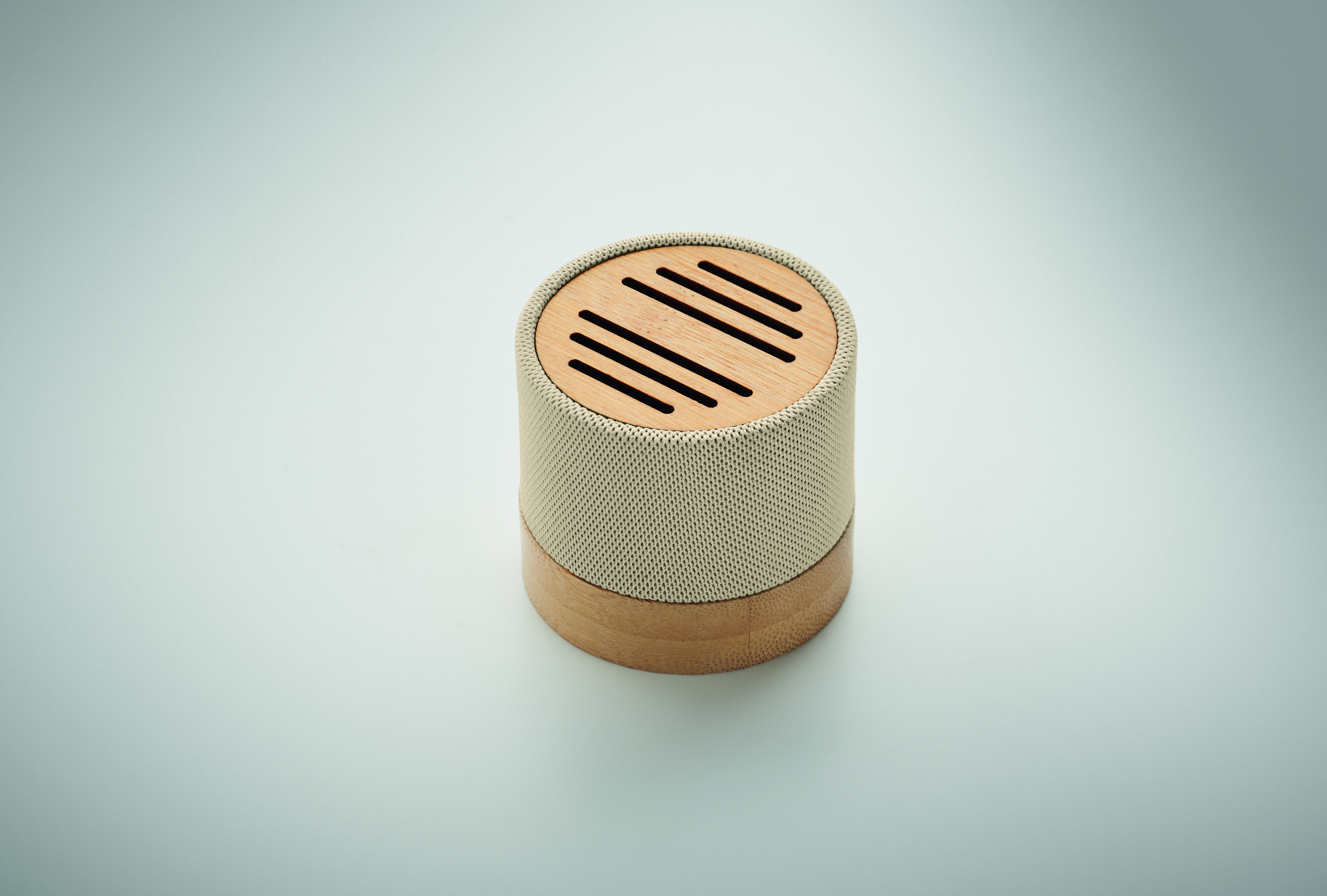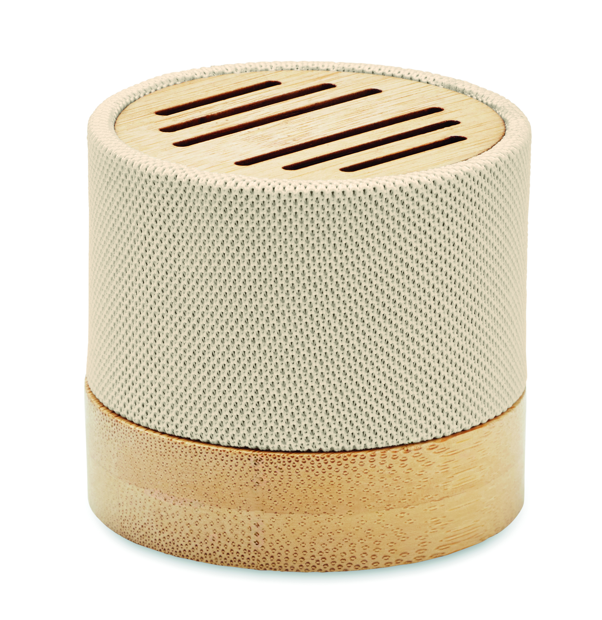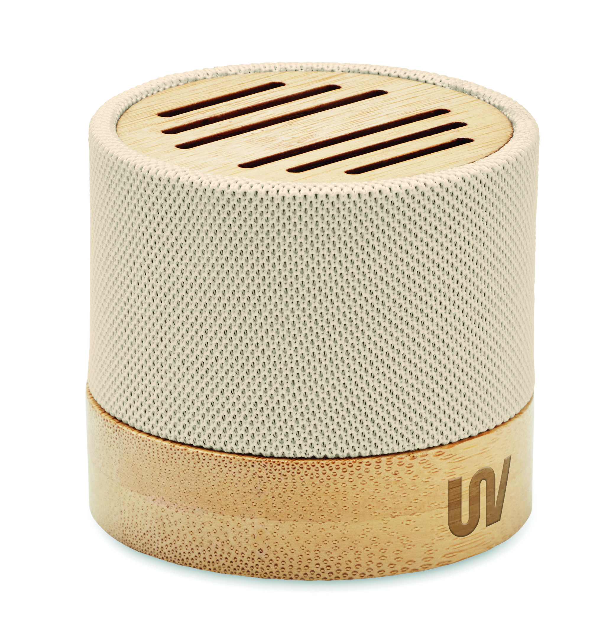 Głośnik bezprzewodowy 5.0 z RPET z bambusowym elementem. Sygnalizacja LED. 1 Akumulator Li-ION 300 mAh. Zawiera port kart SD oraz kabel AUX/USB. Wyjście: 3W, 3 Ohm i 5V. Czas odtwarzania ok. 3h. Bambus jest produktem naturalnym, dlatego mogą wystąpić nieznaczne różnice w kolorze, wzorze i rozmiarze.