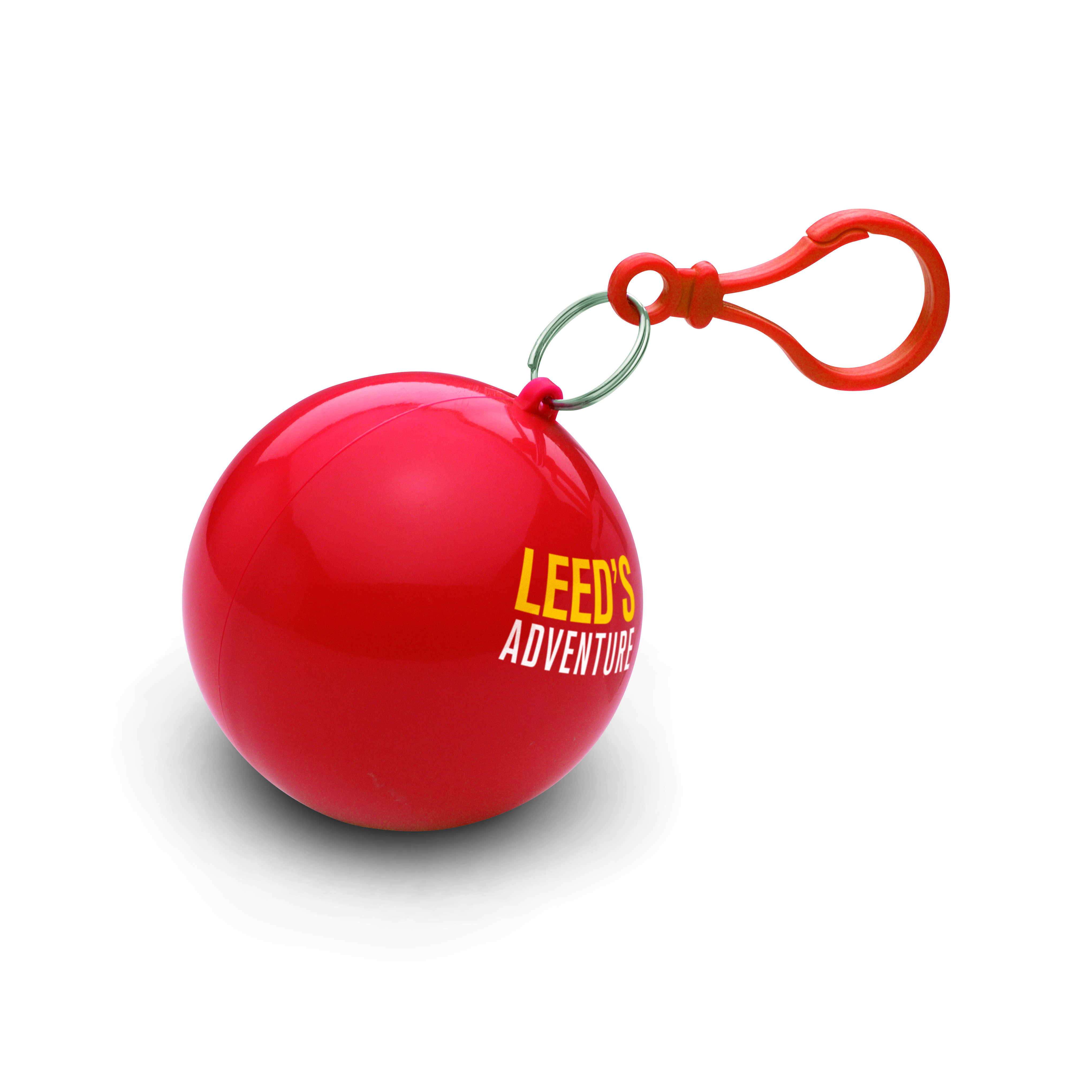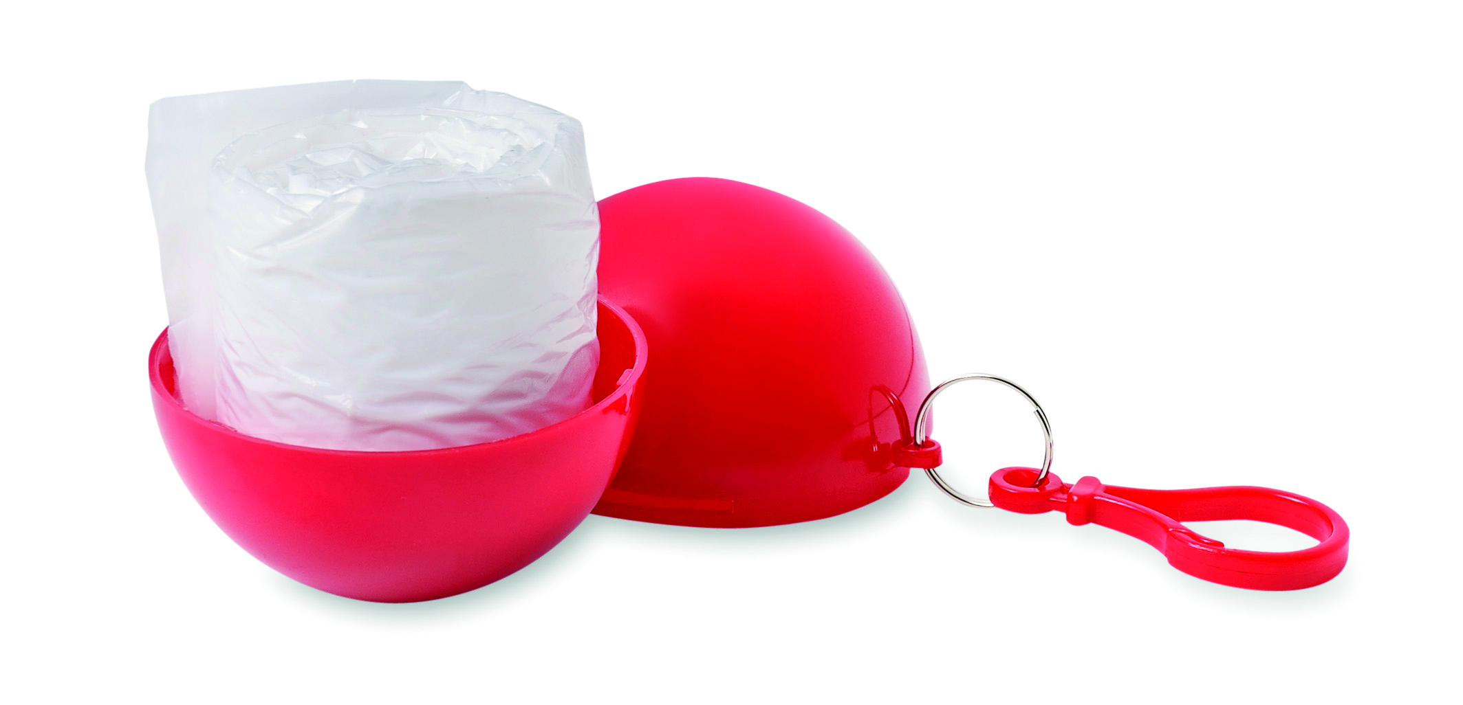 Przezroczyste ponczo przeciwdeszczowe z PE, zapakowane w okrągłe etui z AS z karabinkiem.