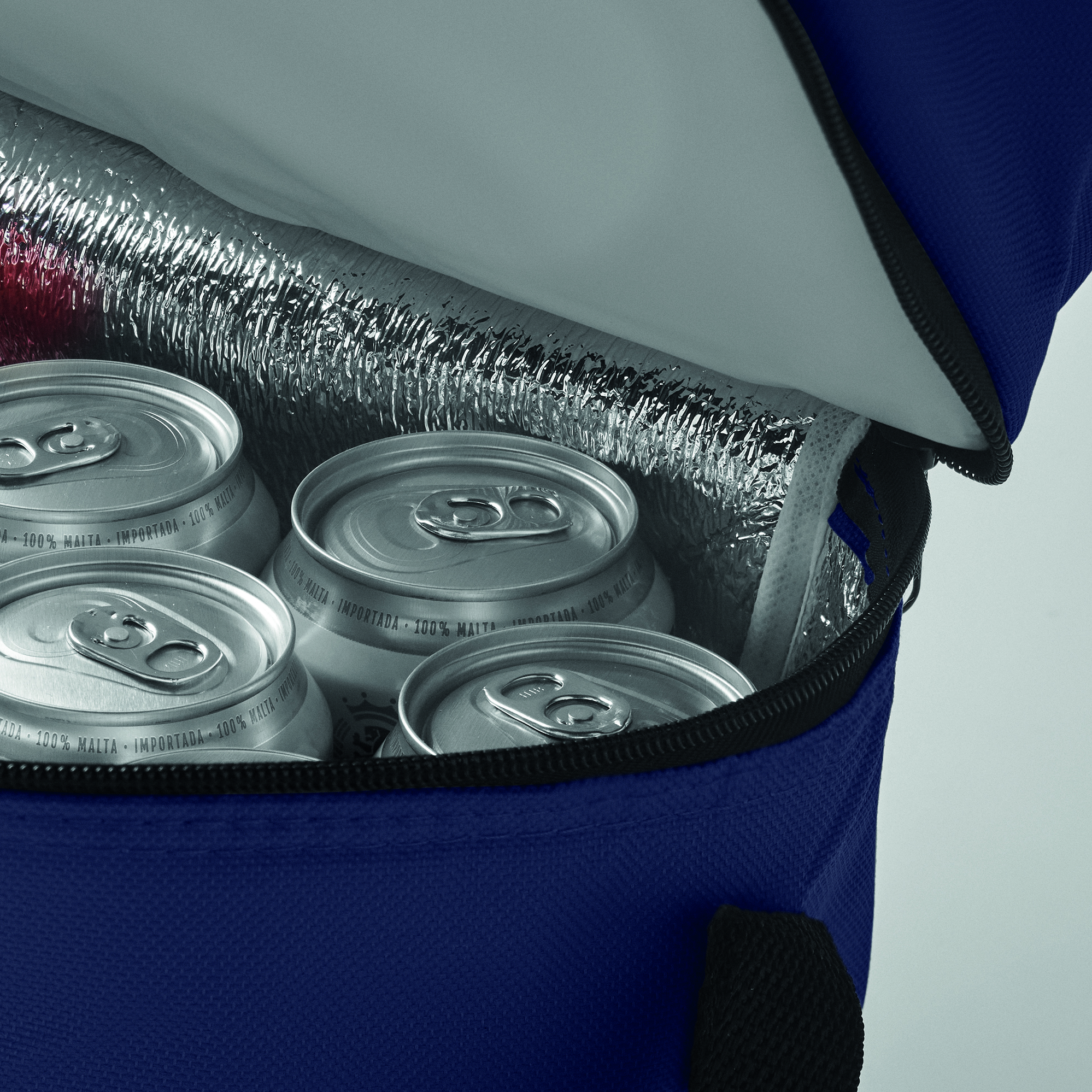 Torba termiczna 600D z 2 przegrodami wyściełanymi folią aluminiową. Posiada regulowany pasek na ramię.