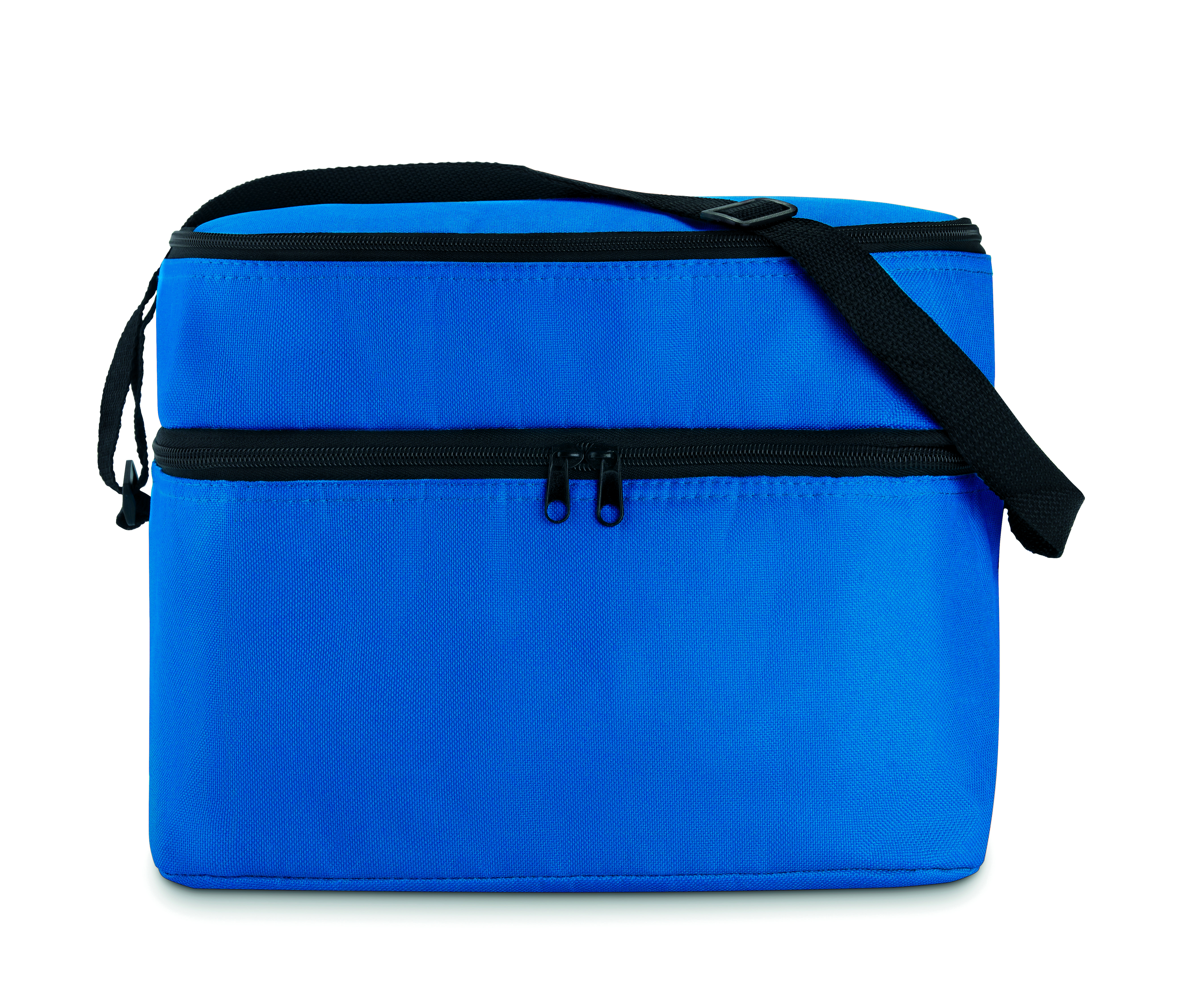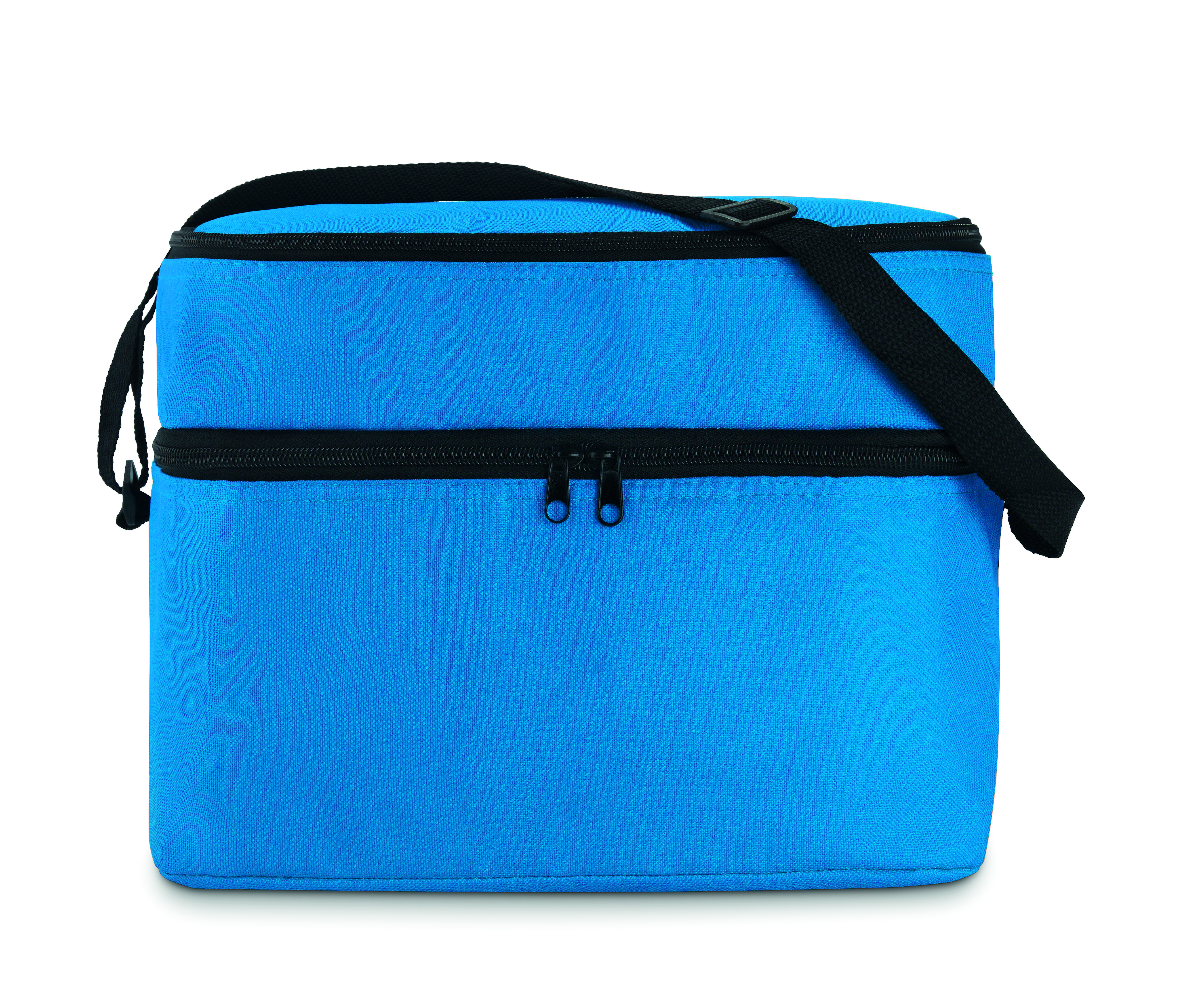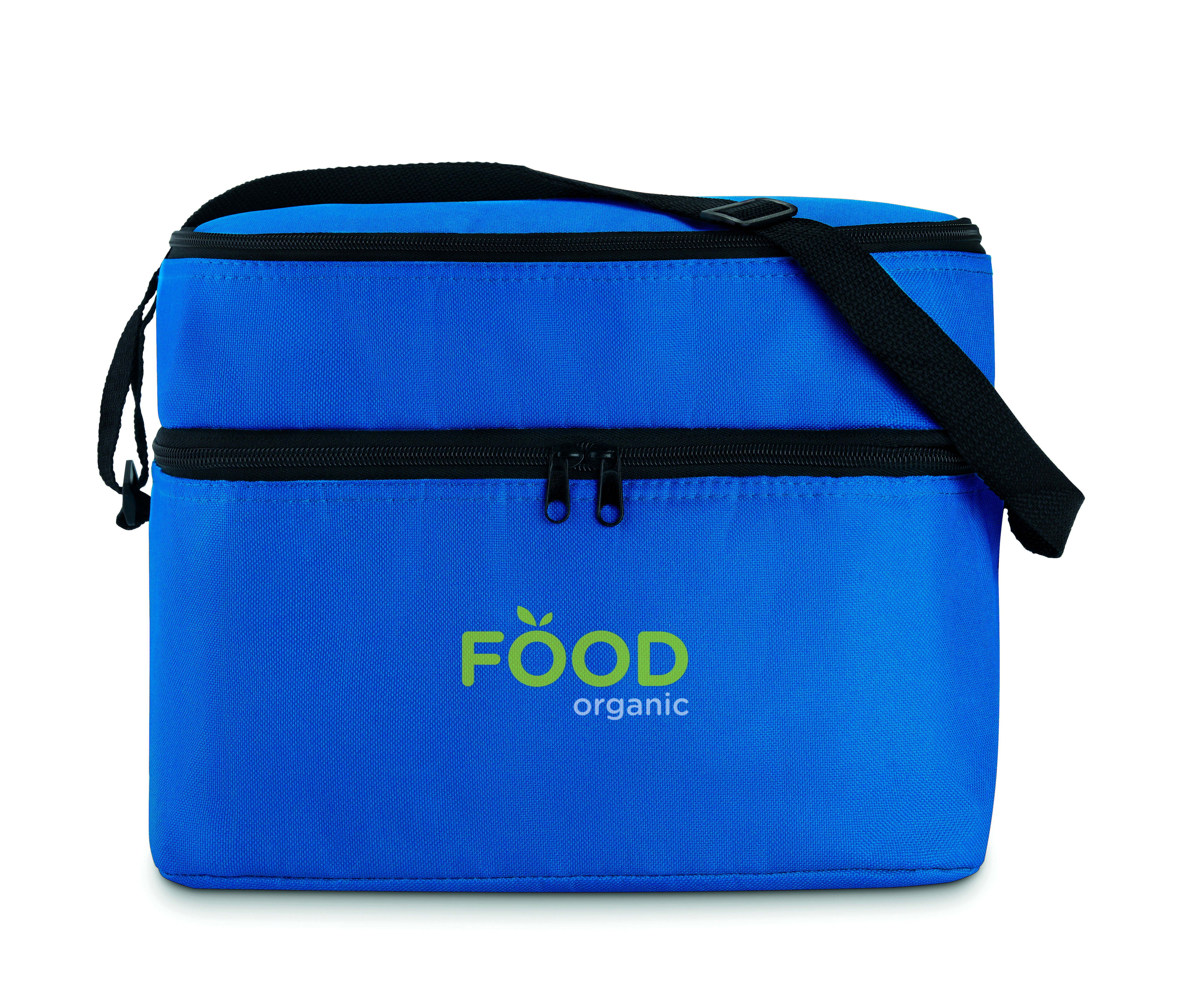 Torba termiczna 600D z 2 przegrodami wyściełanymi folią aluminiową. Posiada regulowany pasek na ramię.