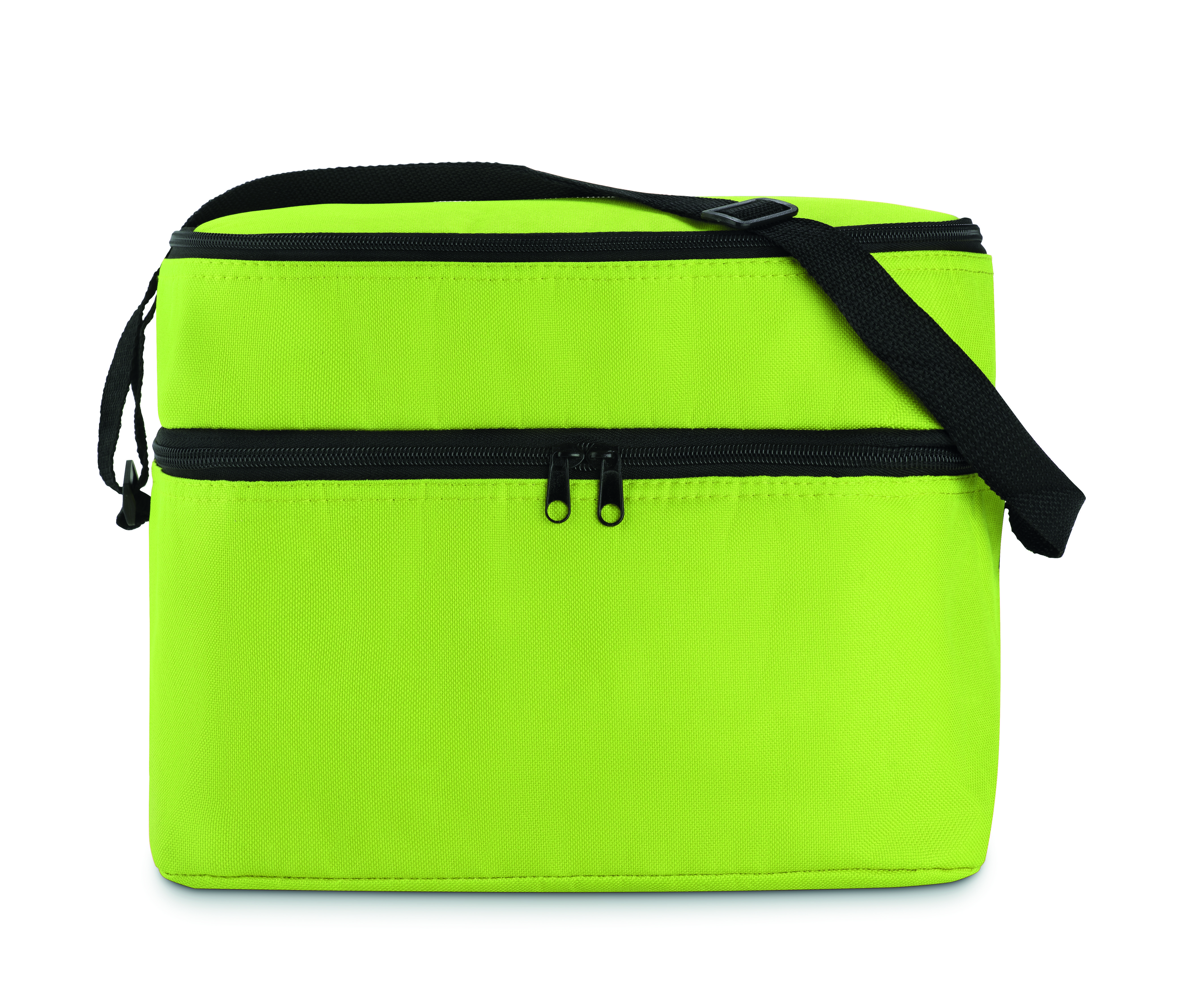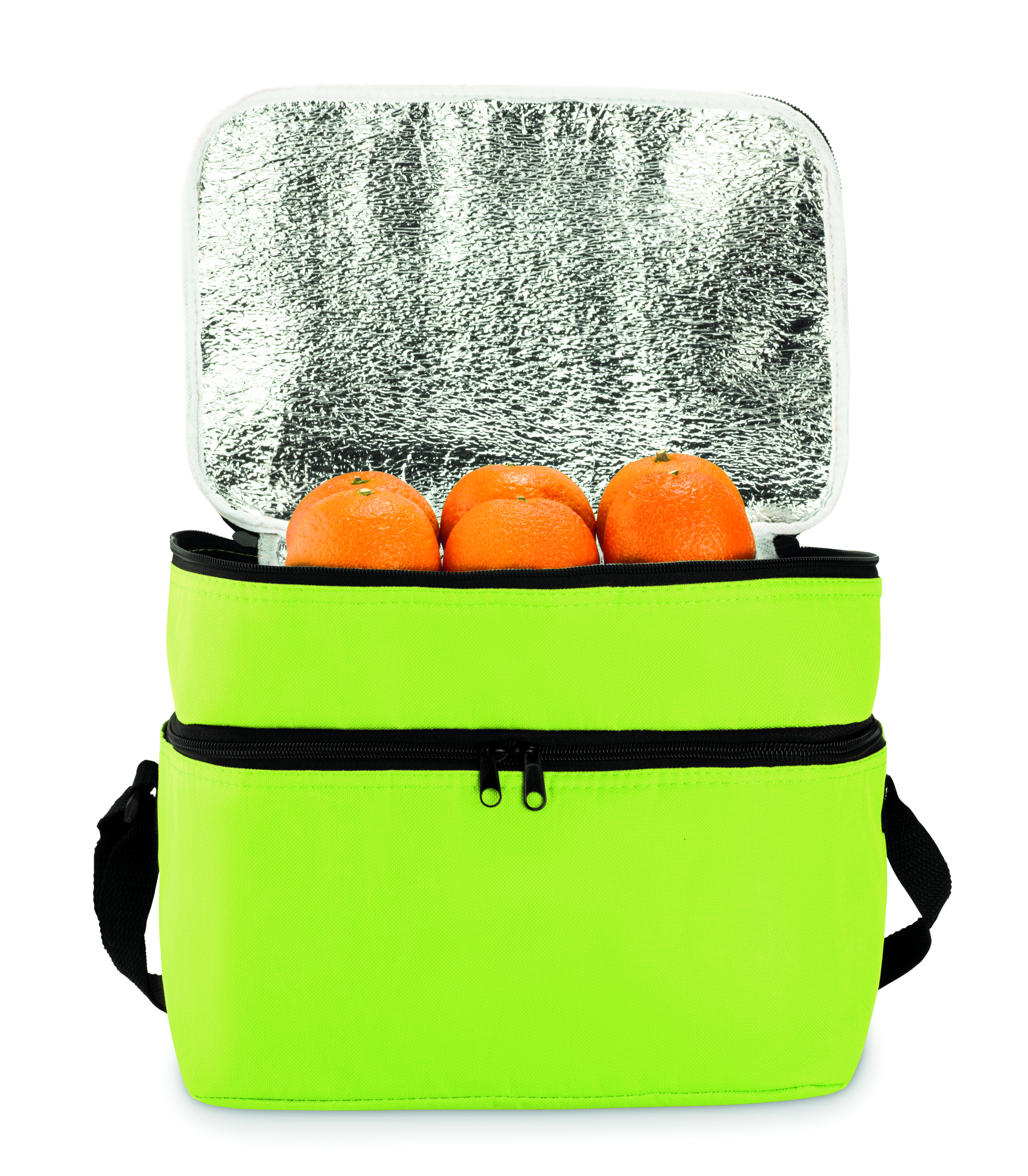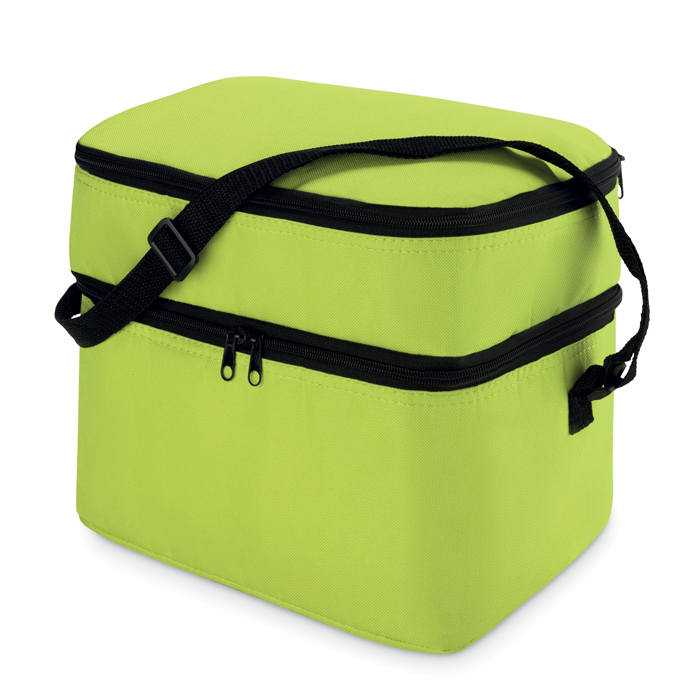 Torba termiczna 600D z 2 przegrodami wyściełanymi folią aluminiową. Posiada regulowany pasek na ramię.