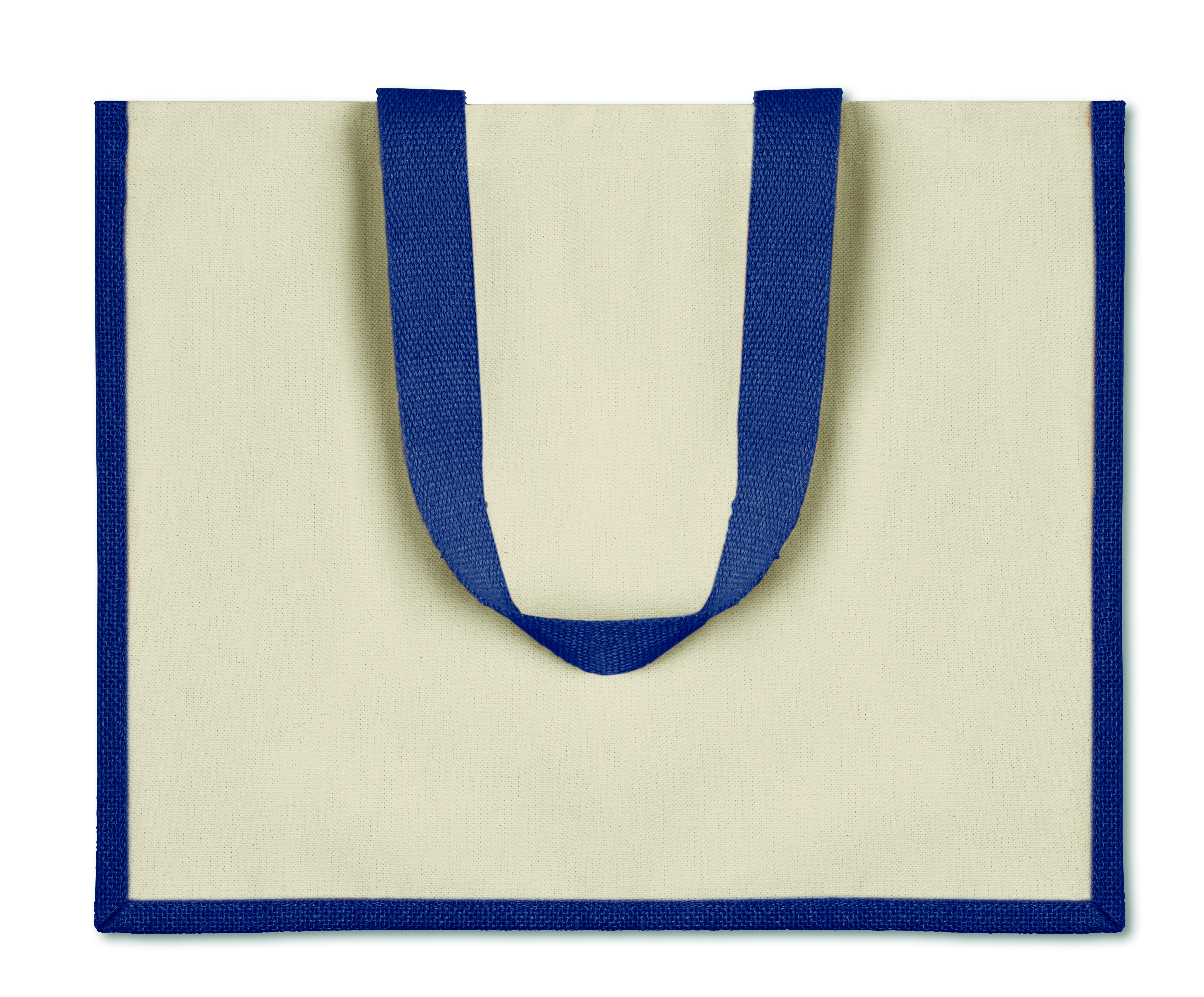 Jutowa torba na zakupy, wewnątrz laminowana, z zewnątrz płócienna. Posiada długie, bawełniane uchwyty.