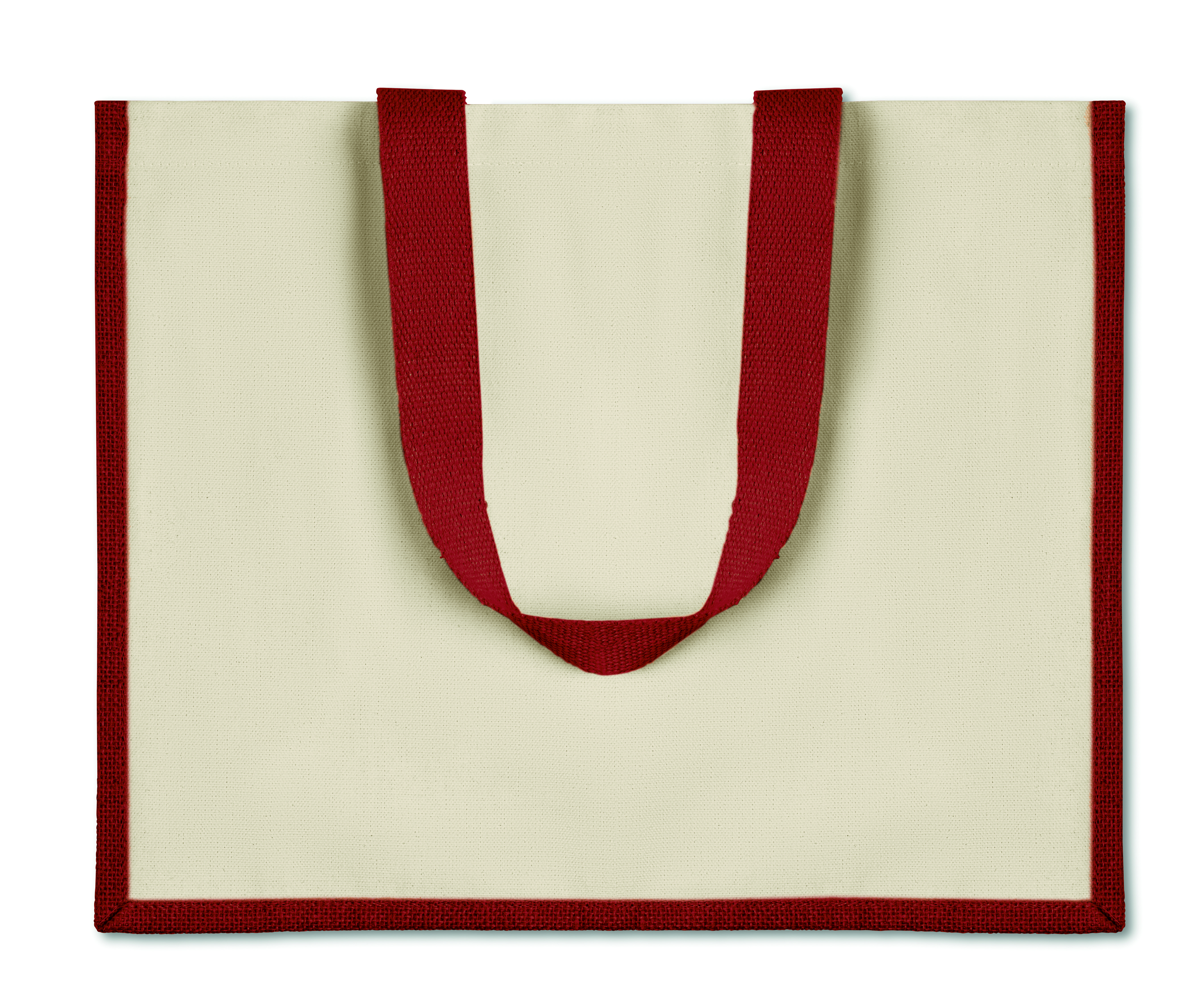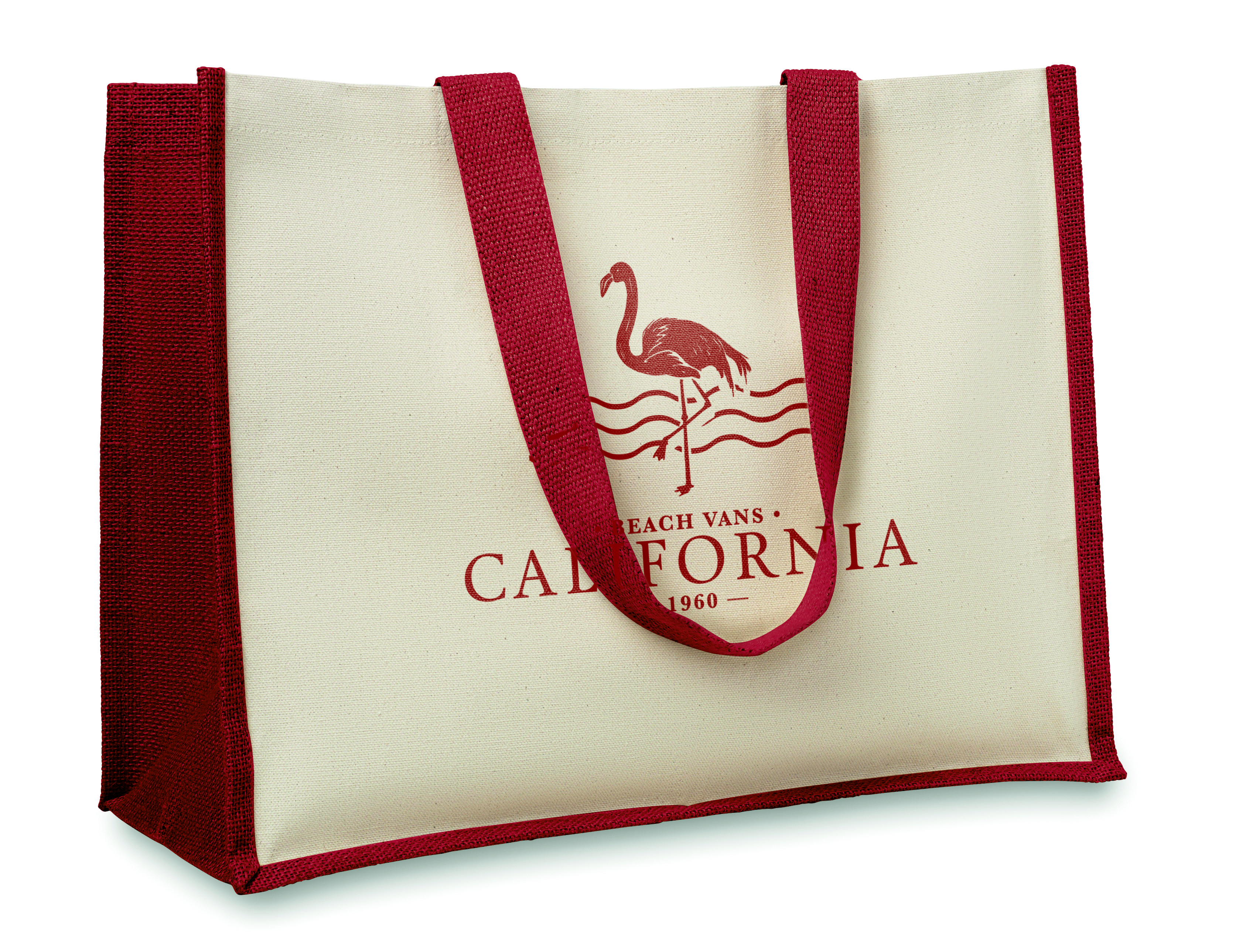 Jutowa torba na zakupy, wewnątrz laminowana, z zewnątrz płócienna. Posiada długie, bawełniane uchwyty.