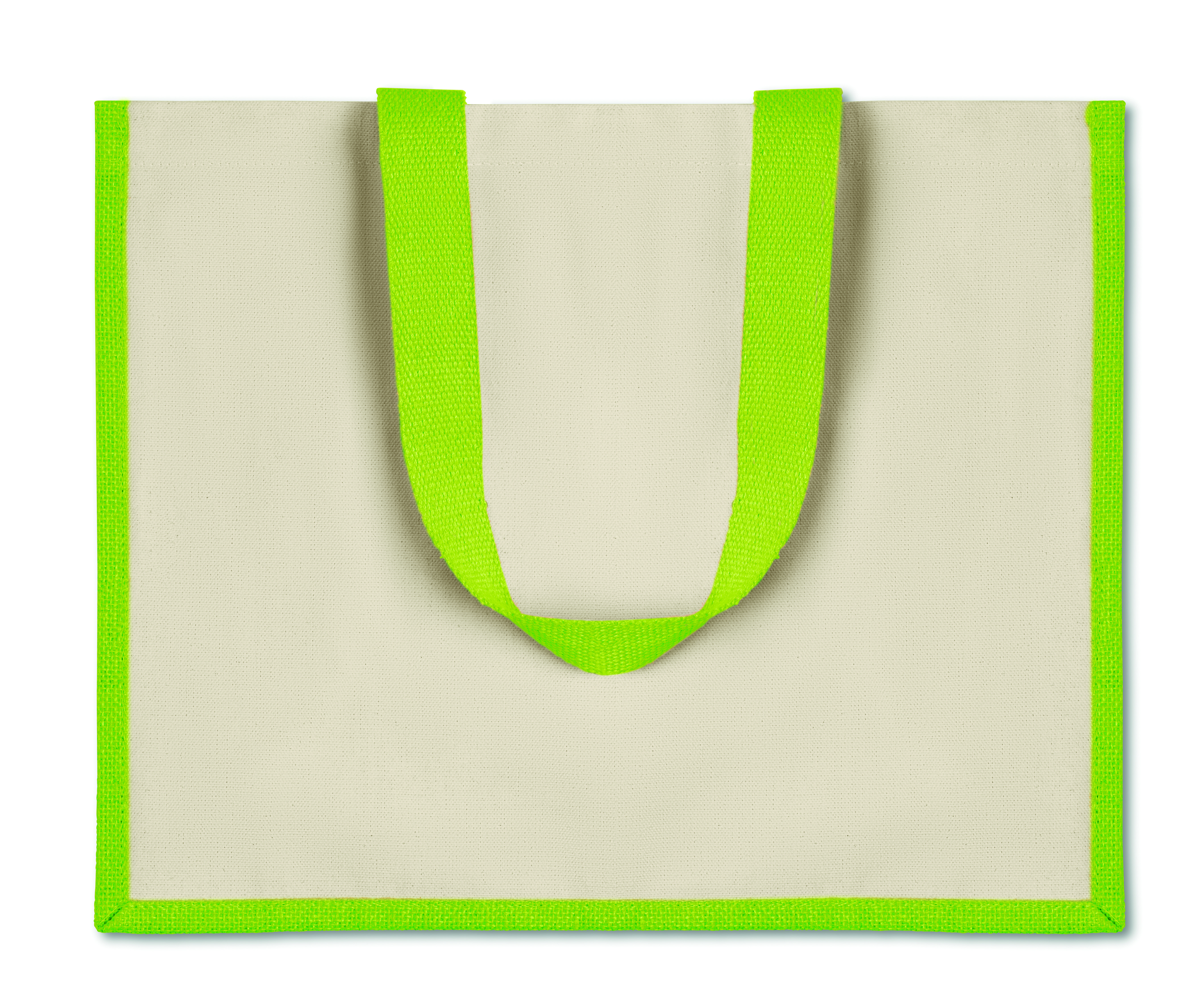 Jutowa torba na zakupy, wewnątrz laminowana, z zewnątrz płócienna. Posiada długie, bawełniane uchwyty.