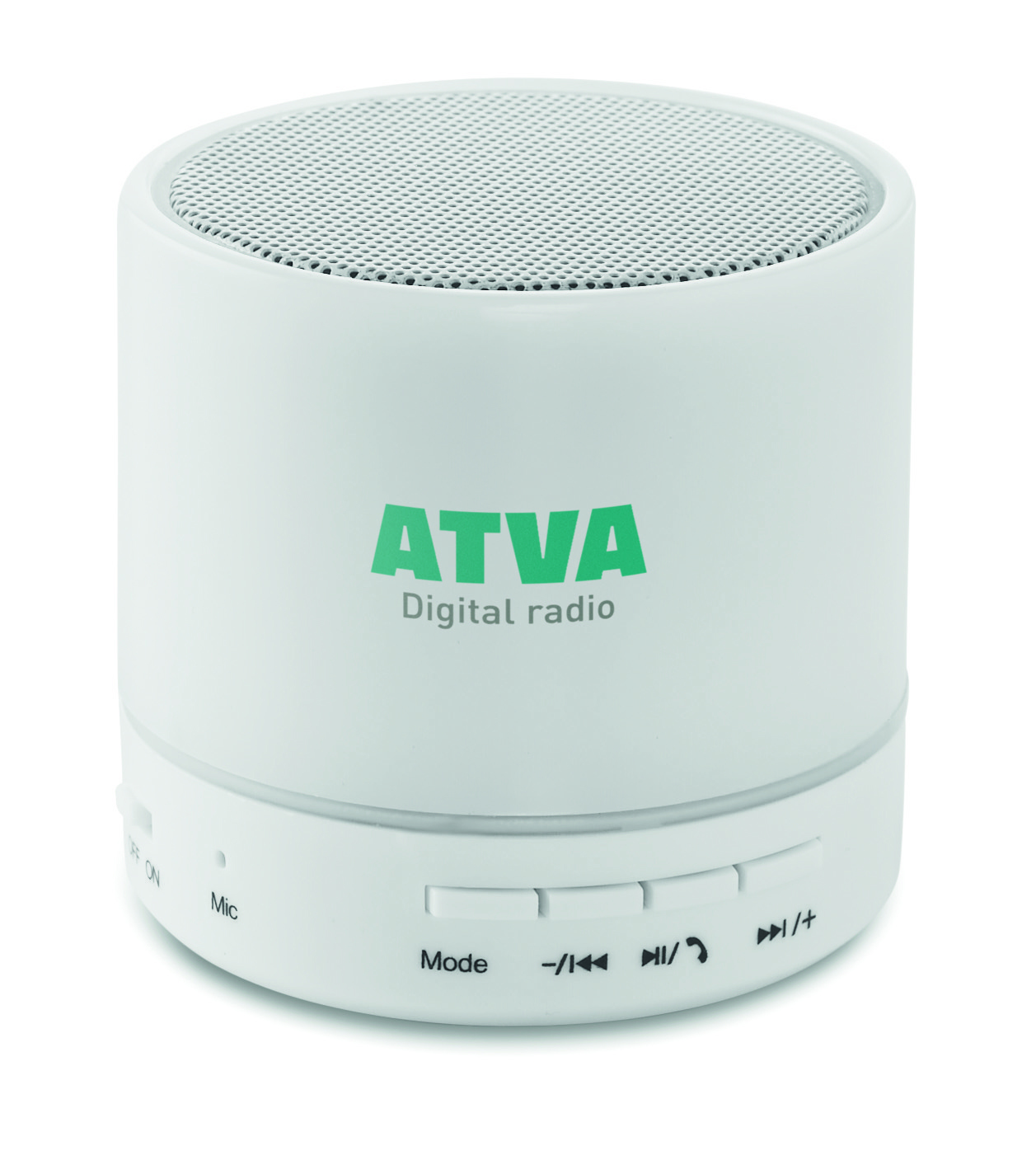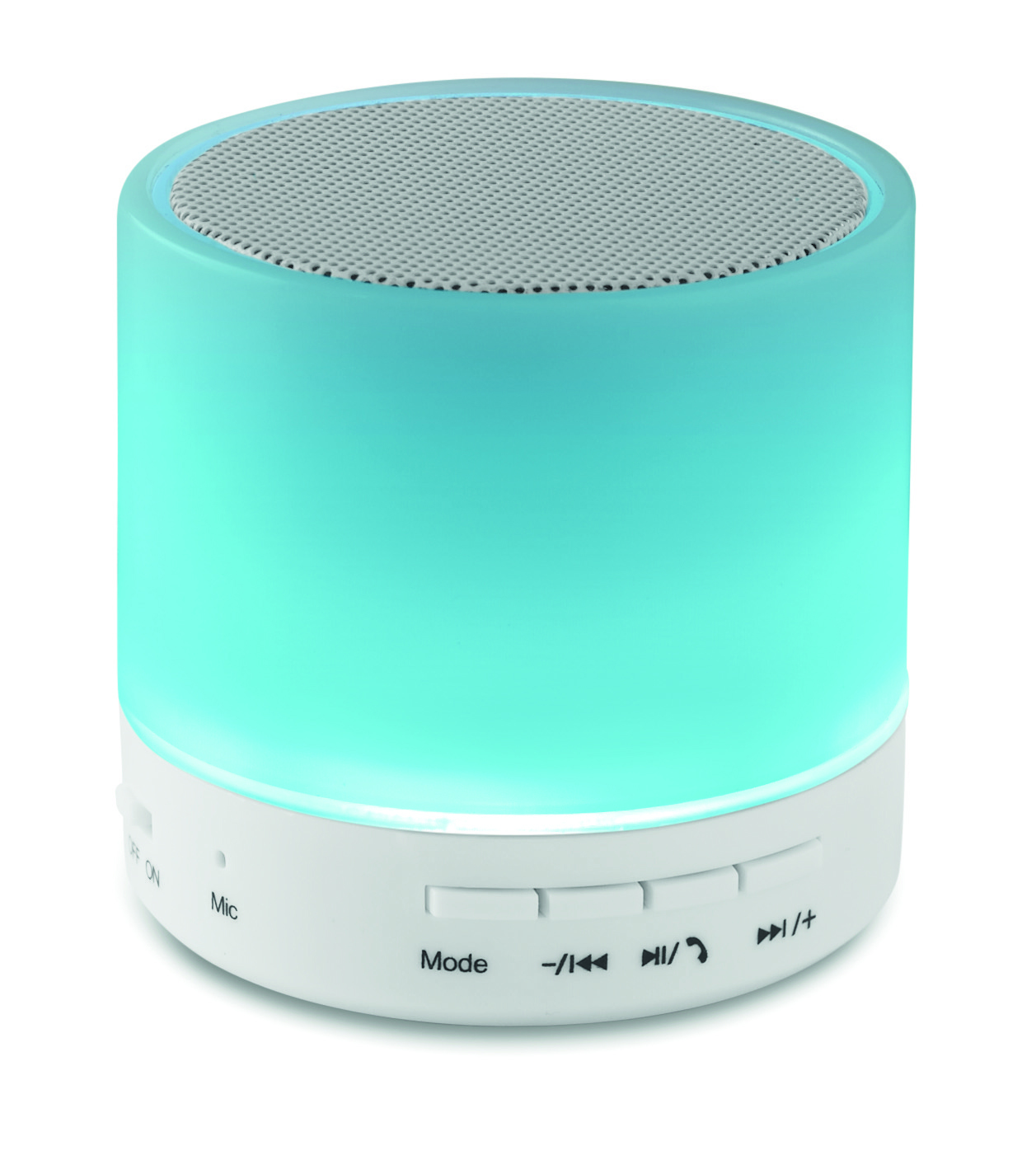 Bezprzewodowy głośnik 2.1 z ABS ze wskaźnikiem LED. 3 zmienne barwy światła. Dołączony 1 akumulator litowy 500 mAh. Zawiera port na karty SD i port do kabli AUX/ USB. Funkcja połączenia hands free. Wyjście: 3W, 4 Ohm. Czas odtwarzania ok. 2h.