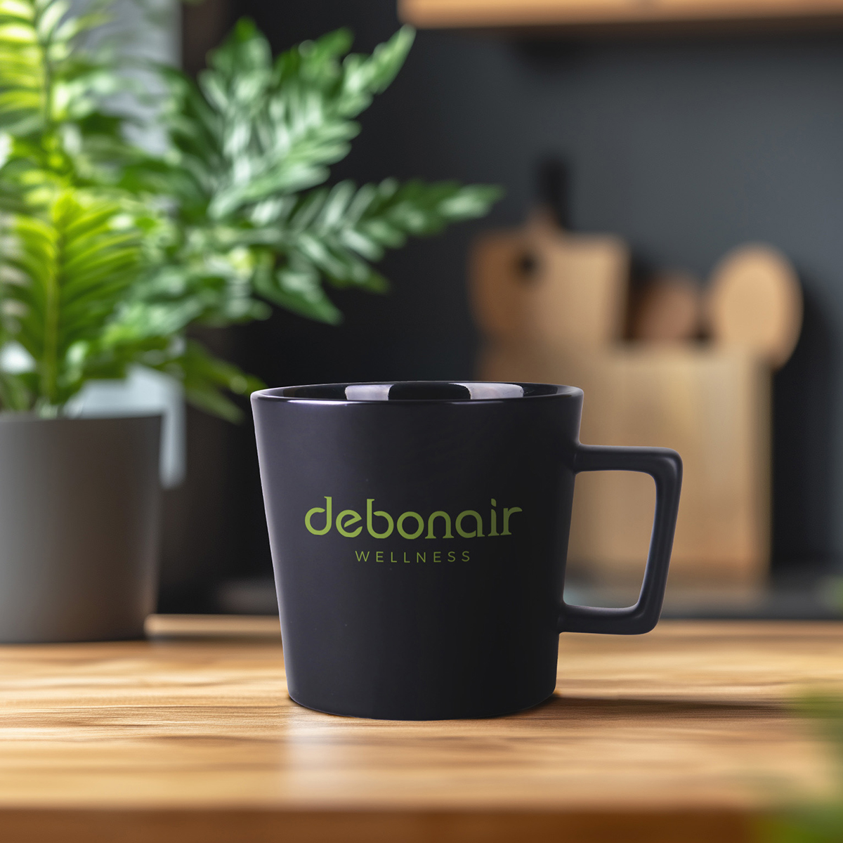 Nowoczesny kubek z czarną matową powierzchnią. Posiada ucho o ciekawym, designerskim kształcie. Posiada wnętrze w kilku kolorach.