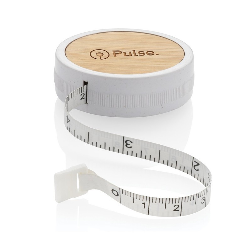 Miara do ciała 1,5 m/60”, taśma o szerokości 8 mm, przycisk stop, wykonana z ABS z recyklingu z certyfikatem RCS, włókna szklanego i bambusa z certyfikatem FSC®, całkowita zawartość materiałów z recyklingu obliczona w oparciu o wagę całkowitą przedmiotu: 64%, w pudełku z papieru kraftowego z certyfikatem FSC® mix, ślad węglowy produktu: 0,06 kg CO2