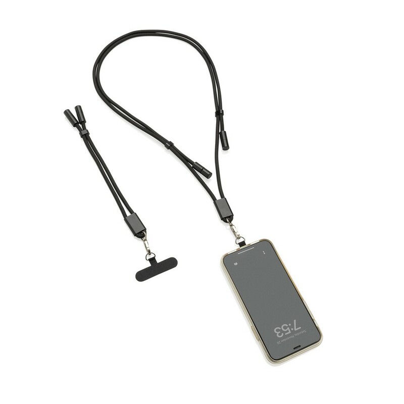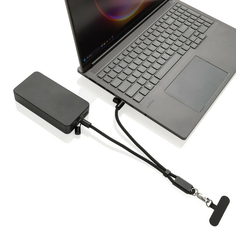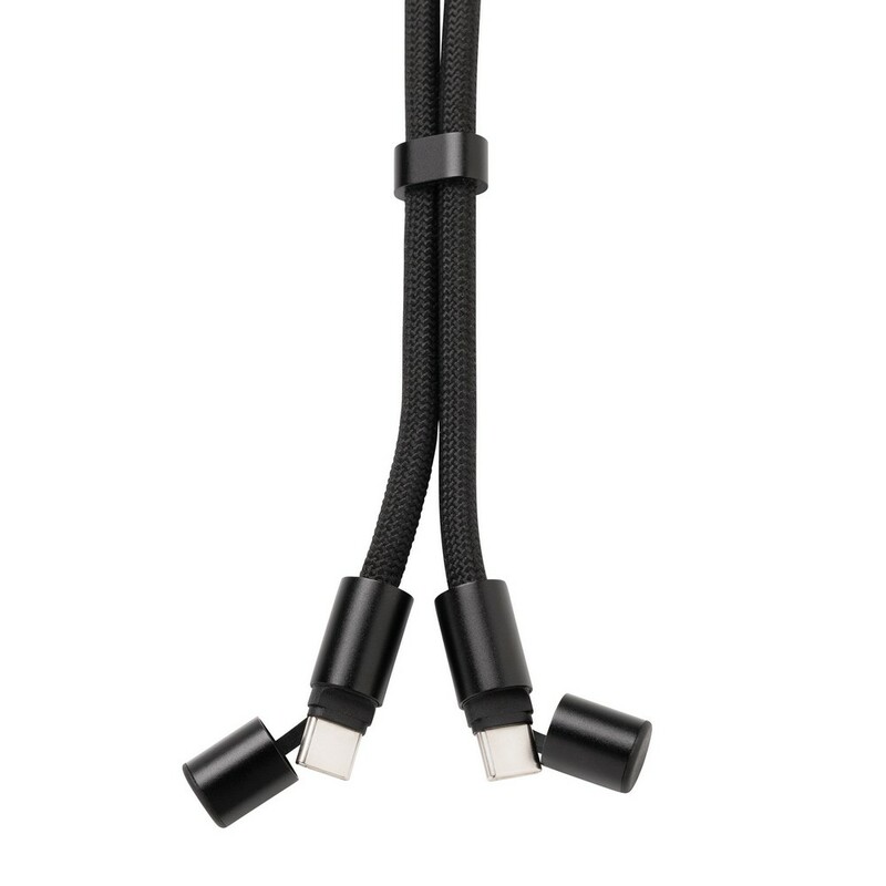 Kabel do ładowania i synchronizacji danych, uchwyt do telefonu, wykonany z RPET z certyfikatem RCS, moc całkowita ładowania do 60W, końcówki USB-C do USB-C, całkowita zawartość materiałów z recyklingu obliczona na podstawie wagi całkowitej przedmiotu: 78%