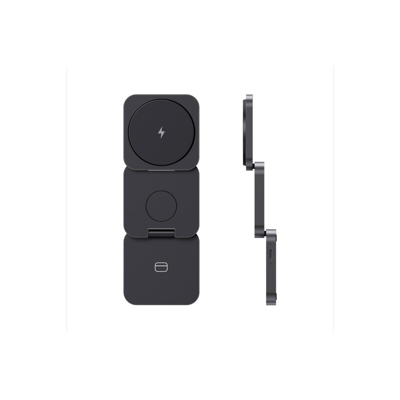 Ładowarka bezprzewodowa 3 w 1, składana, magnetyczna ładowarka bezprzewodowa 15W, ładowarka bezprzewodowa 5W do słuchawek i drobnych akcesoriów, ładowarka bezprzewodowa 2,5W do smartwatchy (tylko iOS), wykonana z PU z recyklingu, działa z telefonami posiadającymi możliwość ładowania indukcyjnego, wejście 9V/3A, wyjście dla telefonu 9 V/1.1 A, 9 V/1.67 A, 15 W, wyjście dla słuchawek 5V/1A, 5W, wyjście smartwatcha 5V/0.5A, kabel 120 cm z TPE z recyklingu w komplecie, w pudełku z certyfikatem FSC® mix