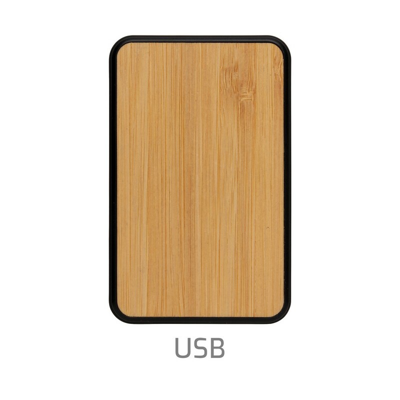 Power bank 5000 mAh, wykonany z ABS z recyklingu z certyfikatem RCS i bambusa z certyfikatem FSC®, całkowita zawartość materiałów z recyklingu: 20%, obliczona na podstawie masy całkowitej przedmiotu, wbudowany akumulator litowo polimerowy o wysokiej gęstości, wejście USB typu C 5V/2A, wejście micro USB 5V/2A, wyjście 5V/2A, w komplecie kabel z TPE z recyklingu z certyfikatem RCS®, ślad węglowy produktu: 1,94 kg CO2