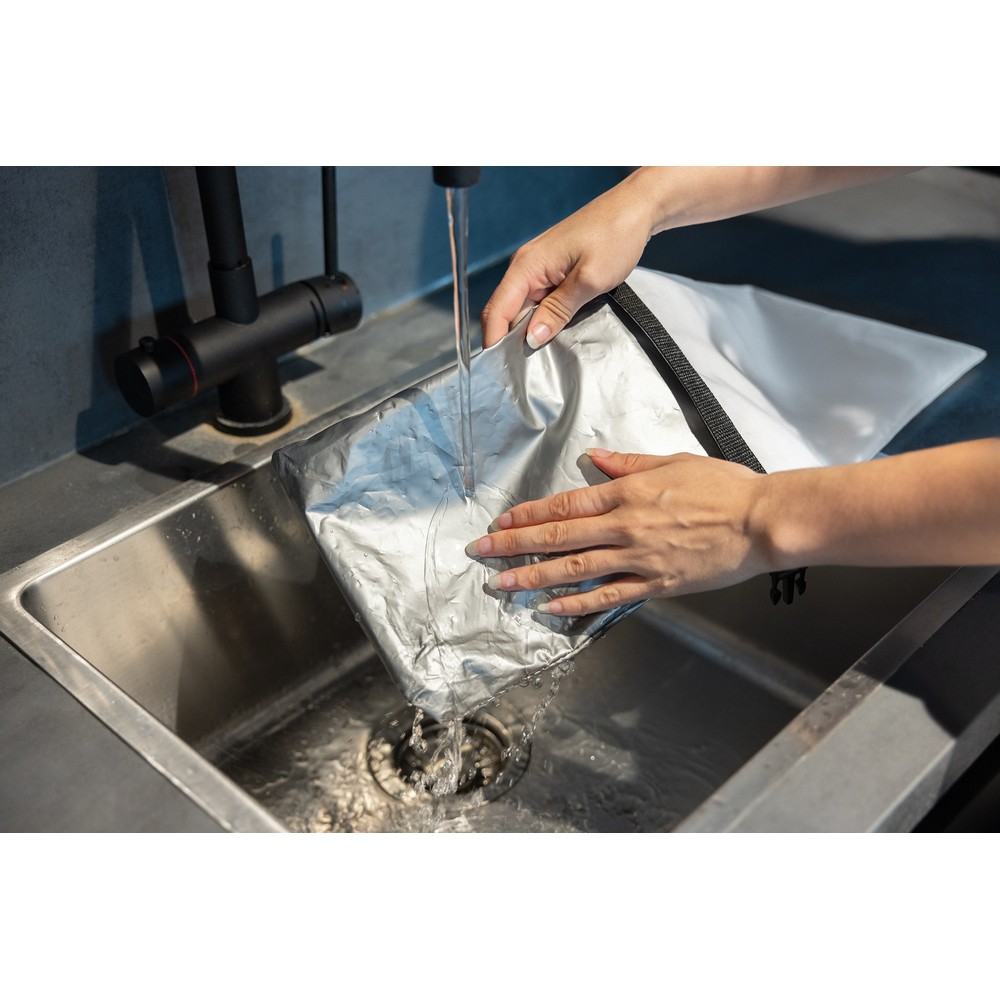 Torba termoizolacyjna, zwijana konstrukcja, regulowany rozmiar, szczelne zamknięcie, dzięki zastosowaniu technologii AWARE™ wykorzystane włókna są identyfikowalne z pochodzenia oraz wyprodukowane zgodnie z ideą zrównoważonego rozwoju, 2% wpływów z każdego sprzedanego produktu z AWARE™ jest przekazywane na rzecz Water.org