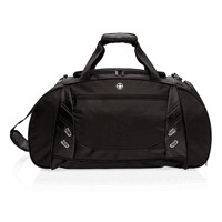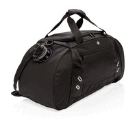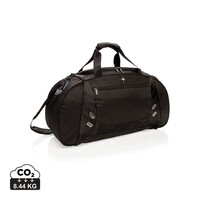 Torba sportowa, podróżna, wykonana z poliestrów 600D i 1680D, pojemna główna przegroda z zamknięciem w kształcie litery U na górze, boczna kieszeń na buty z otworami wentylacyjnymi, przednia kieszeń na zamek błyskawiczny na drobne akcesoria, podwójne uchwyty, regulowany pasek na ramię, nie zawiera PVC, ślad węglowy produktu: 8,44 kg CO2