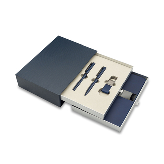 Zestaw składający się z notesu A5 (80 kartek w linie, 80 g/m2) długopisu i pióra kulkowego (niebieski wkład) oraz breloka. Zestaw zapakowany w eleganckie pudełko z szufladkami.