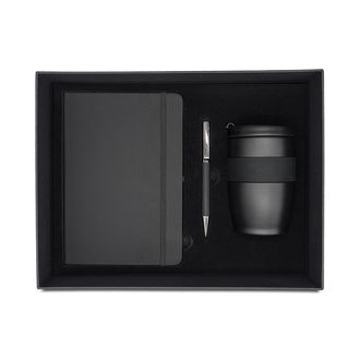 Zestaw upominkowy zawierający notes A5, 80-kartkowy w kratkę 4mm (papier 70 g/m²) w twardej oprawie PU, metalowy długopis, w dopasowanym wykończeniu (wkład w kolorze niebieskim) oraz próżniowy kubek z podwójnymi ściankami ze stali nierdzewnej 18/8 wewnątrz i silikonową opaską. Pojemność 300 ml. Utrzymuje temperaturę powyżej 40°C do 5 godzin.