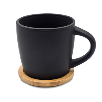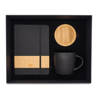 Elegancki zestaw upominkowy zawiera: kubek ceramiczny o pojemności 320 ml, z czarnym matowym wykończeniem oraz bambusową przykrywką/podstawką. Notes 80-kartkowy w kratkę 4mm, z miejscem na wpisanie daty (papier 70 g/m²) w twardej oprawie z elastyczną gumką chroniącą wnętrze, tasiemką indeksującą i ozdobiony bambusowym akcentem. Całość zapakowana jest w eleganckie pudełko prezentowe.