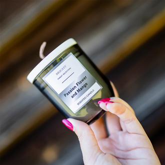 Świeczka zapachowa w szkle, zamykana drewnianym wieczkiem. Świeczka o orzeźwiającym zapachu kwiatów i mango. Czas palenia około 24 godzin. Waga wosku 140 g.