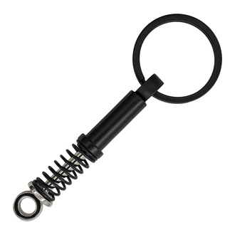 Brelok w kształcie amortyzatora. Wykonany z metalu w kolorze czarnym z widoczną, sprężynową konstrukcją. Pakowany w czarne opakowanie upominkowe.