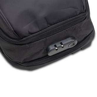 Plecak z przegrodą na laptop 15" zabezpieczoną specjalnym zamknięciem z indywidualnym kodem. Na zewnątrz przednia kieszeń zamykana na zamek, a z boku gniazdo USB, dzięki któremu można podpiąć swój smartfon do powerbanka. Wewnętrzny kabel USB w zestawie. Miękkie wygodne plecy i szelki pokryte są siateczką. Plecak posiada pasek na uchwyt walizki. Plecak uniemożliwia dostęp do niego osobom trzecim.