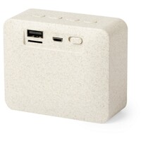 Głośnik bezprzewodowy BT 5.0 3W z włókien słomy pszenicznej, posiada czytnik kart micro SD (nie dołączona), gniazdo USB, bateria 300 mAh, zasięg do 10 m, ładowany przez USB, kabel micro USB w komplecie