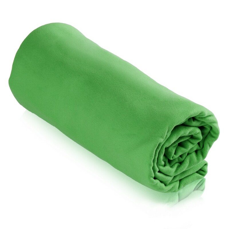 Ręcznik w czarnym, siateczkowym pokrowcu zamykanym na sznurek z klipem, produkt wykonany z mikrofibry o gramaturze 200 g/m2