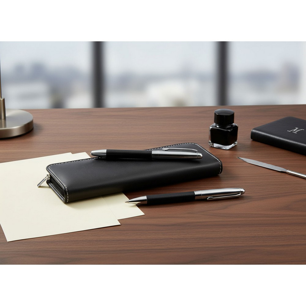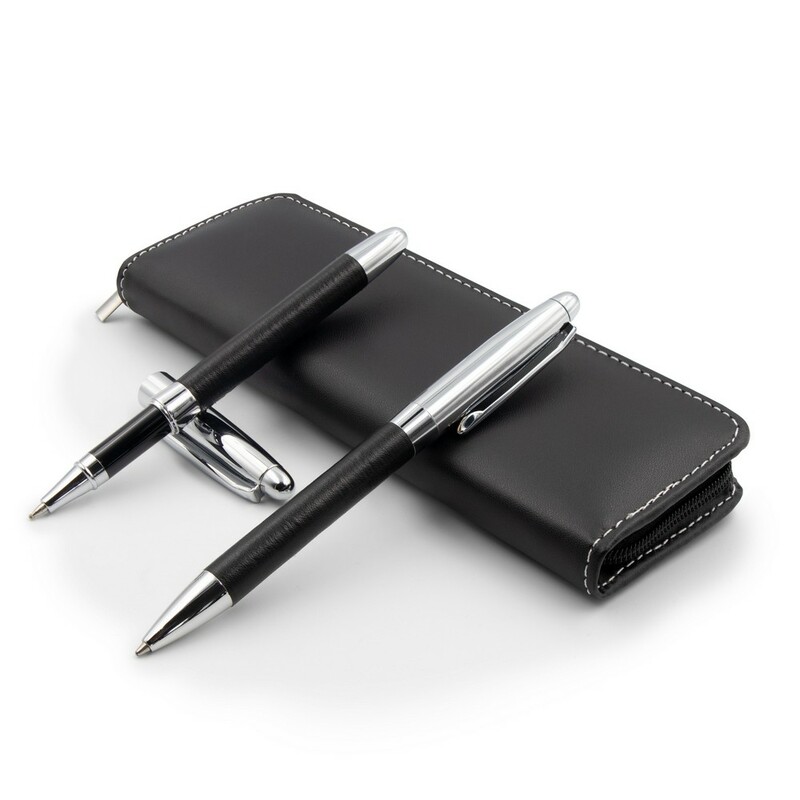 Zestaw piśmienniczy w etui zapinanym na zamek błyskawiczny, zawiera długopis i pióro kulkowe
