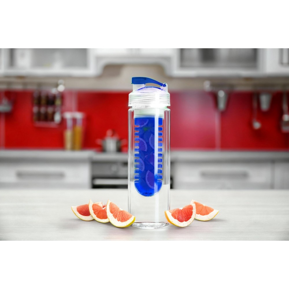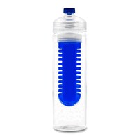 Butelka sportowa 650 ml, posiada pojemnik na lód lub owoce umożliwiający nadanie wodzie smaku według własnych preferencji, zakrętka z kolorowym zamknięciem, butelka przeznaczona wyłącznie do zimnych i niegazowanych napojów, produkt wykonany z plastiku